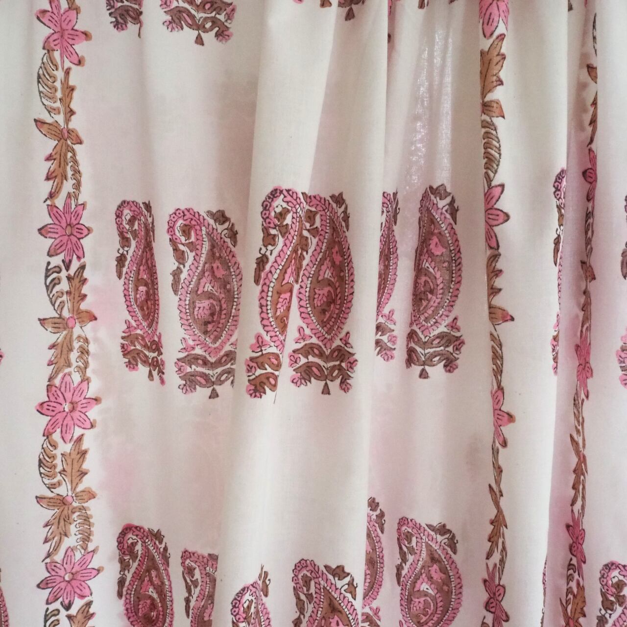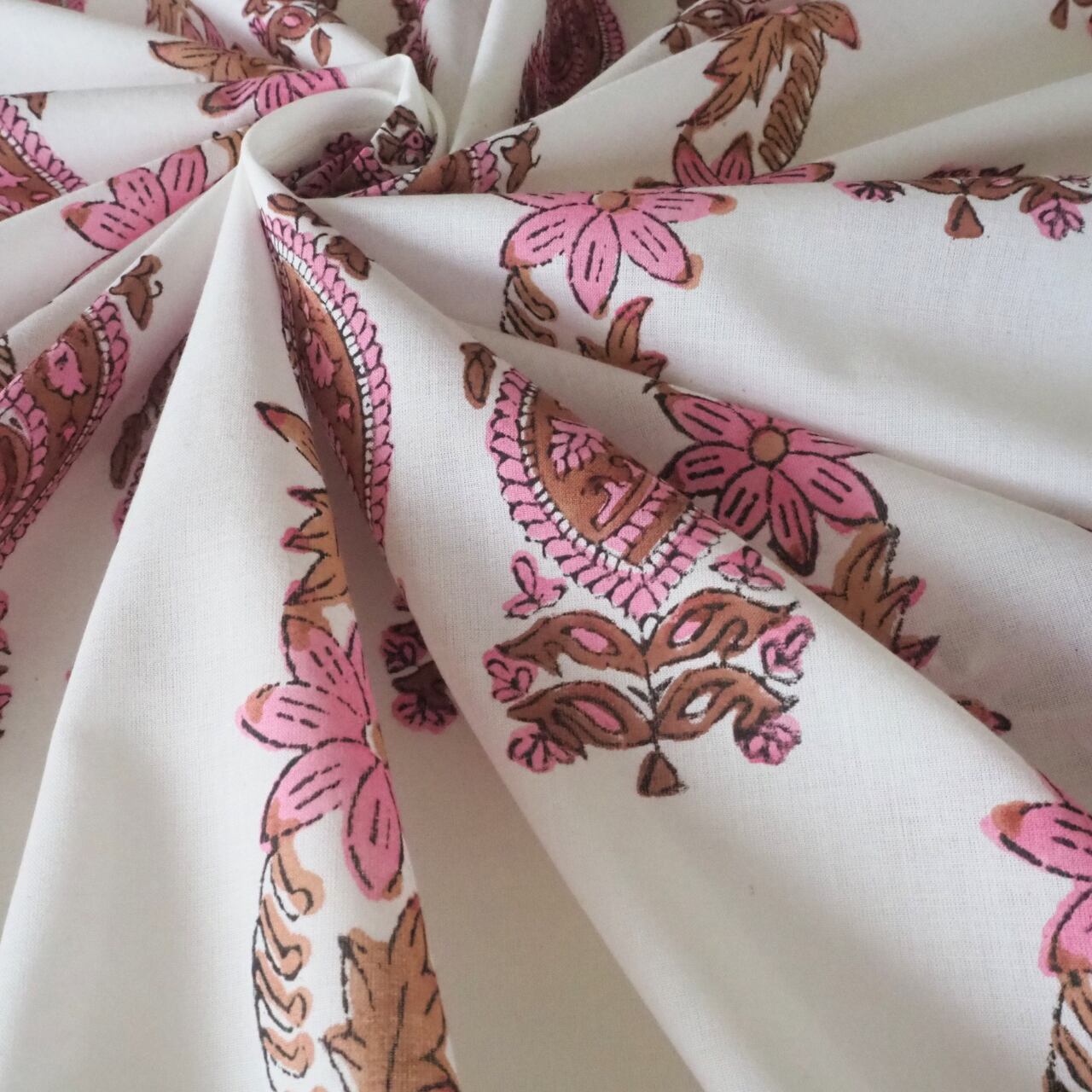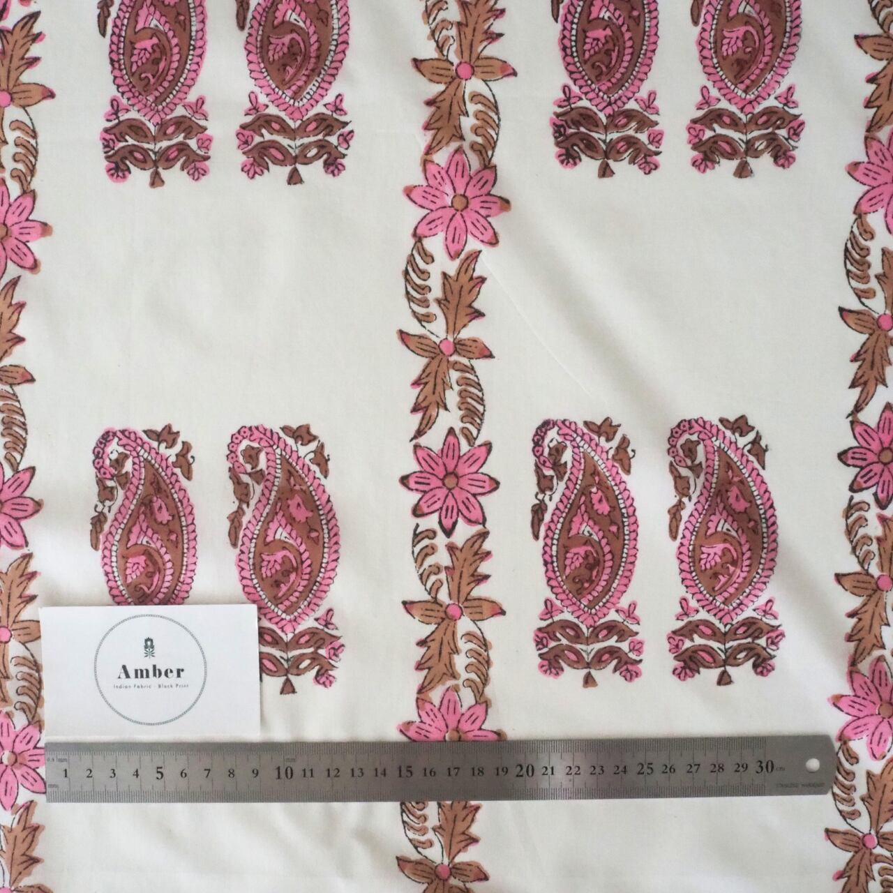 ブロックプリント生地【50cm単位】インド綿 ペイズリー・花柄 白×ピンク×ブラウン #44189-WT3