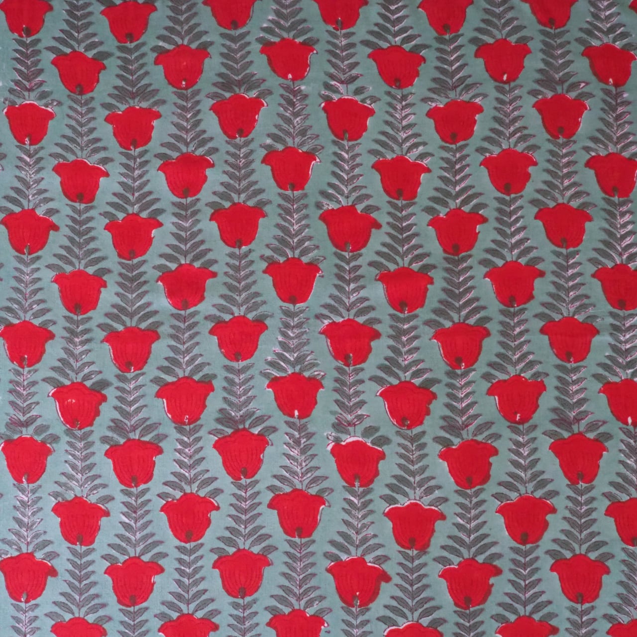ブロックプリント生地【50cm単位】インド綿 花柄A くすみグリーン×赤 #44290-GR1