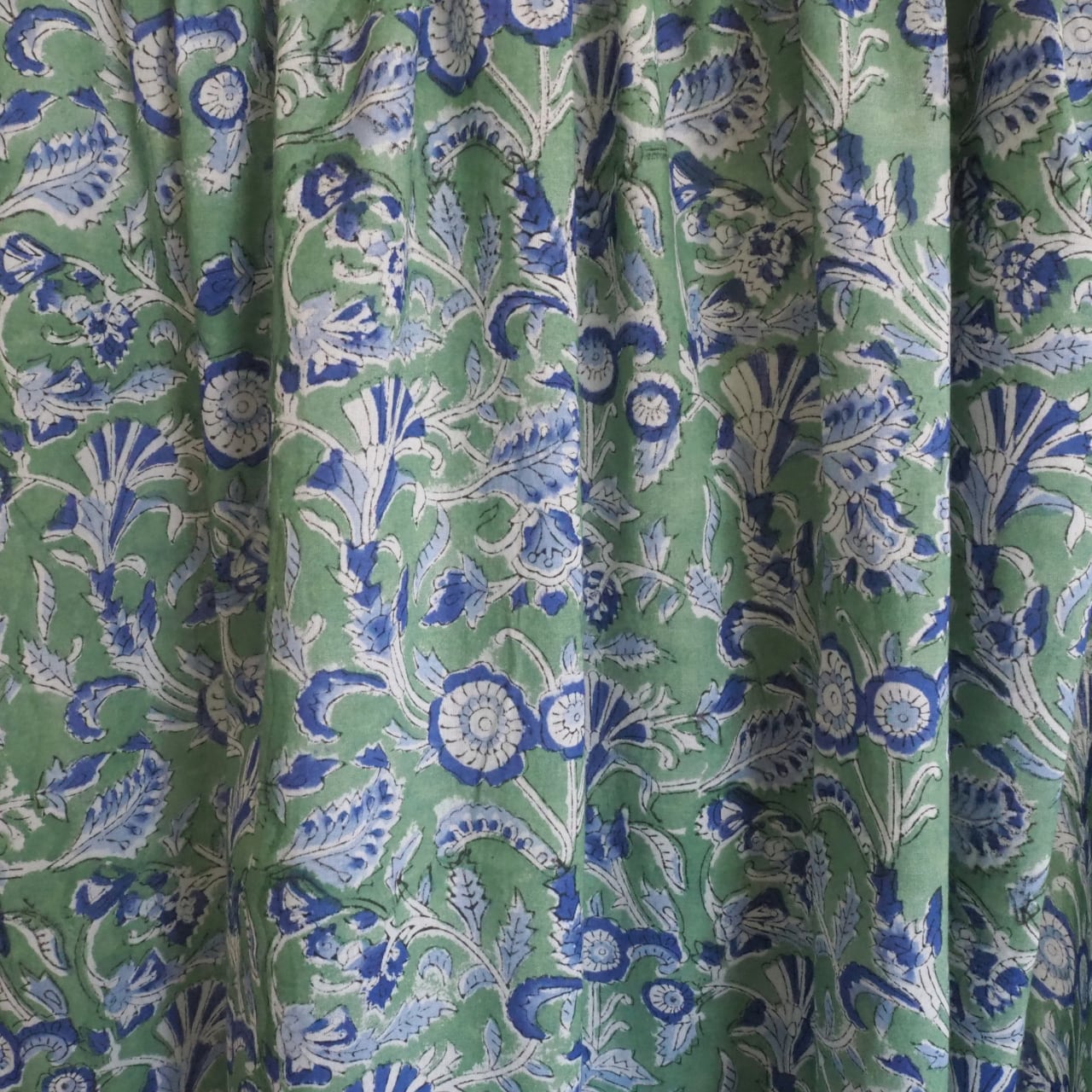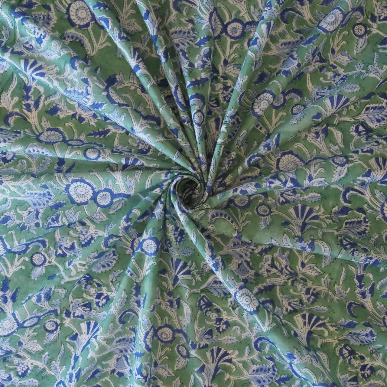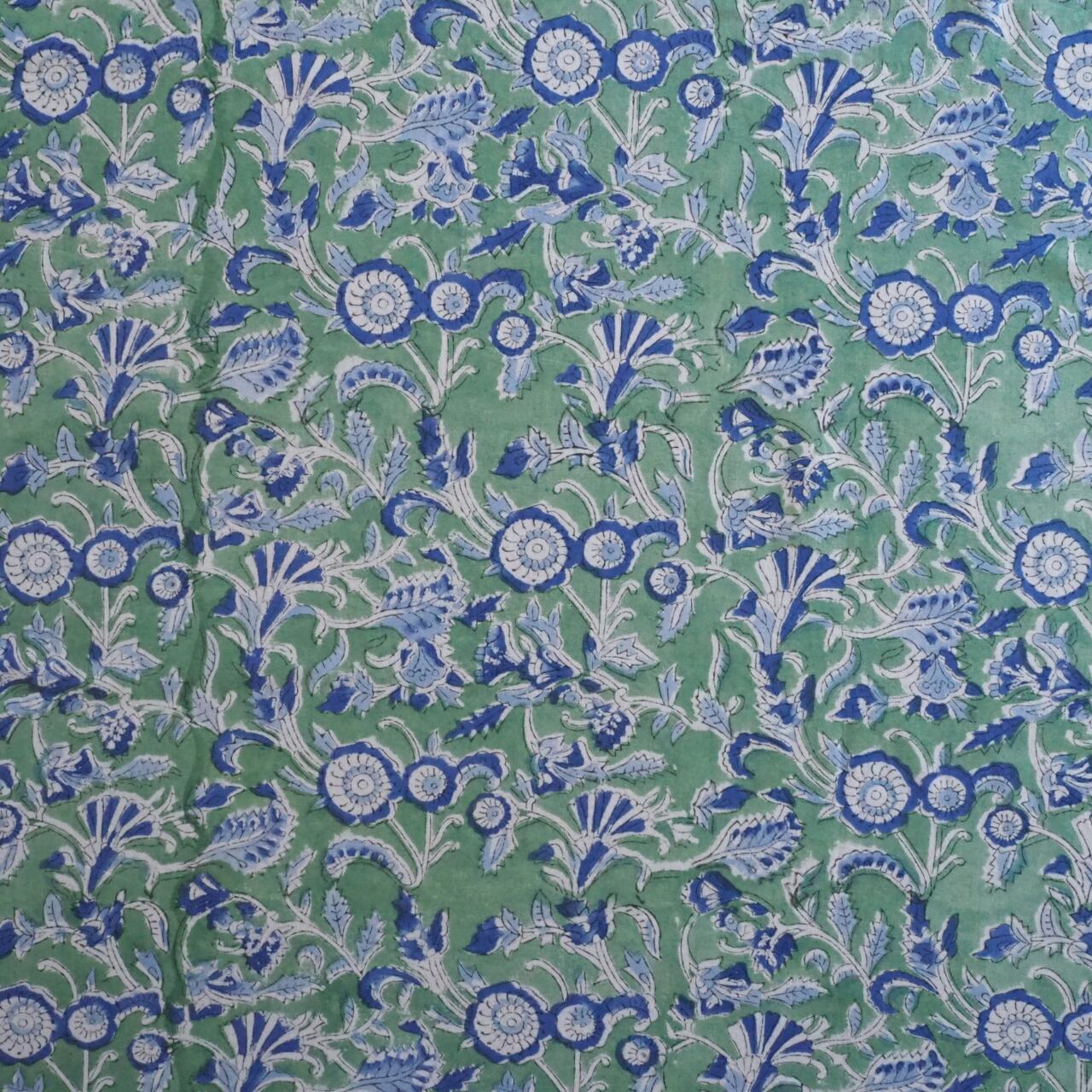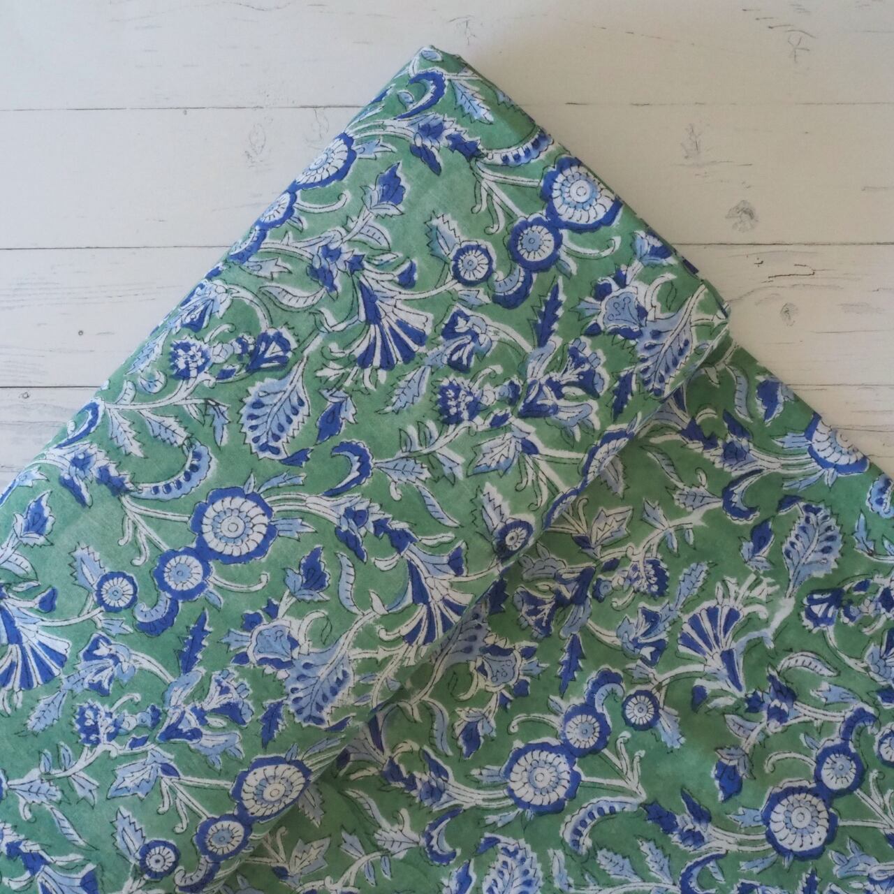 ブロックプリント生地【50cm単位】インド綿 花柄 グリーン×ブルー #45091-GR1