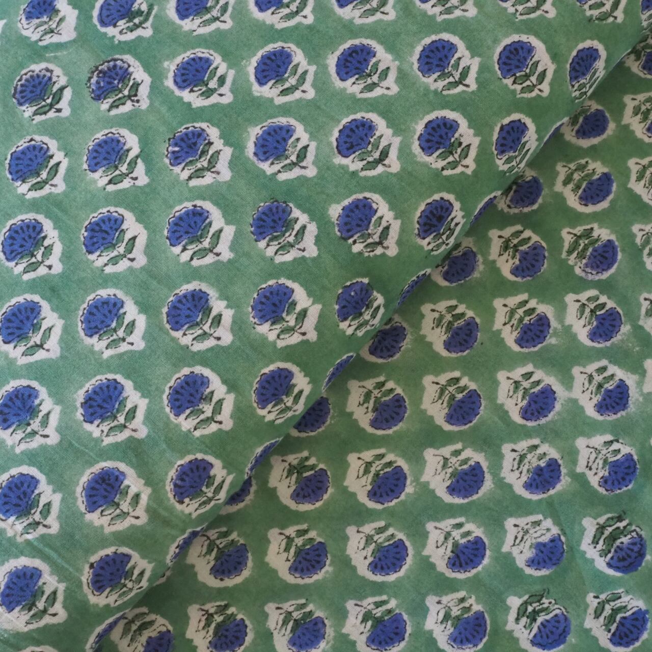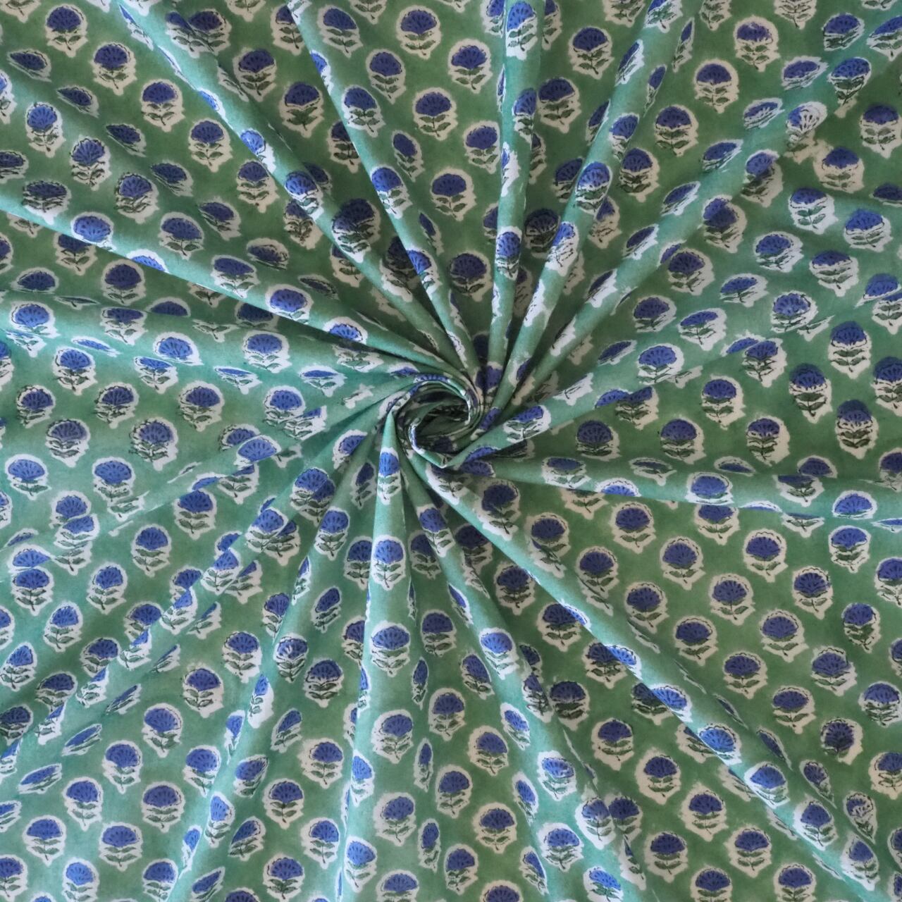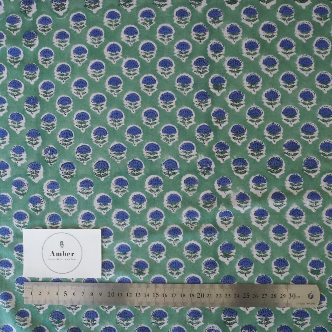 ブロックプリント生地【50cm単位】インド綿 小花柄 グリーン×ブルー #45191-GR2