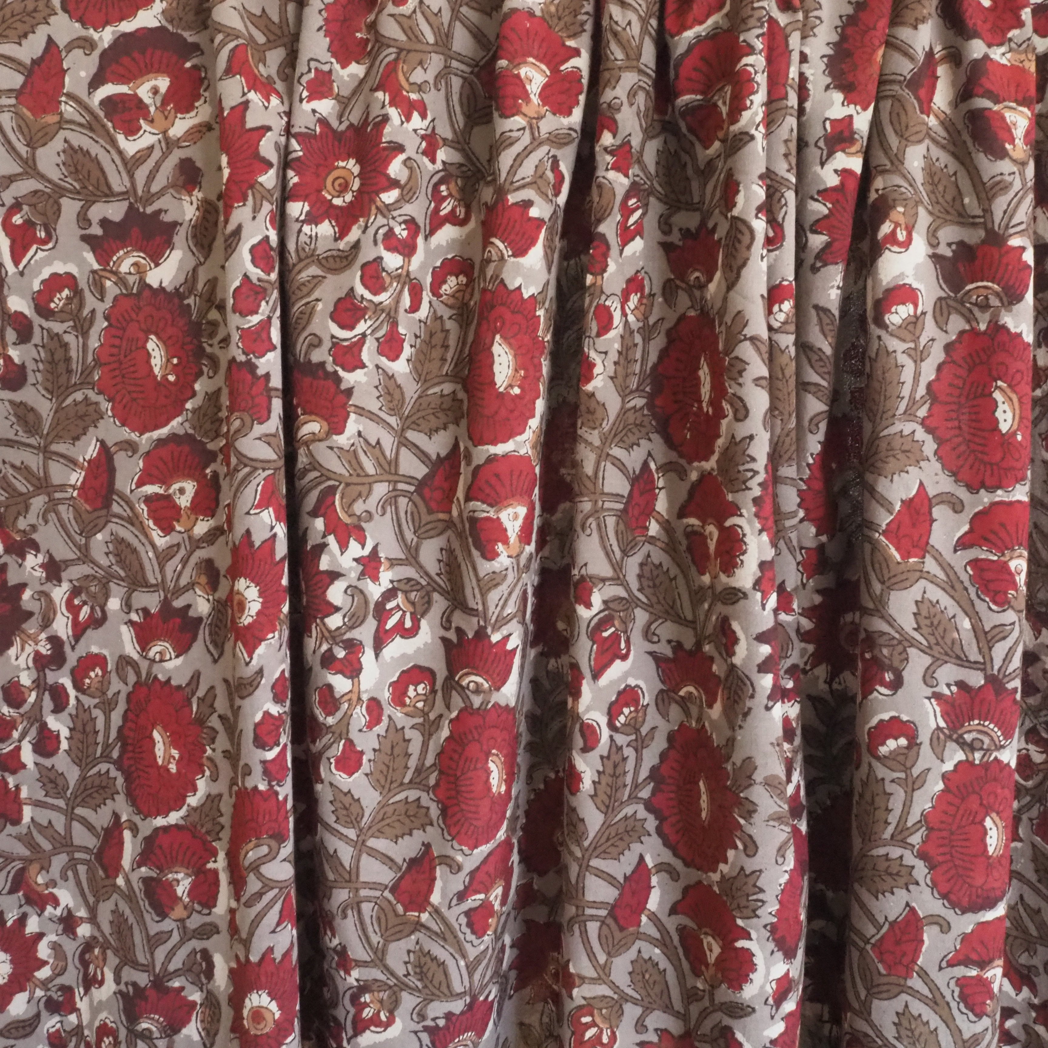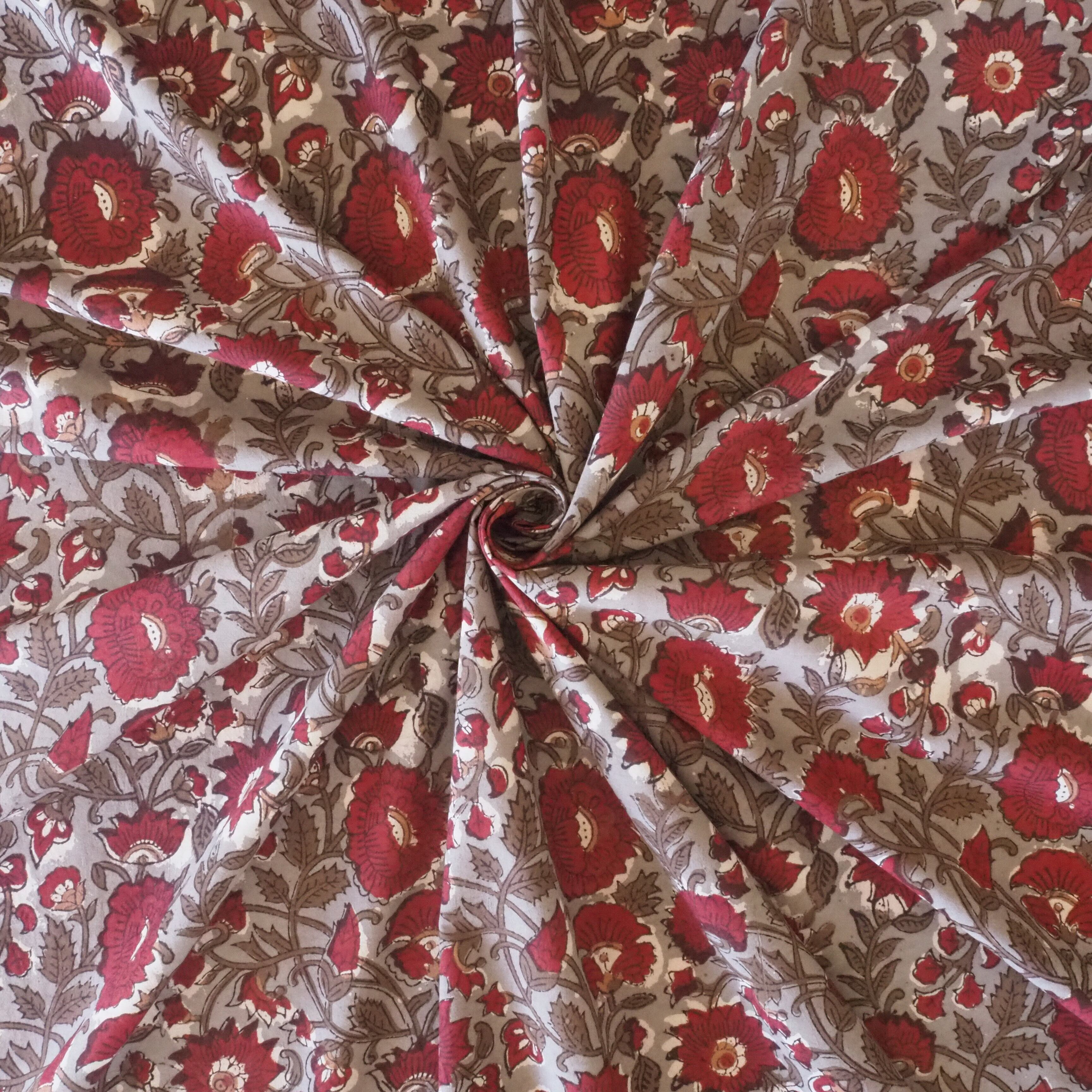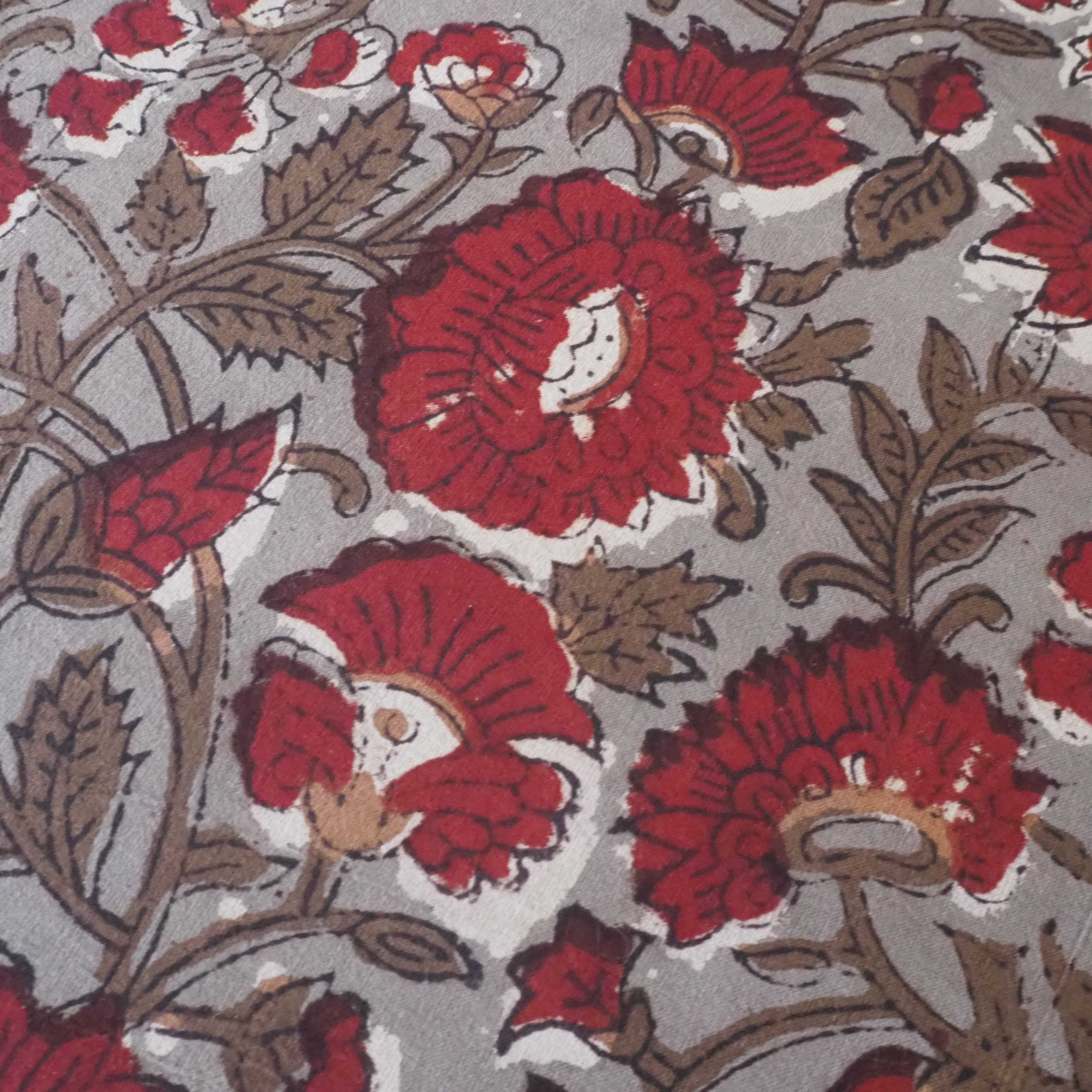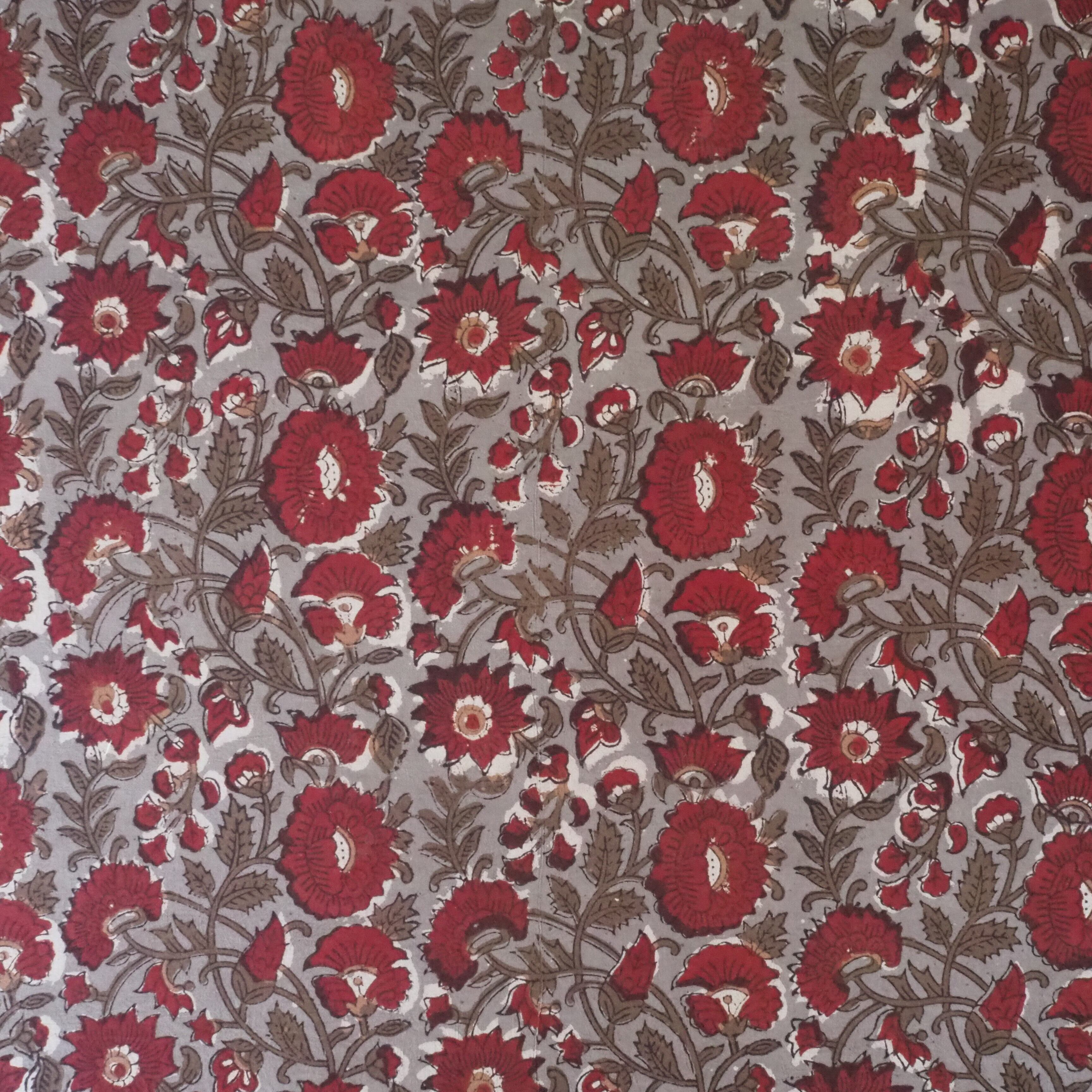 ブロックプリント生地【50cm単位】インド綿 花柄 グレージュ×赤 #45710-GY1