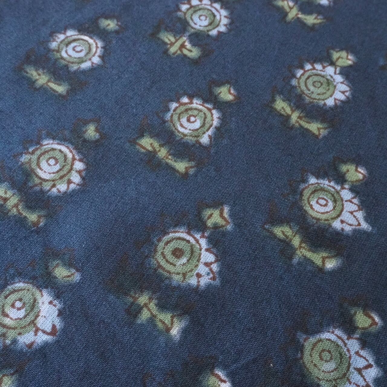 ハンドブロックプリントと呼ばれるインドのジャイプール地方に古くから伝わる伝統的な技法で、木彫りのスタンプで色を何度も重ね、全ての工程がインドの職人さんの手作業によって仕上がるAll Handmadeの生地です。