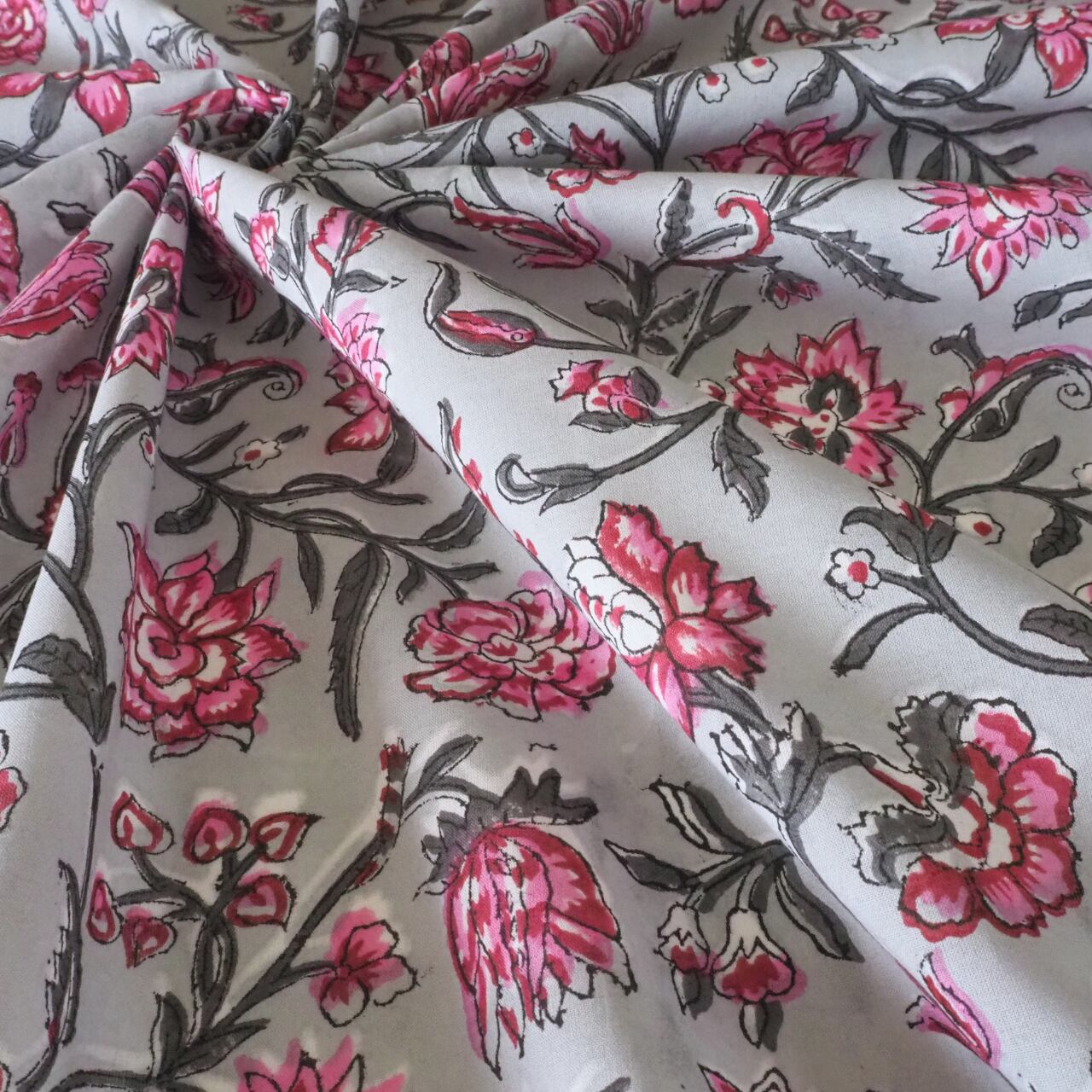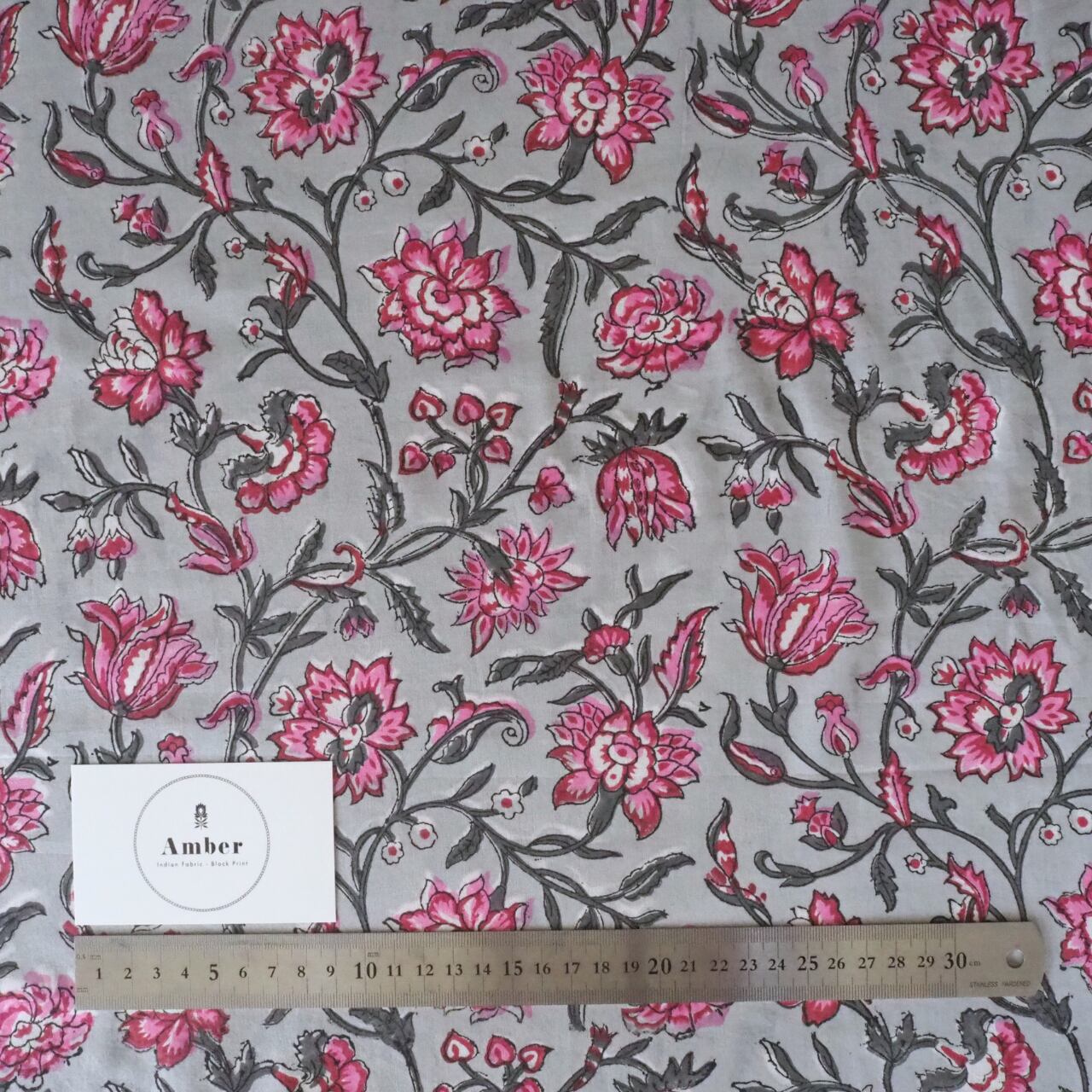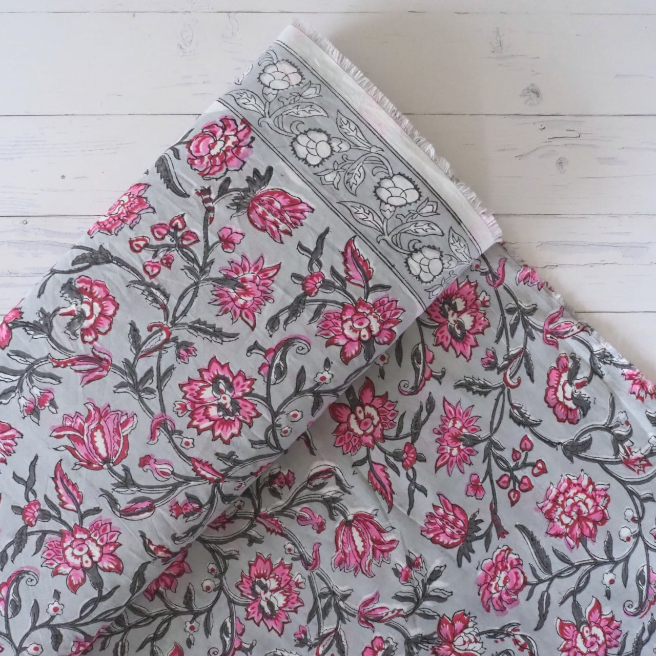 ブロックプリント生地【50cm単位】インド綿 片耳デザイン付き 花柄 グレー×ピンク #46095-GY1