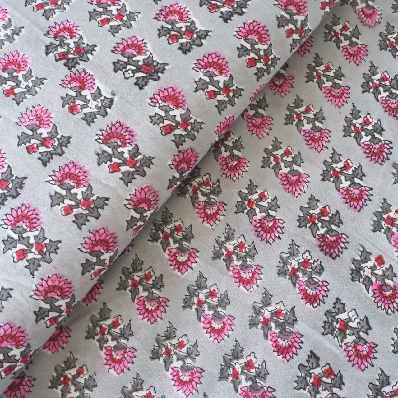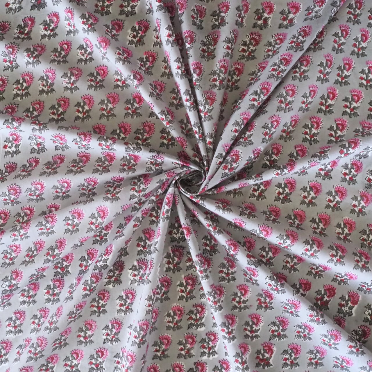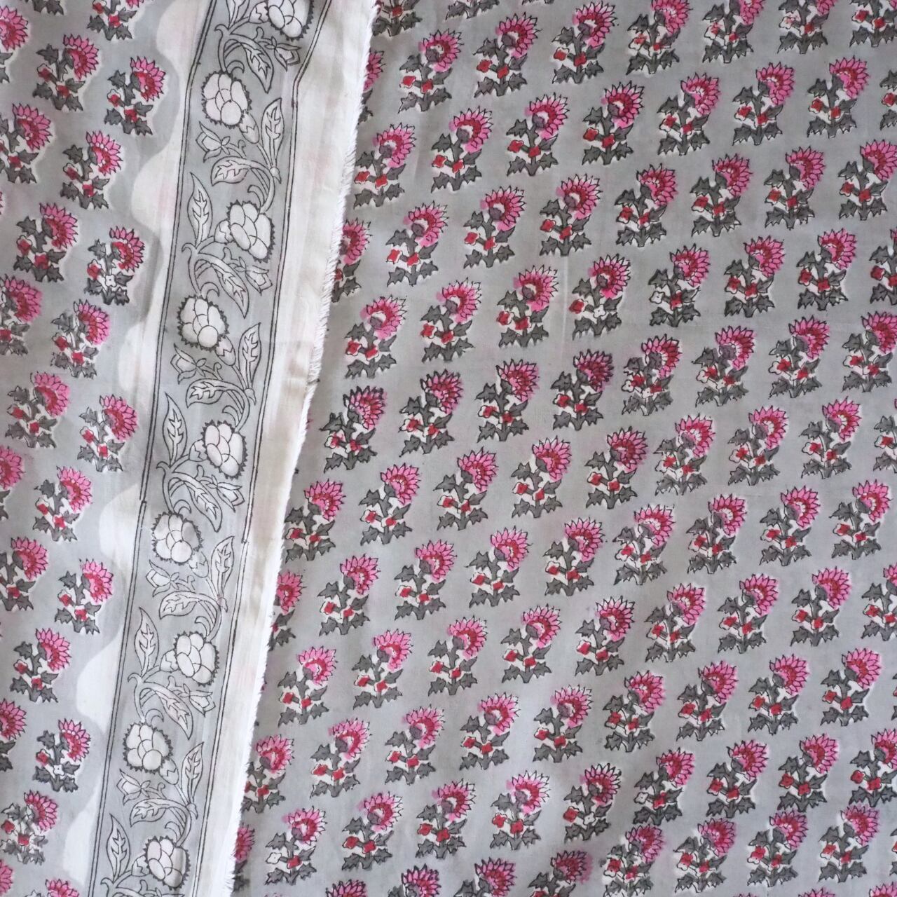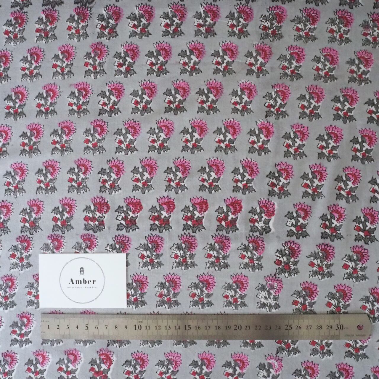 ブロックプリント生地【50cm単位】インド綿 片耳デザイン付き 小花柄 グレー×ピンク #46195-GY2