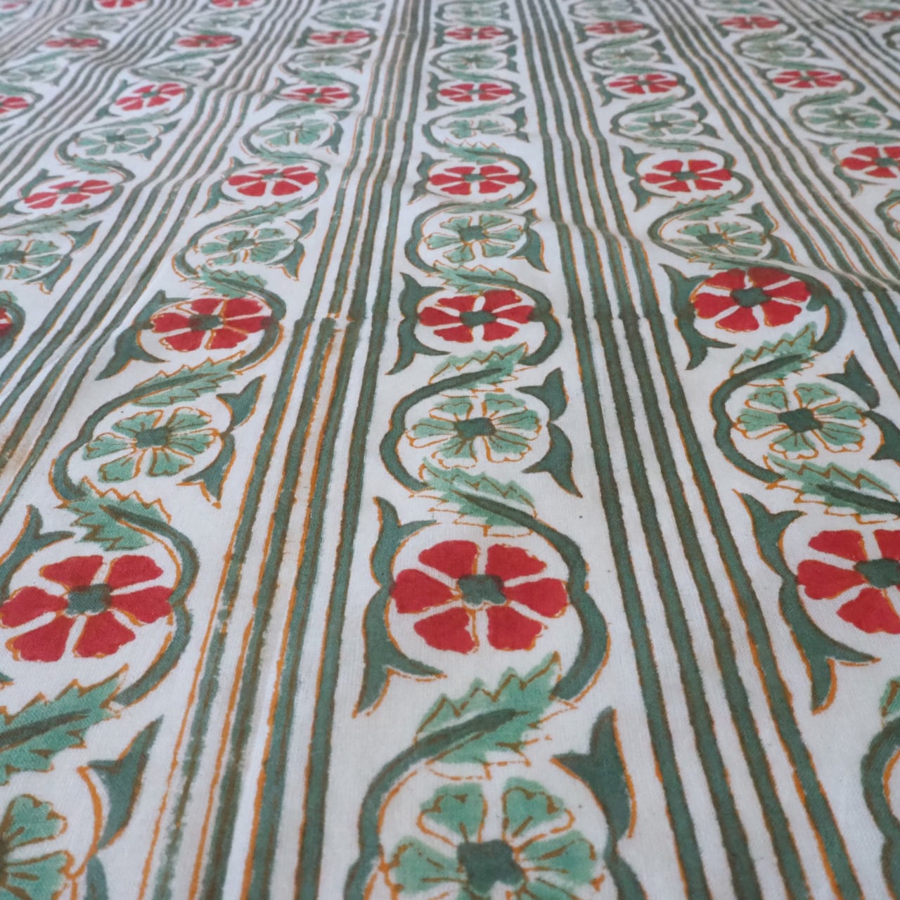 ハンドブロックプリントと呼ばれるインドのジャイプール地方に古くから伝わる伝統的な技法で、木彫りのスタンプで色を何度も重ね、全ての工程がインドの職人さんの手作業によって仕上がるAll Handmadeの生地です。