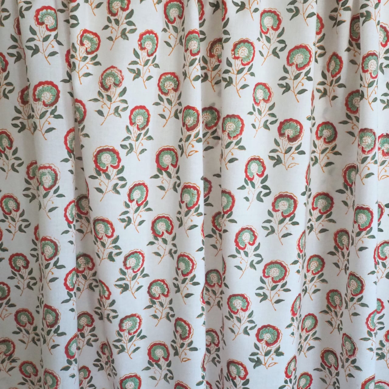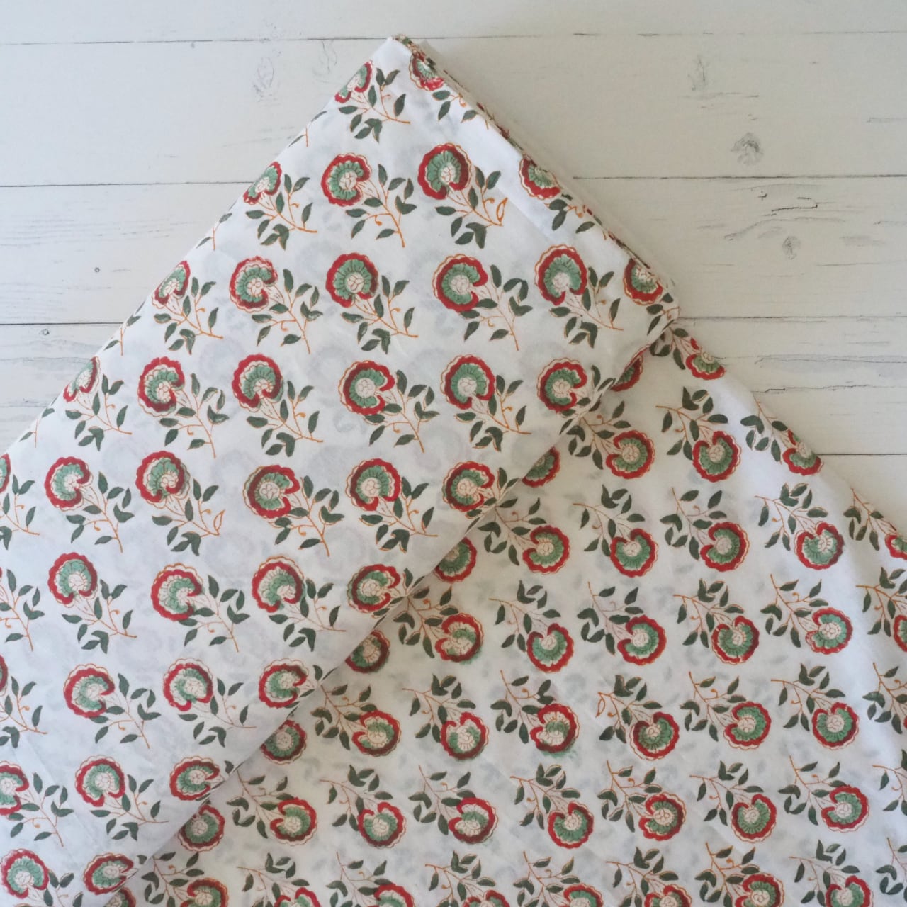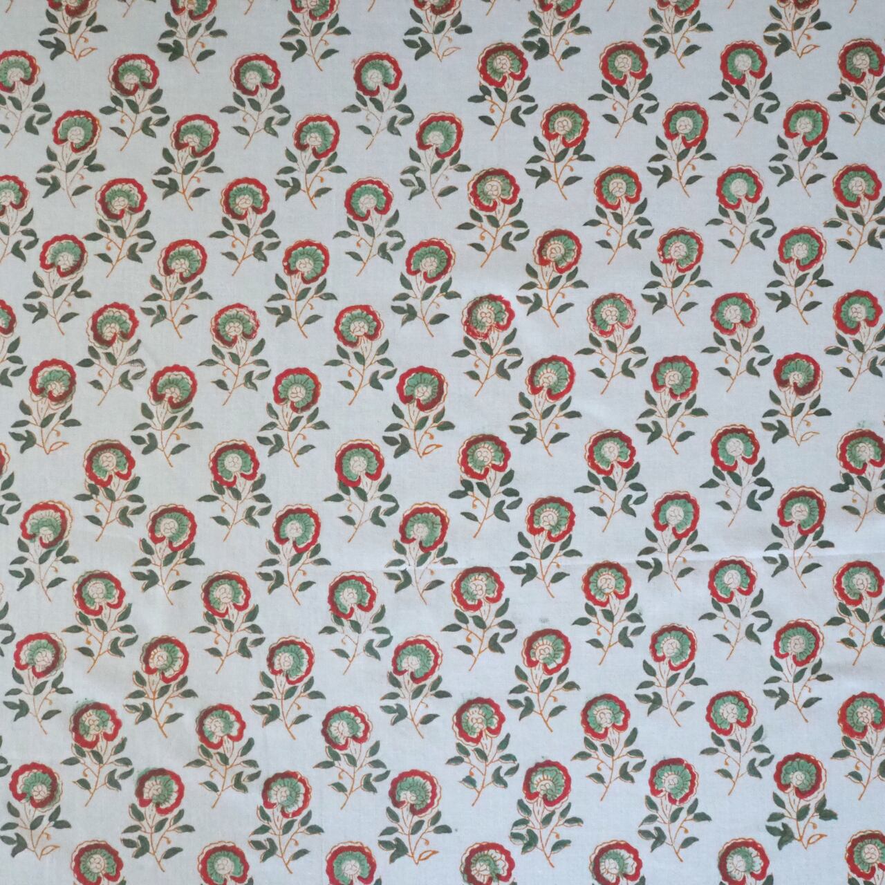 ブロックプリント生地【50cm単位】インド綿 小花柄 白×くすみグリーン×赤 #46496-GR3