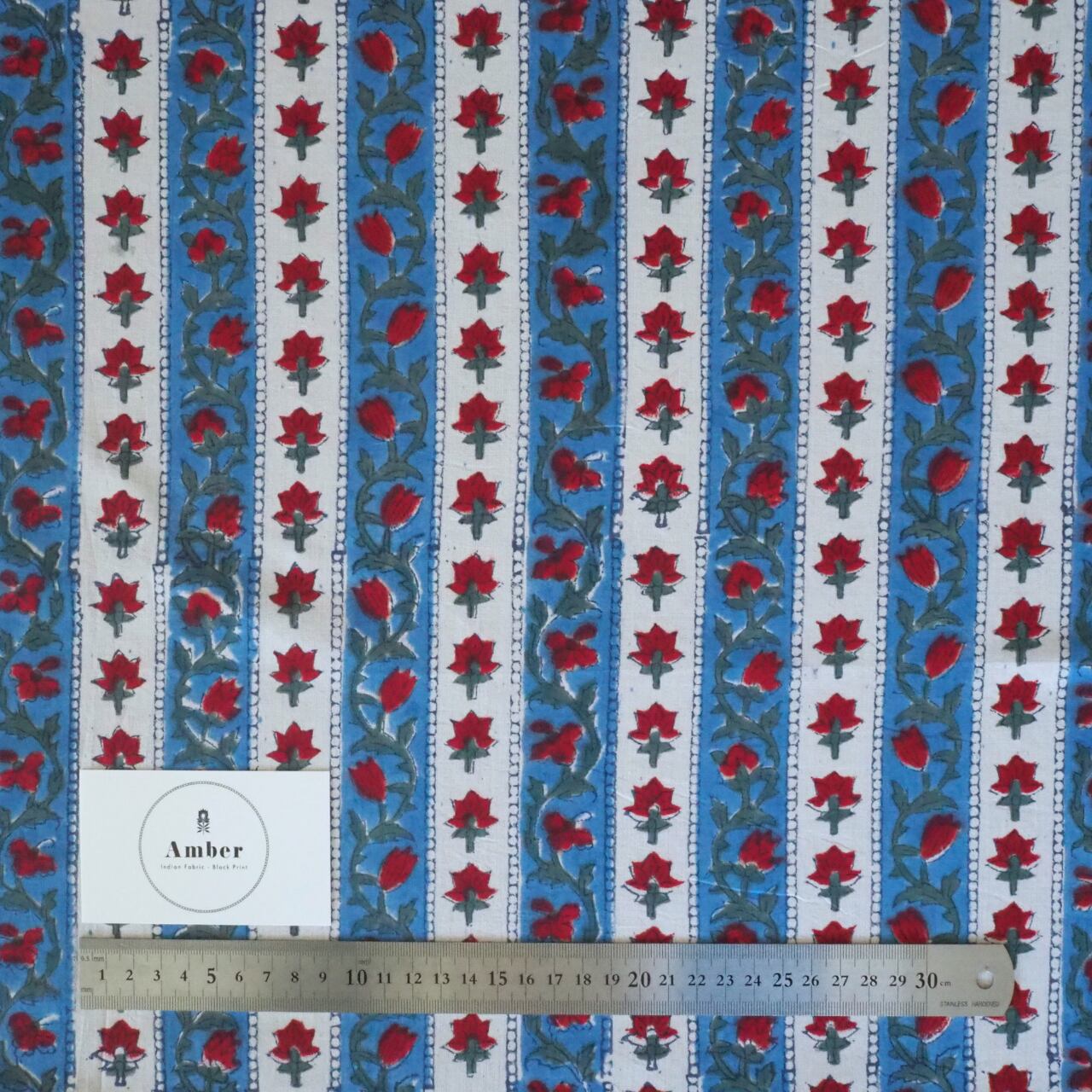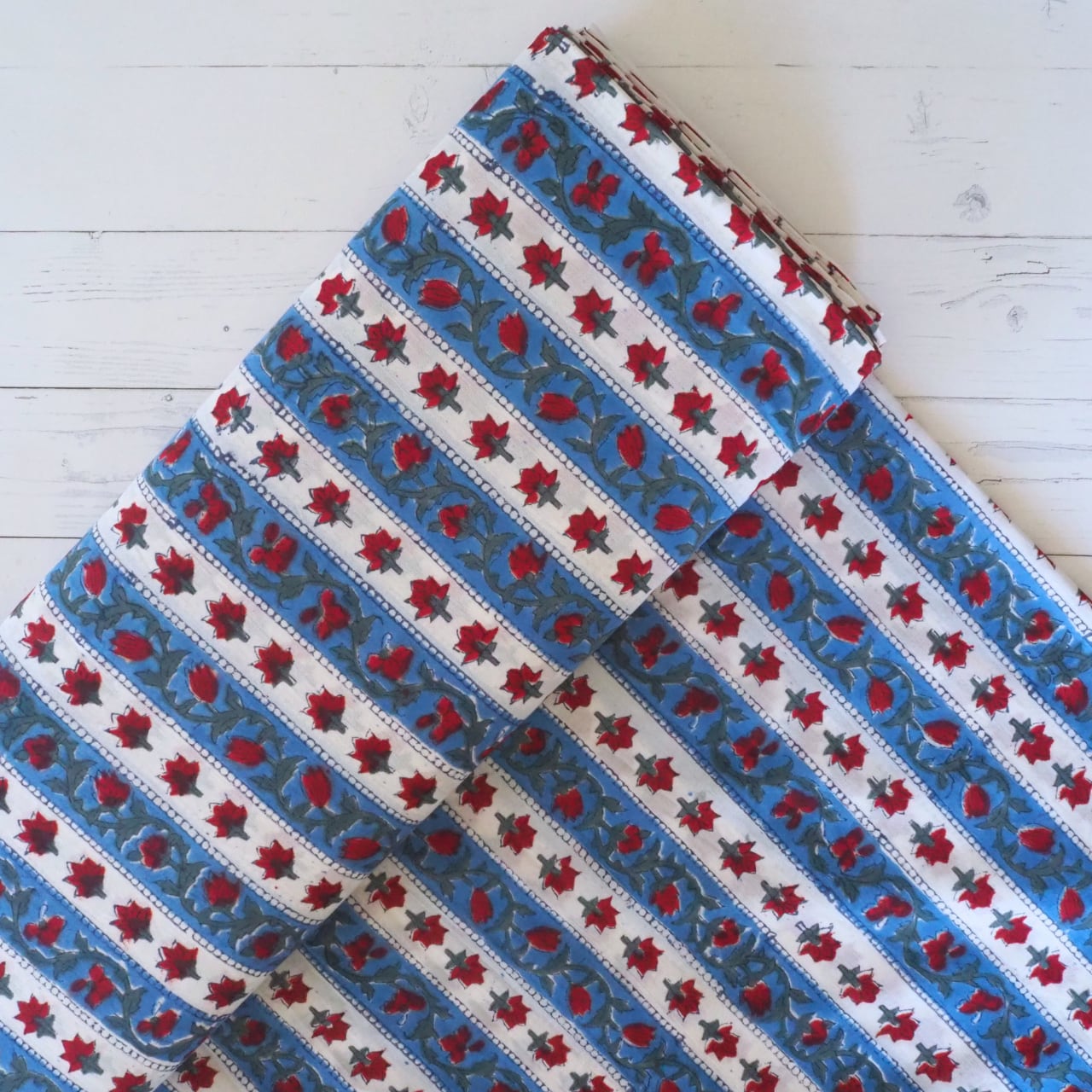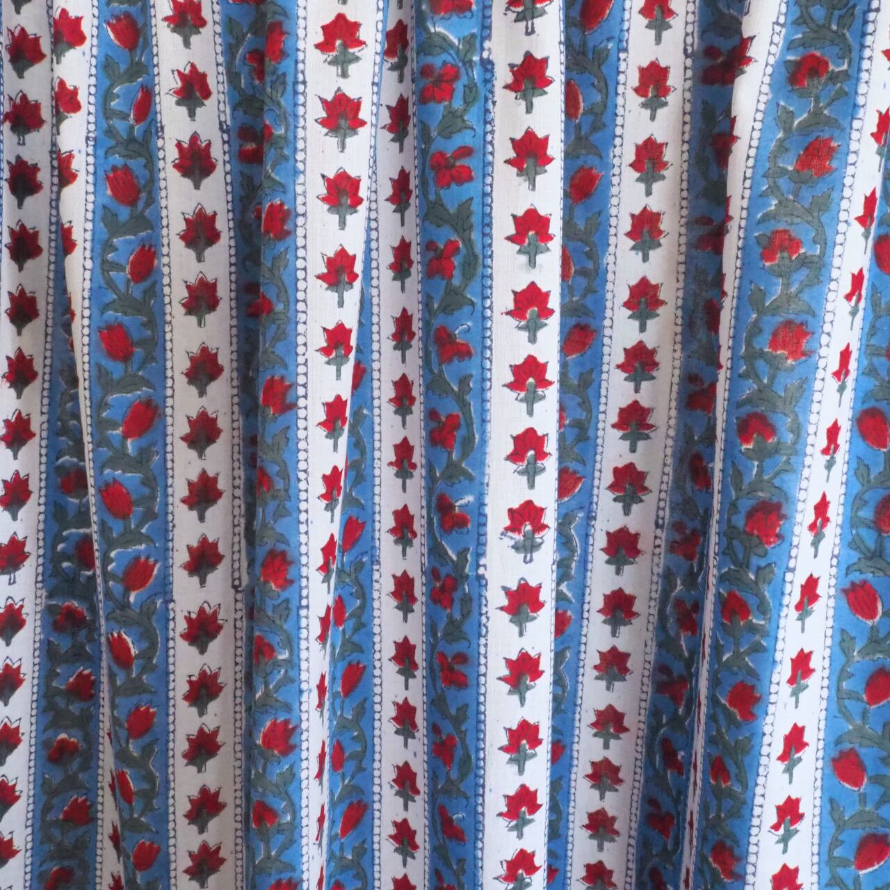 ブロックプリント生地【50cm単位】インド綿 ストライプ柄 ブルー×赤×白 #47098-BL2