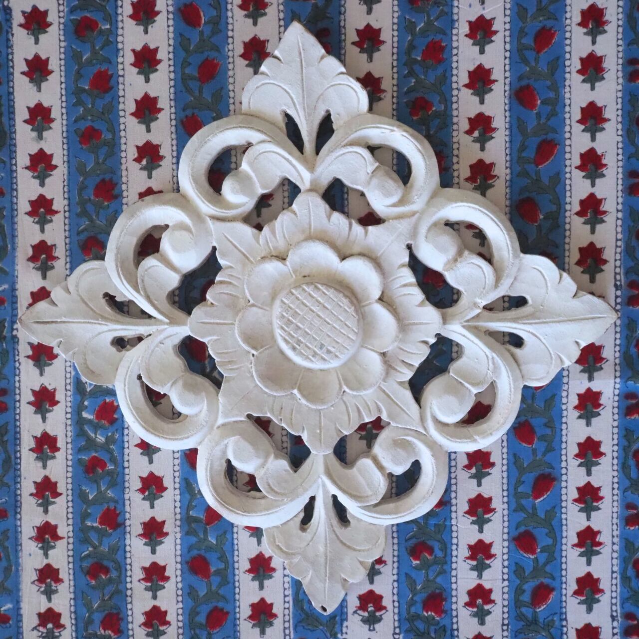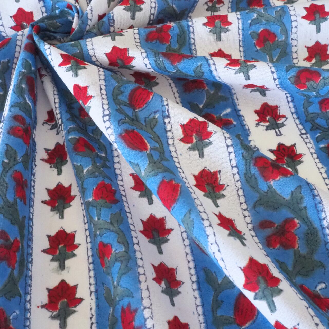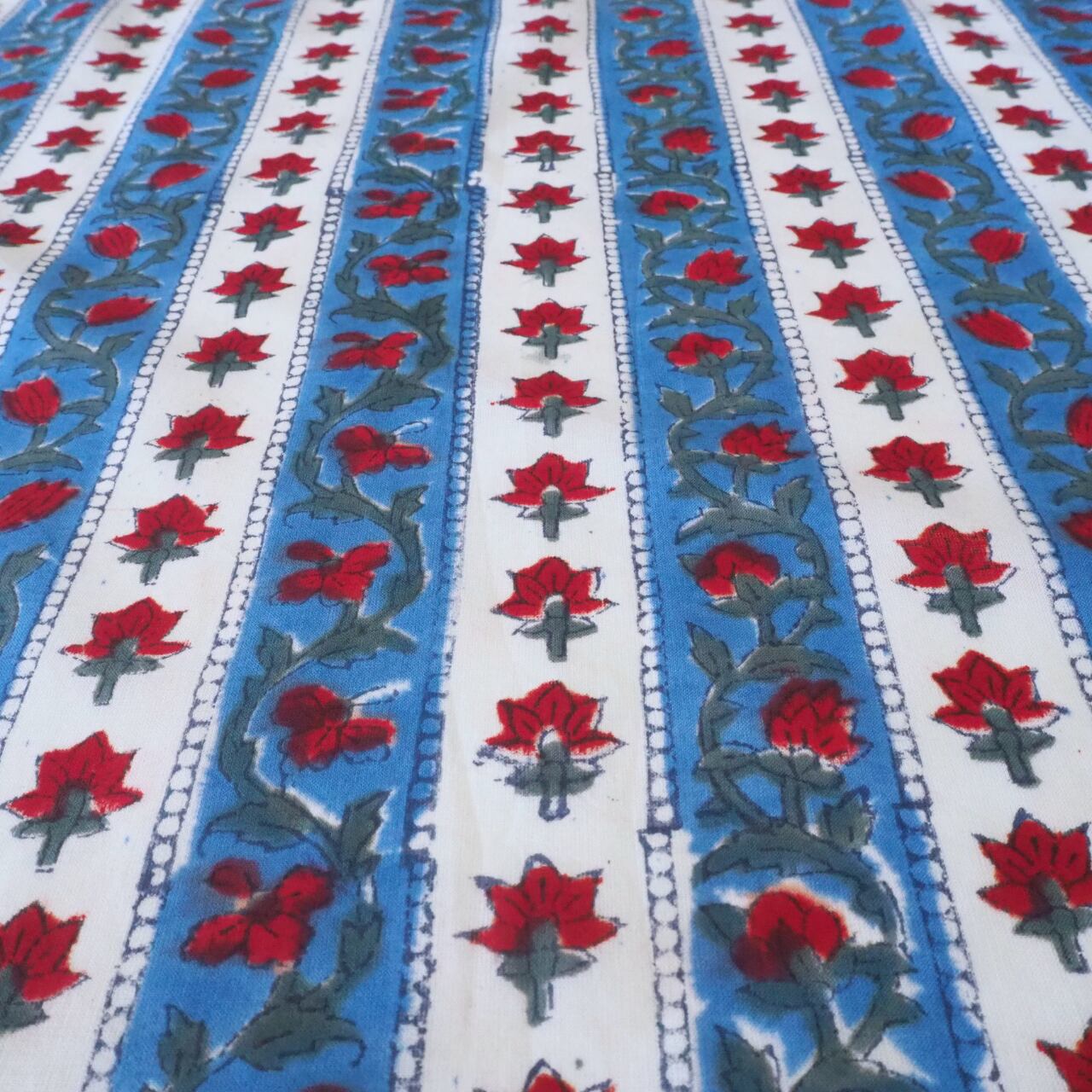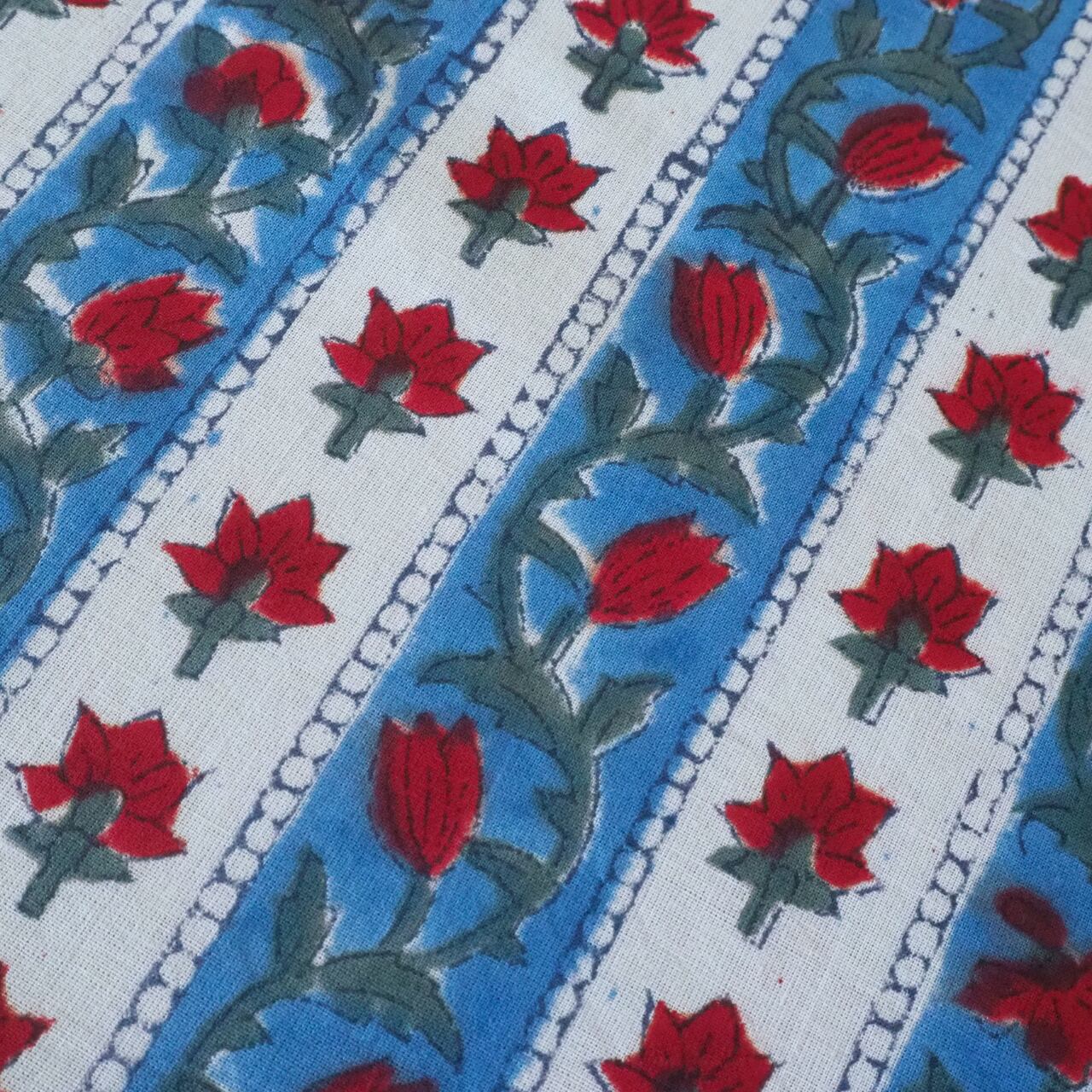 ハンドブロックプリントと呼ばれるインドのジャイプール地方に古くから伝わる伝統的な技法で、木彫りのスタンプで色を何度も重ね、全ての工程がインドの職人さんの手作業によって仕上がるAll Handmadeの生地です。