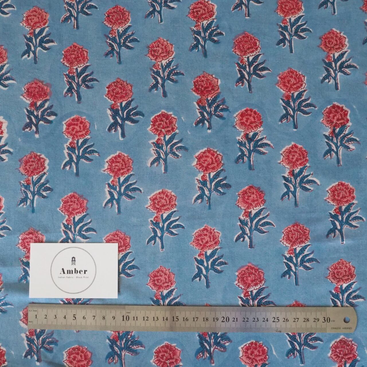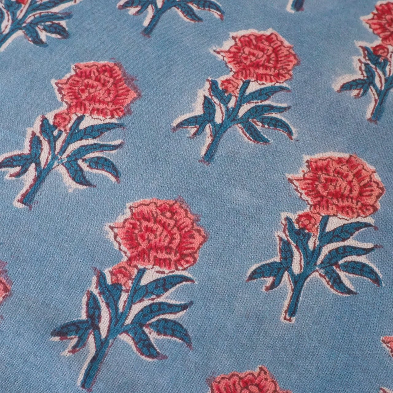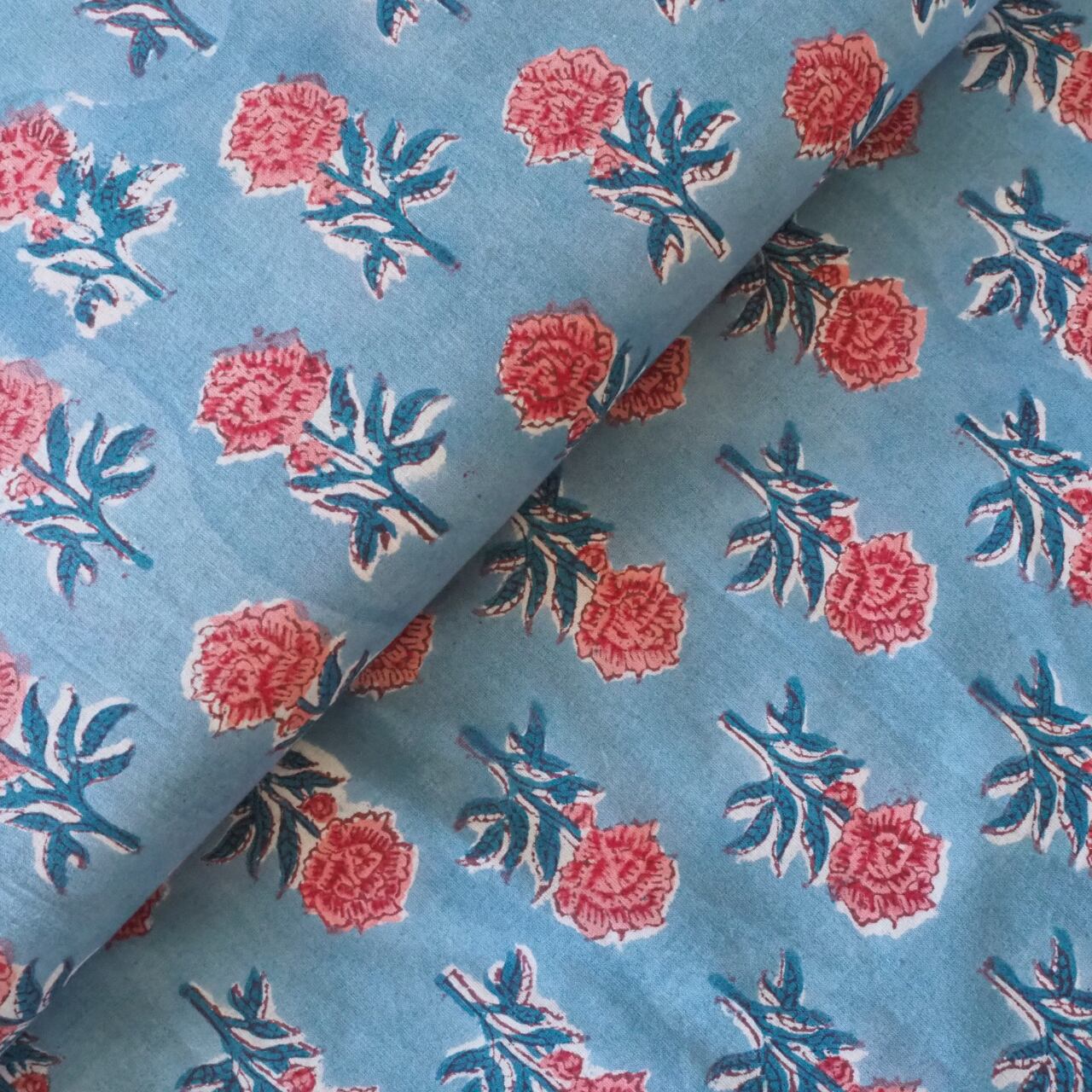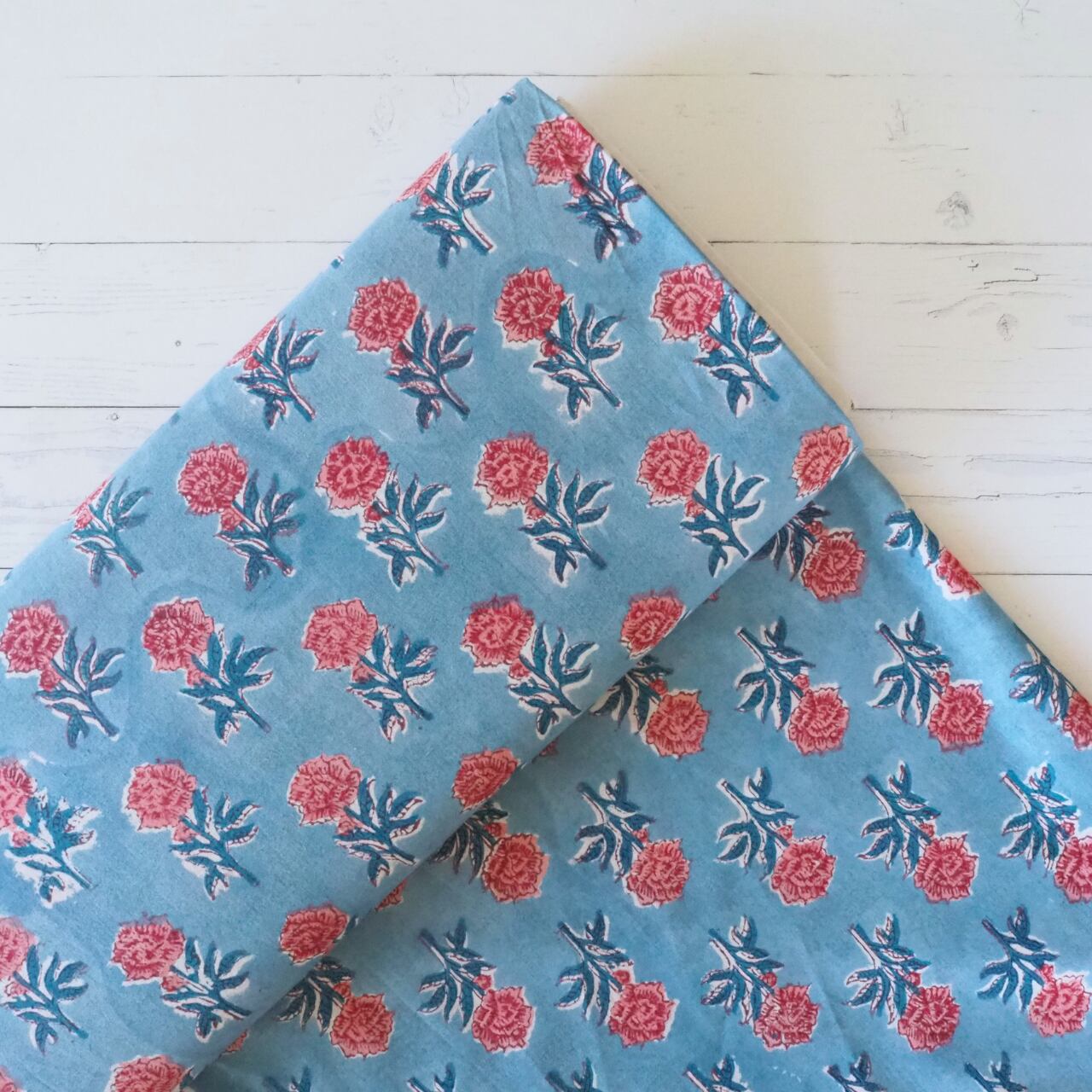 ブロックプリント生地【50cm単位】インド綿 miniローズ柄 水色×ローズピンク #49410-BL1