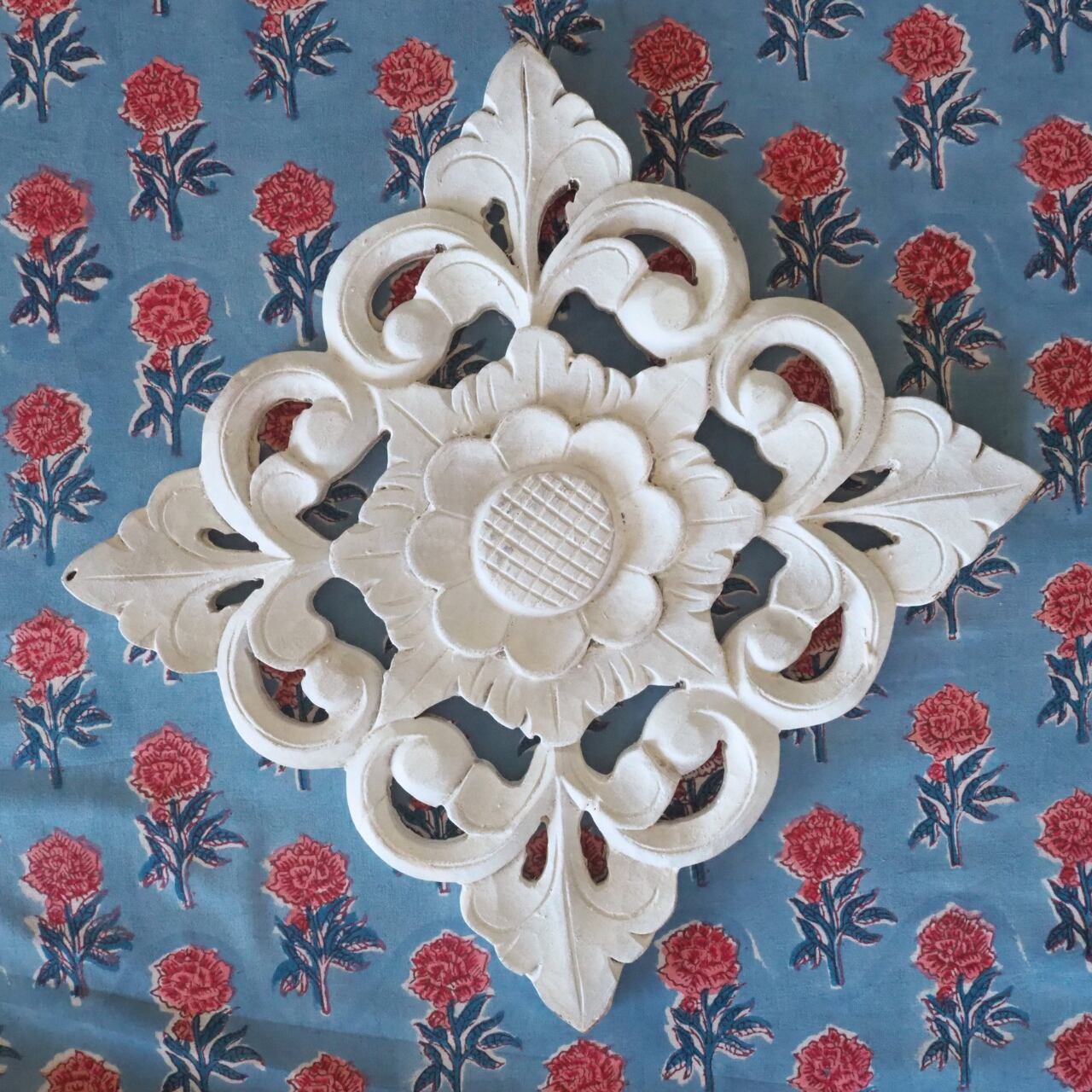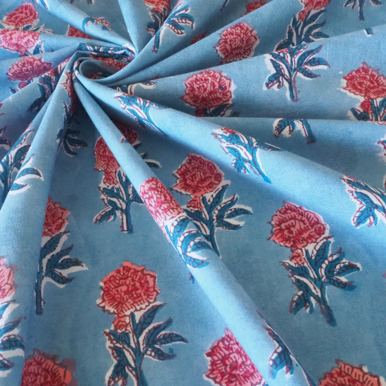 ハンドブロックプリントと呼ばれるインドのジャイプール地方に古くから伝わる伝統的な技法で、木彫りのスタンプで色を何度も重ね、全ての工程がインドの職人さんの手作業によって仕上がるAll Handmadeの生地です。
