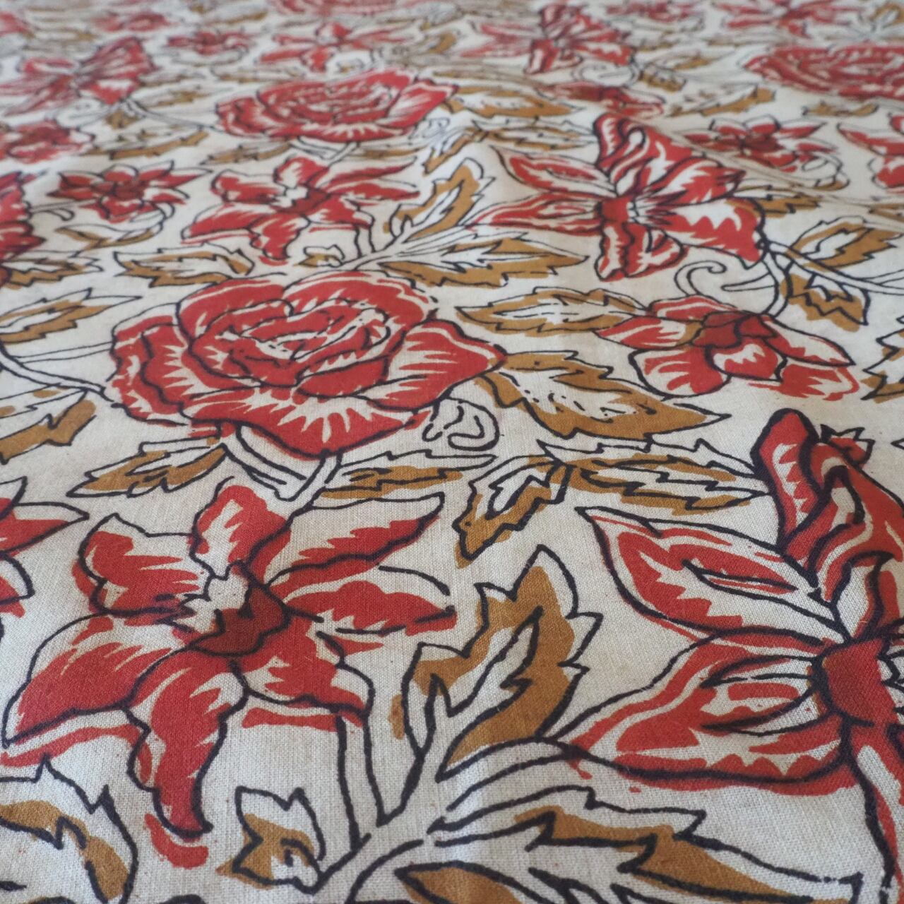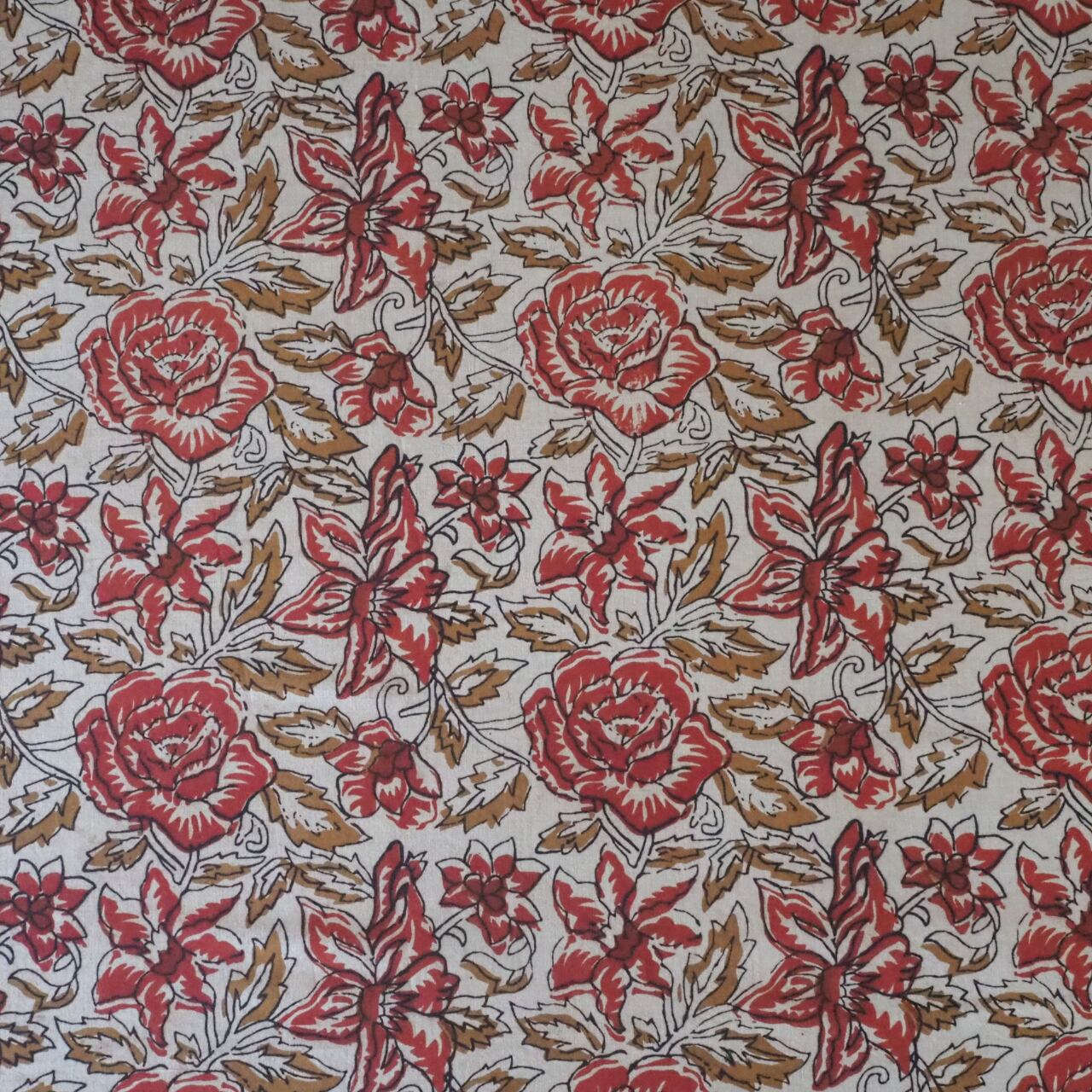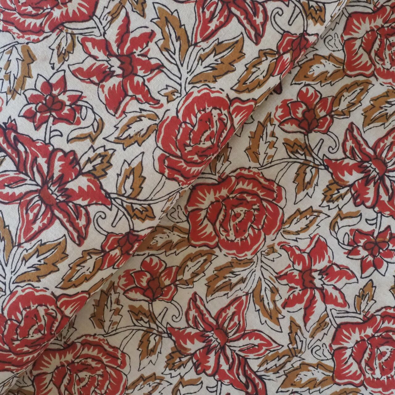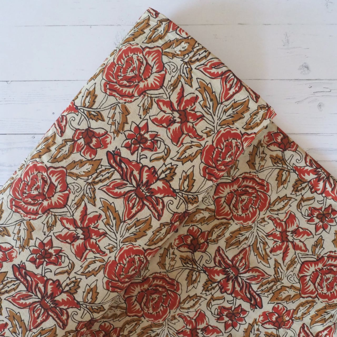 ブロックプリント生地【50cm単位】インド綿 花柄(Rose) 生成り×赤 #50310-WT1