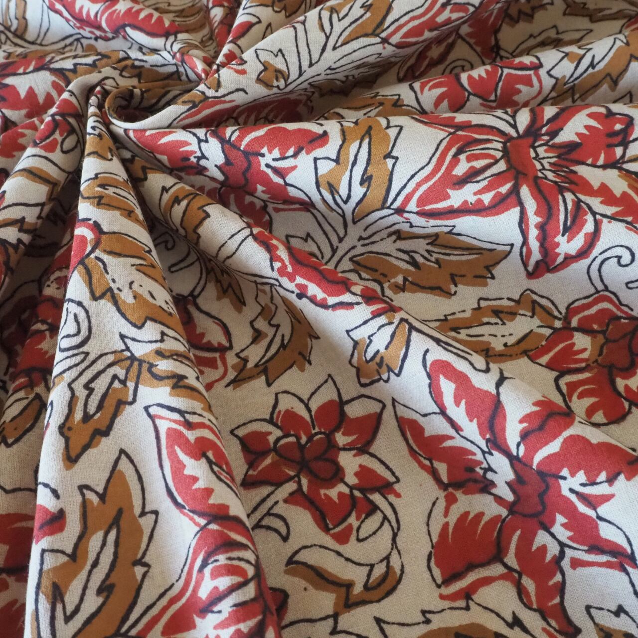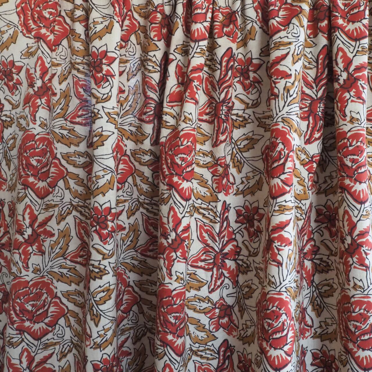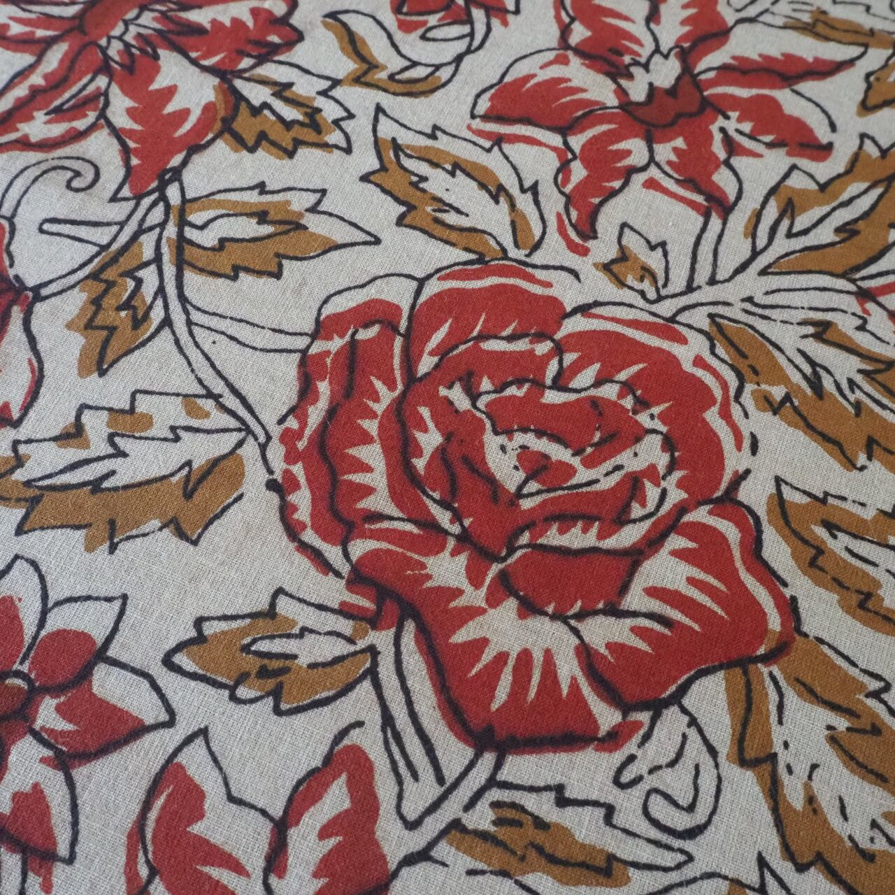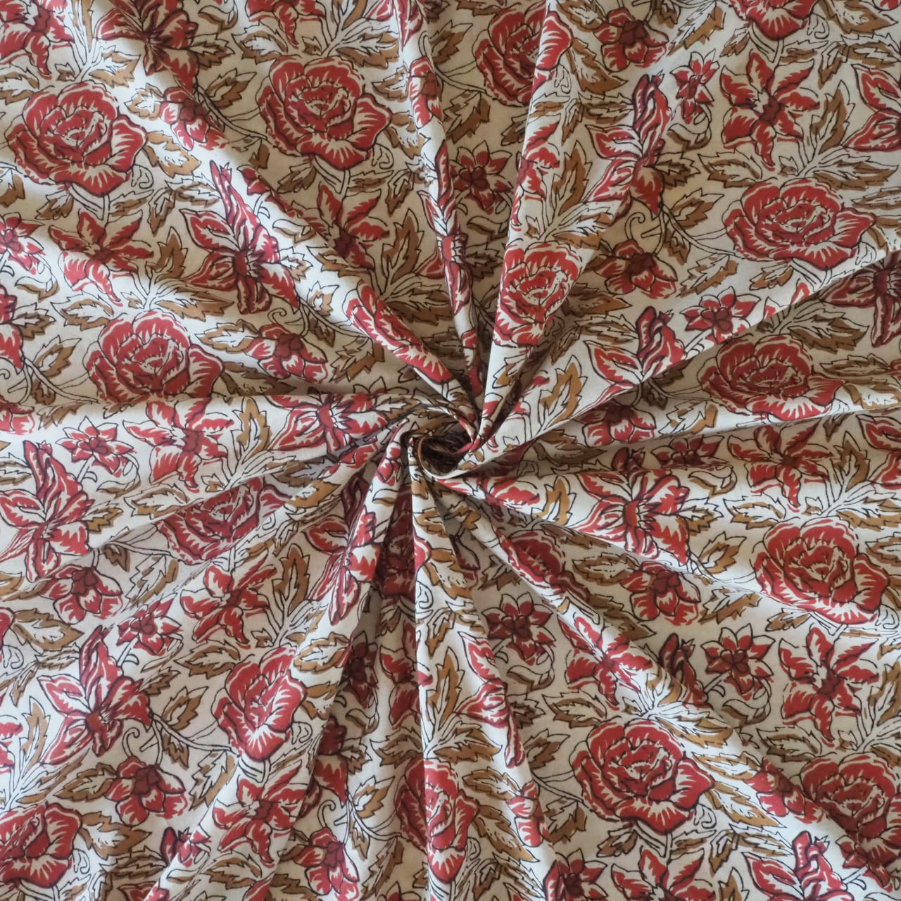 ブロックプリント生地【50cm単位】インド綿 花柄(Rose) 生成り×赤 #50310-WT1
