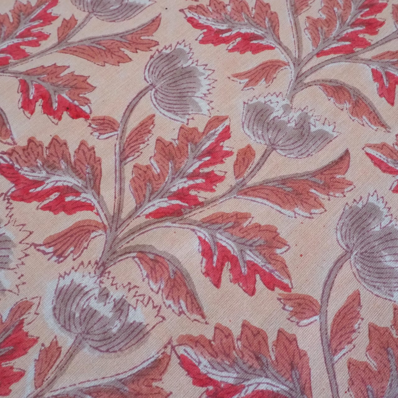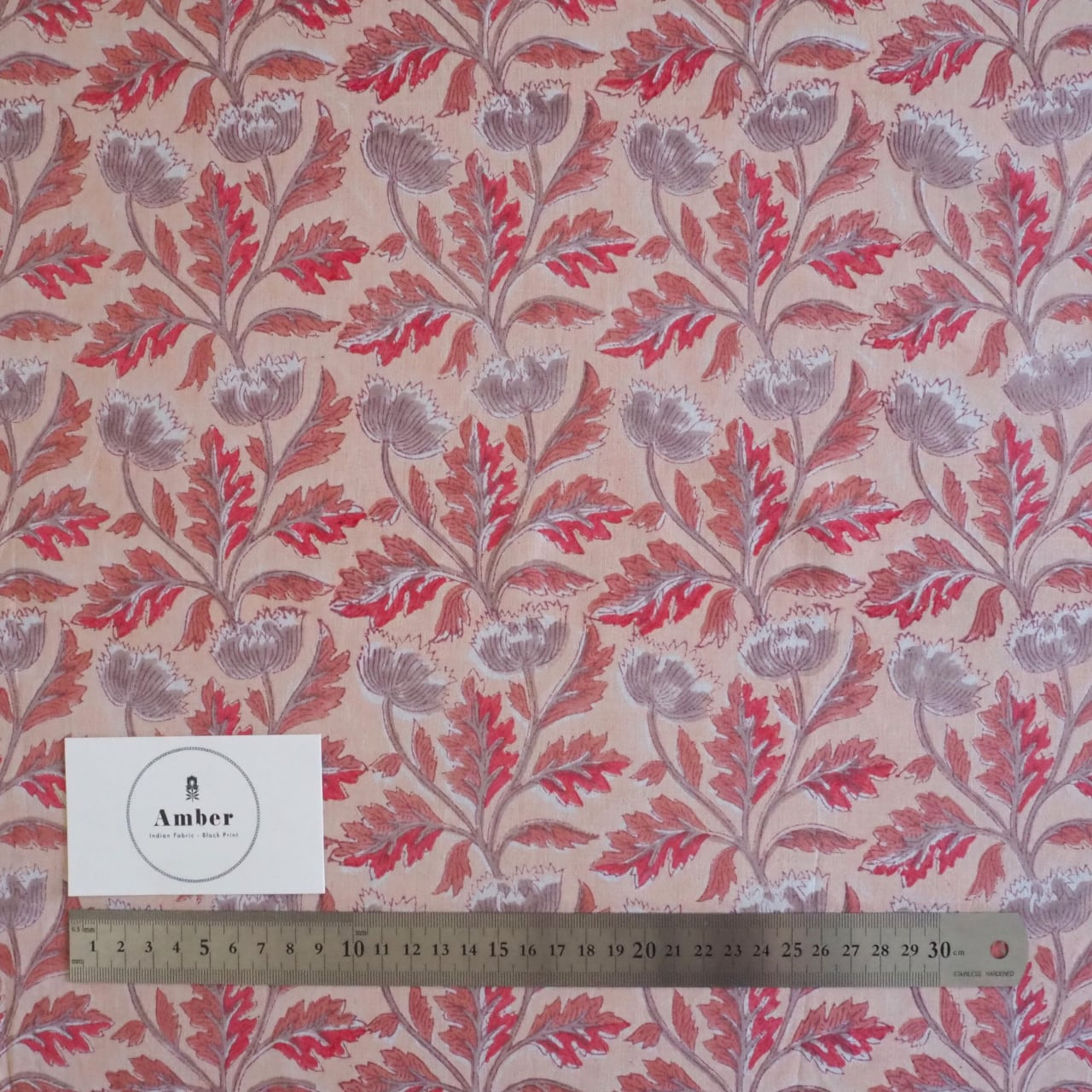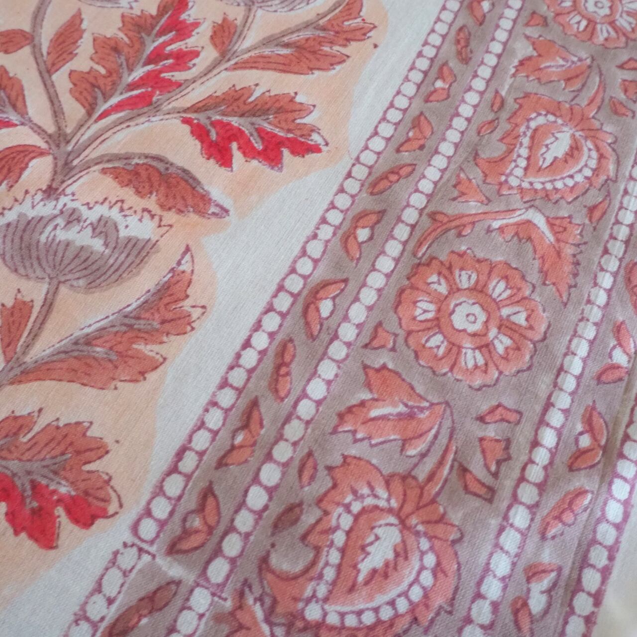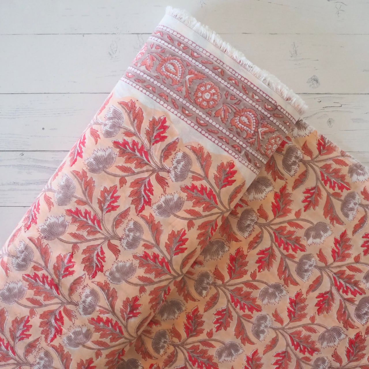 ブロックプリント生地【50cm単位】インド綿 片耳デザイン付き 花柄B コーラルピンク×ブラウン #51414-PK4