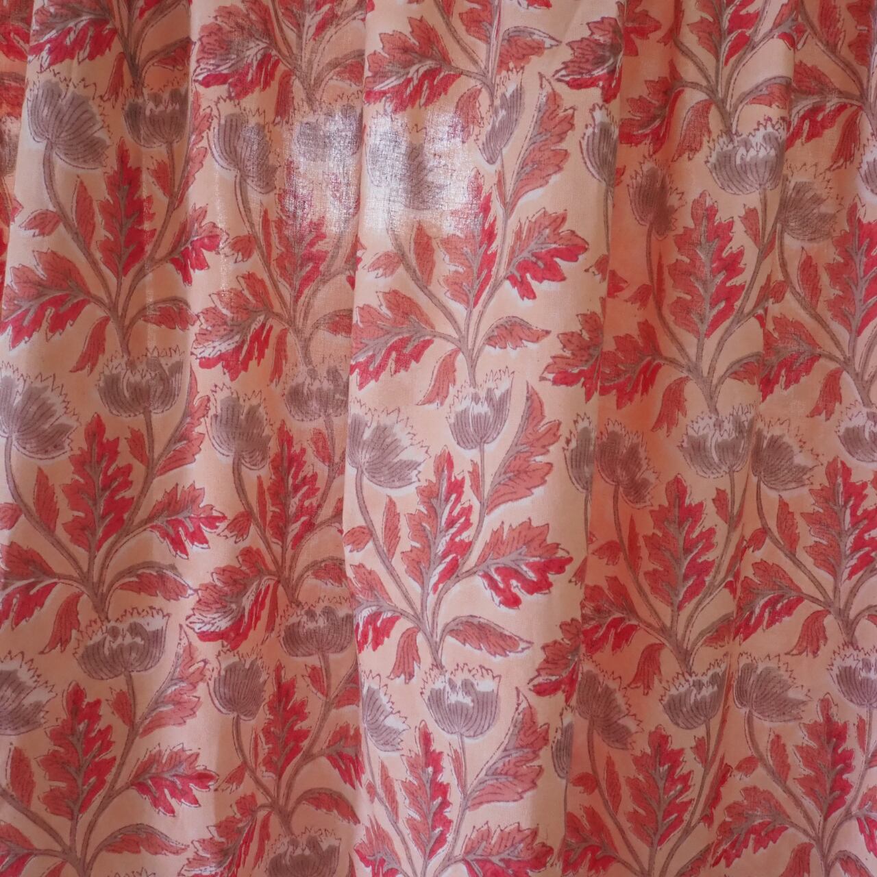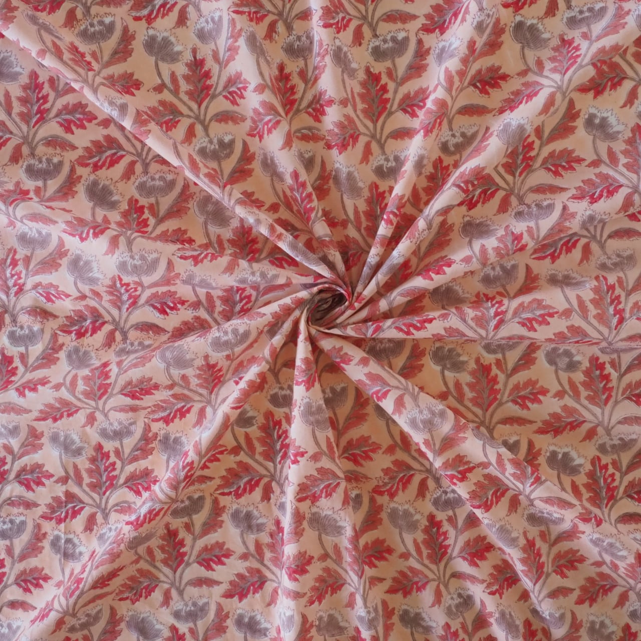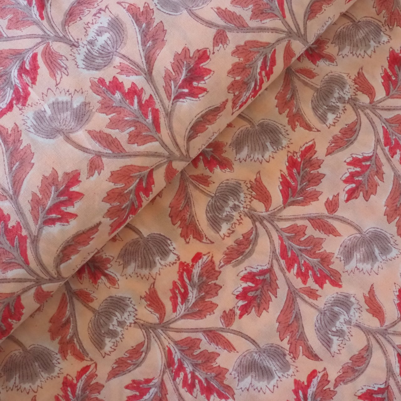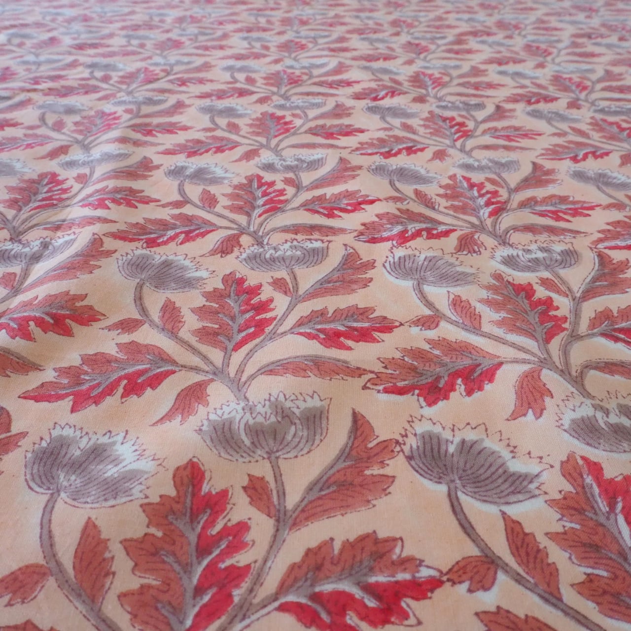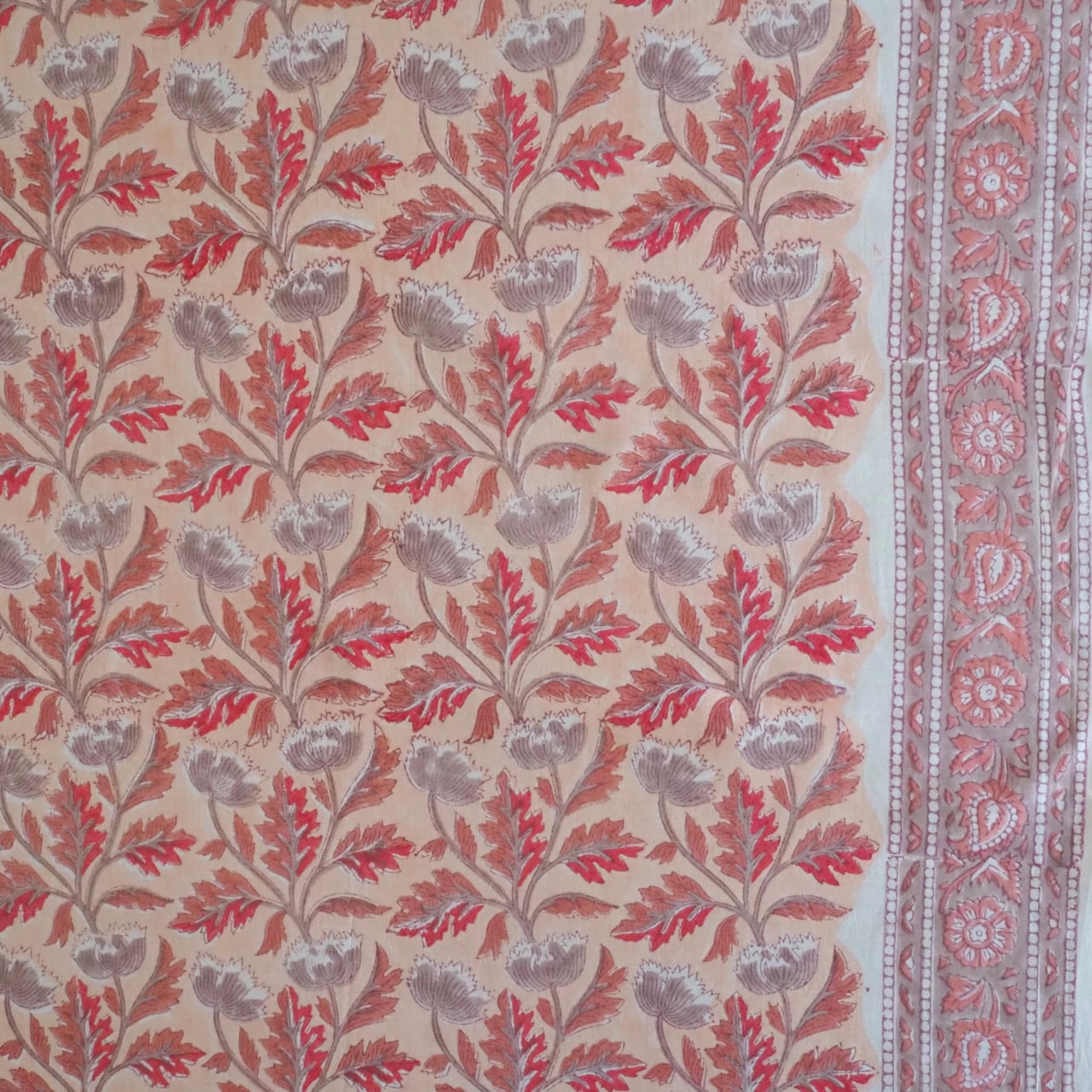 ブロックプリント生地【50cm単位】インド綿 片耳デザイン付き 花柄B コーラルピンク×ブラウン #51414-PK4