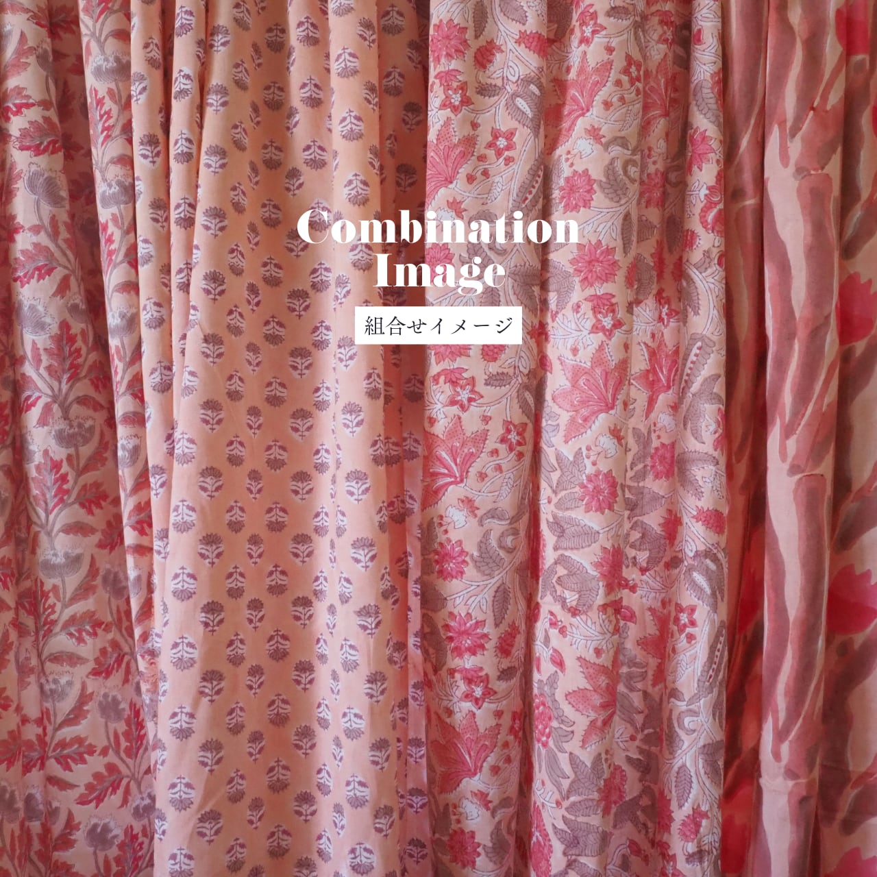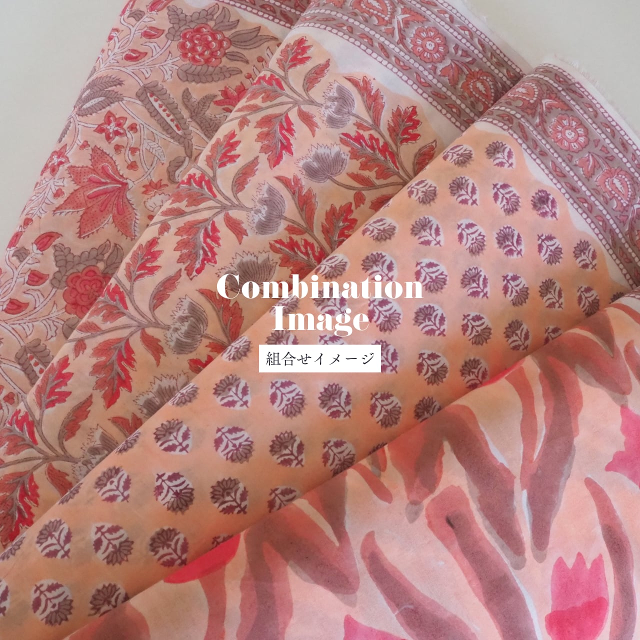 ハンドブロックプリントと呼ばれるインドのジャイプール地方に古くから伝わる伝統的な技法で、木彫りのスタンプで色を何度も重ね、全ての工程がインドの職人さんの手作業によって仕上がるAll Handmadeの生地です。