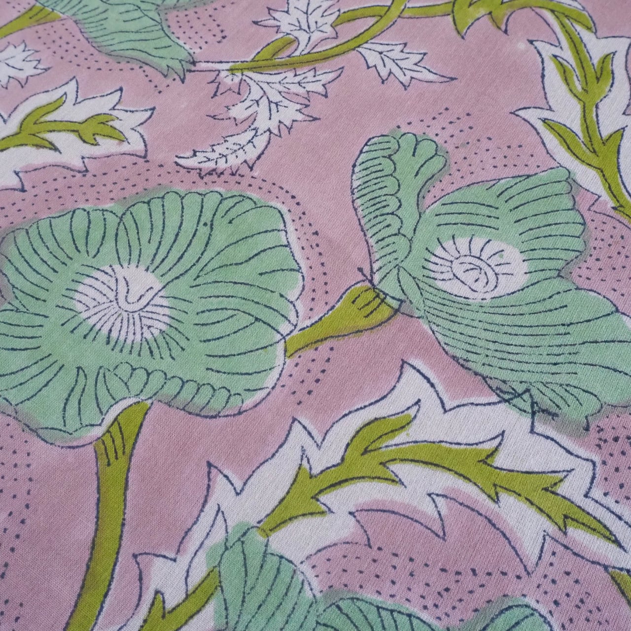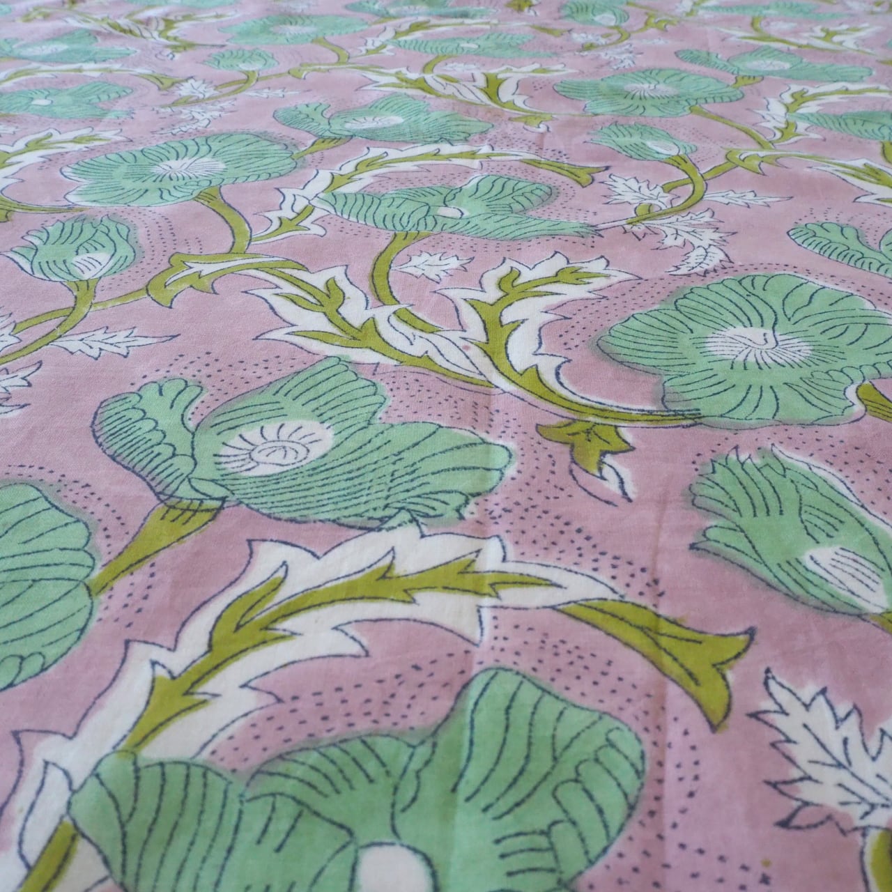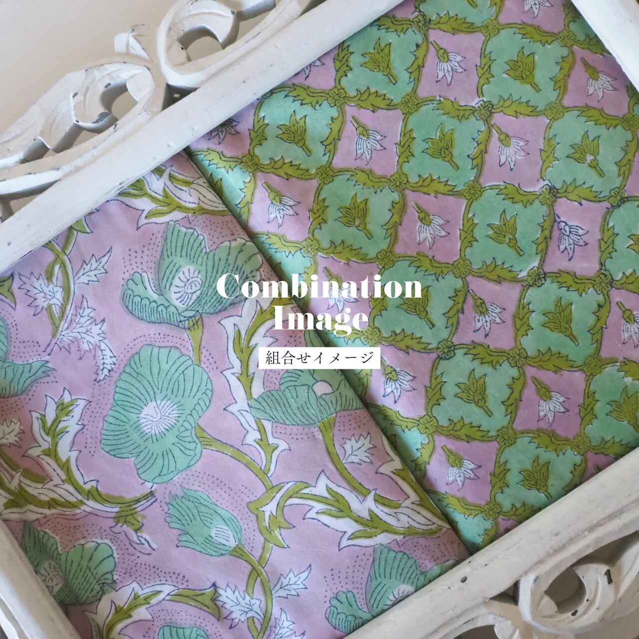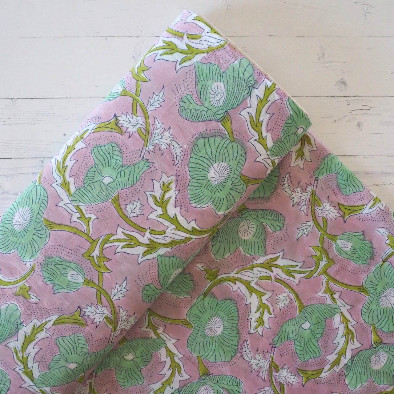 ブロックプリント生地【50cm単位】インド綿 花柄 くすみピンク×グリーン #51715-PK3