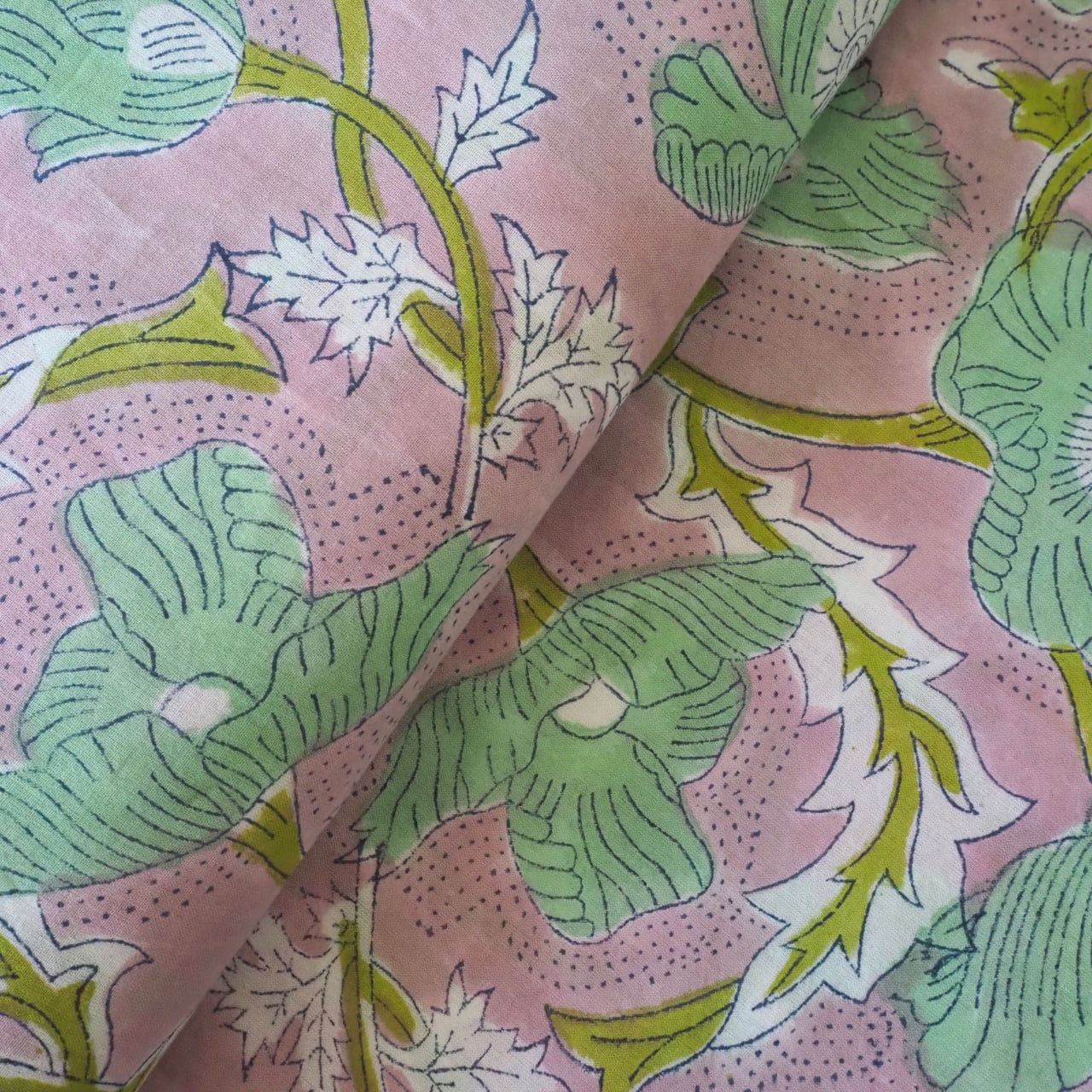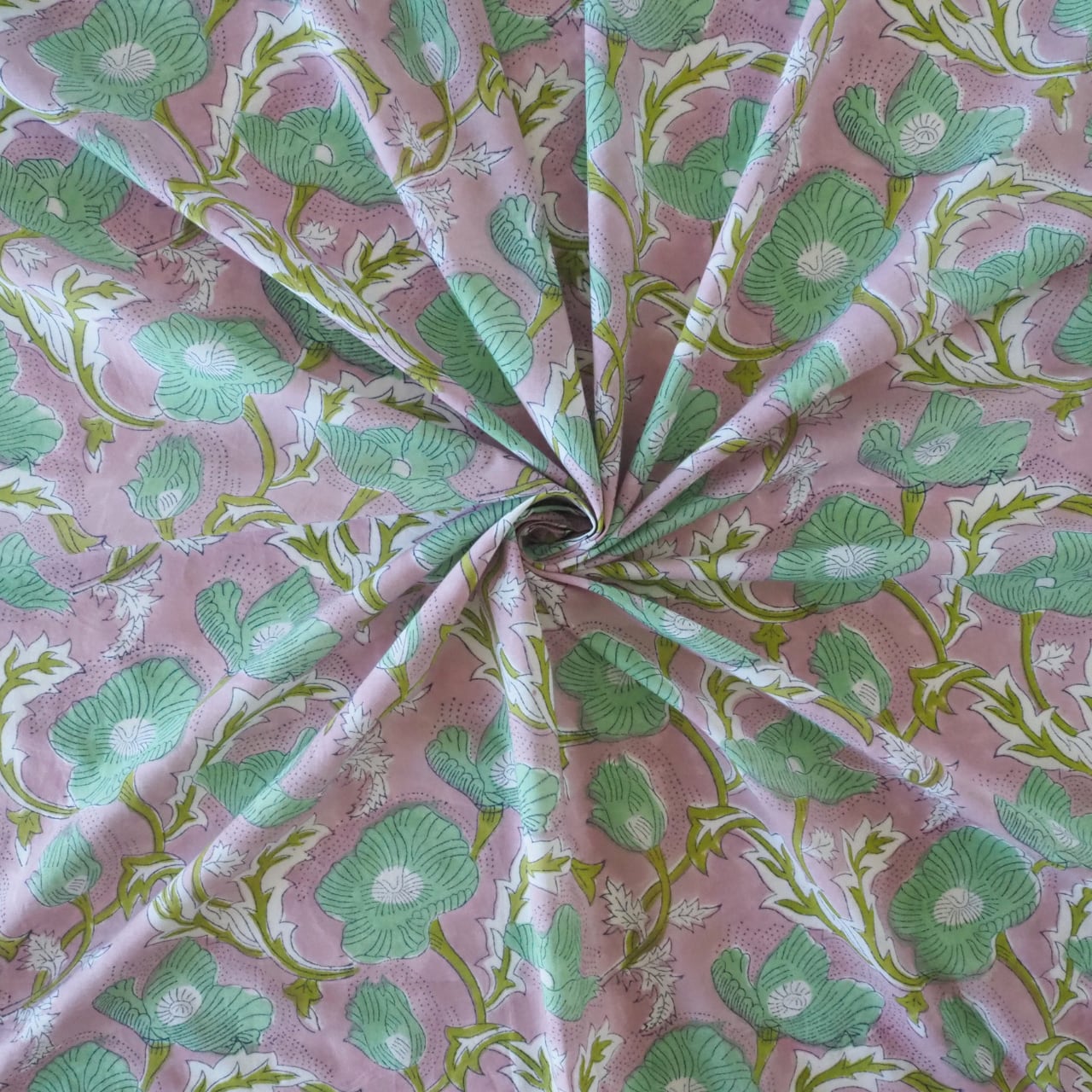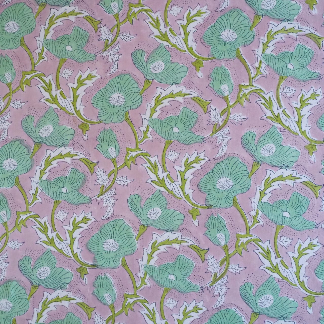 ブロックプリント生地【50cm単位】インド綿 花柄 くすみピンク×グリーン #51715-PK3