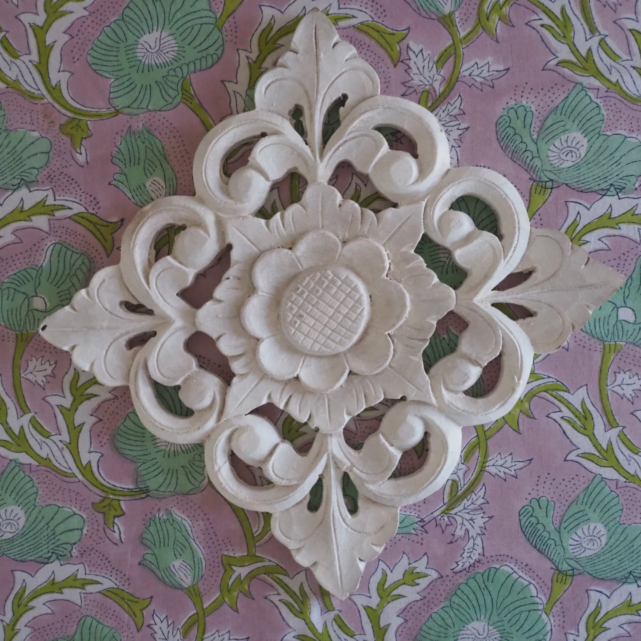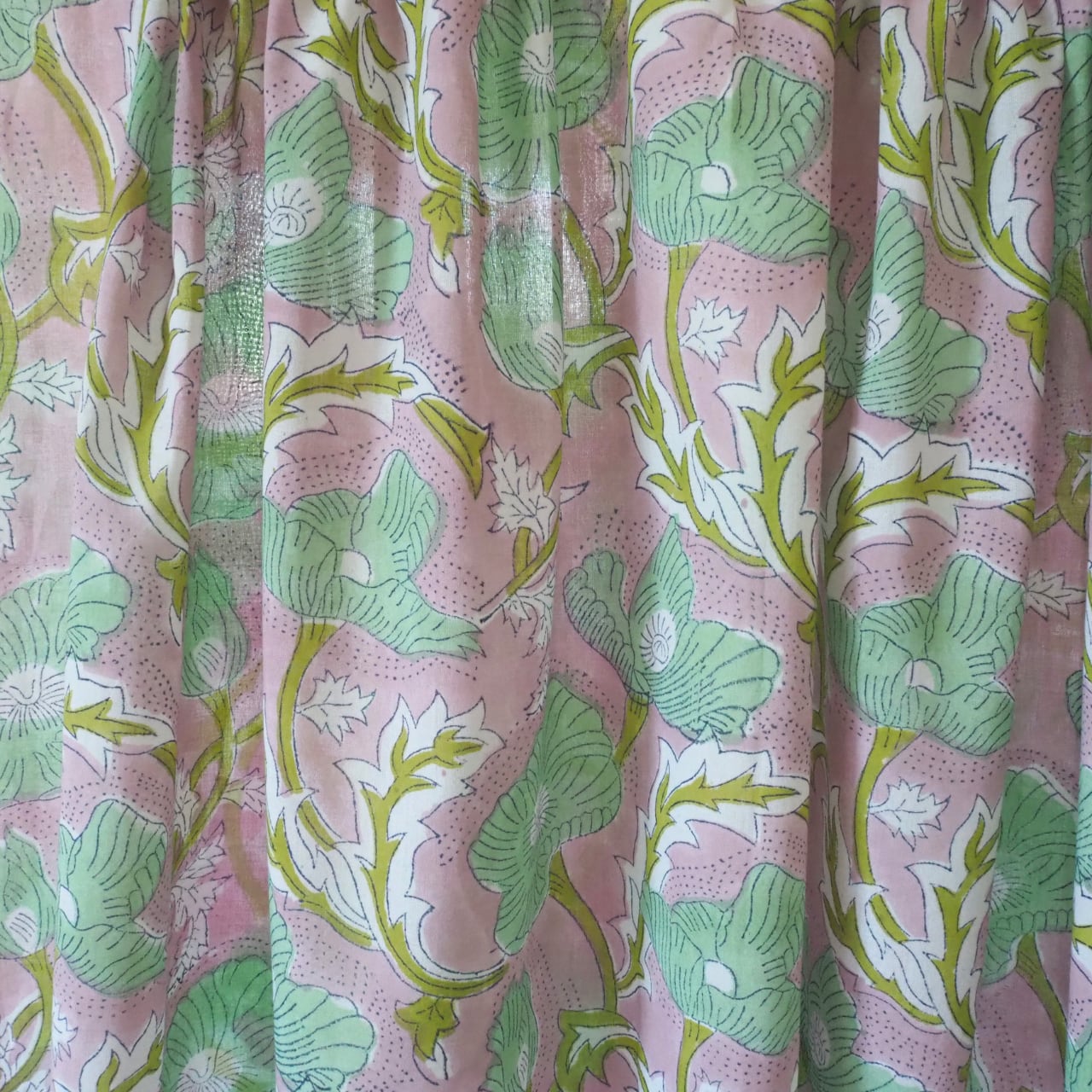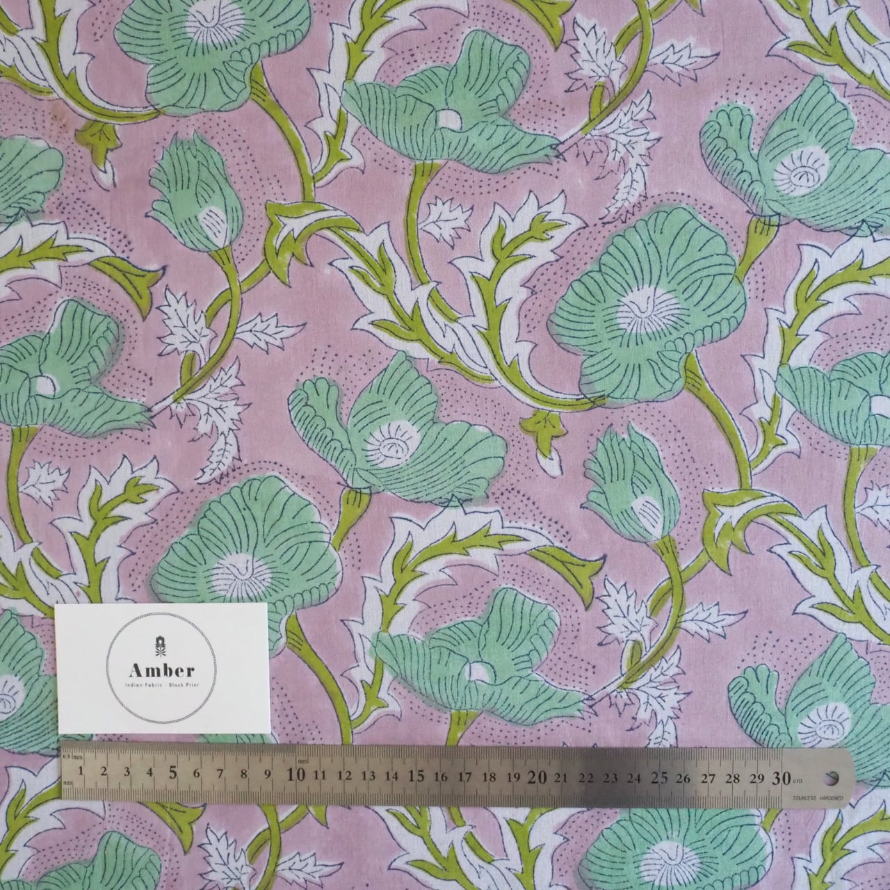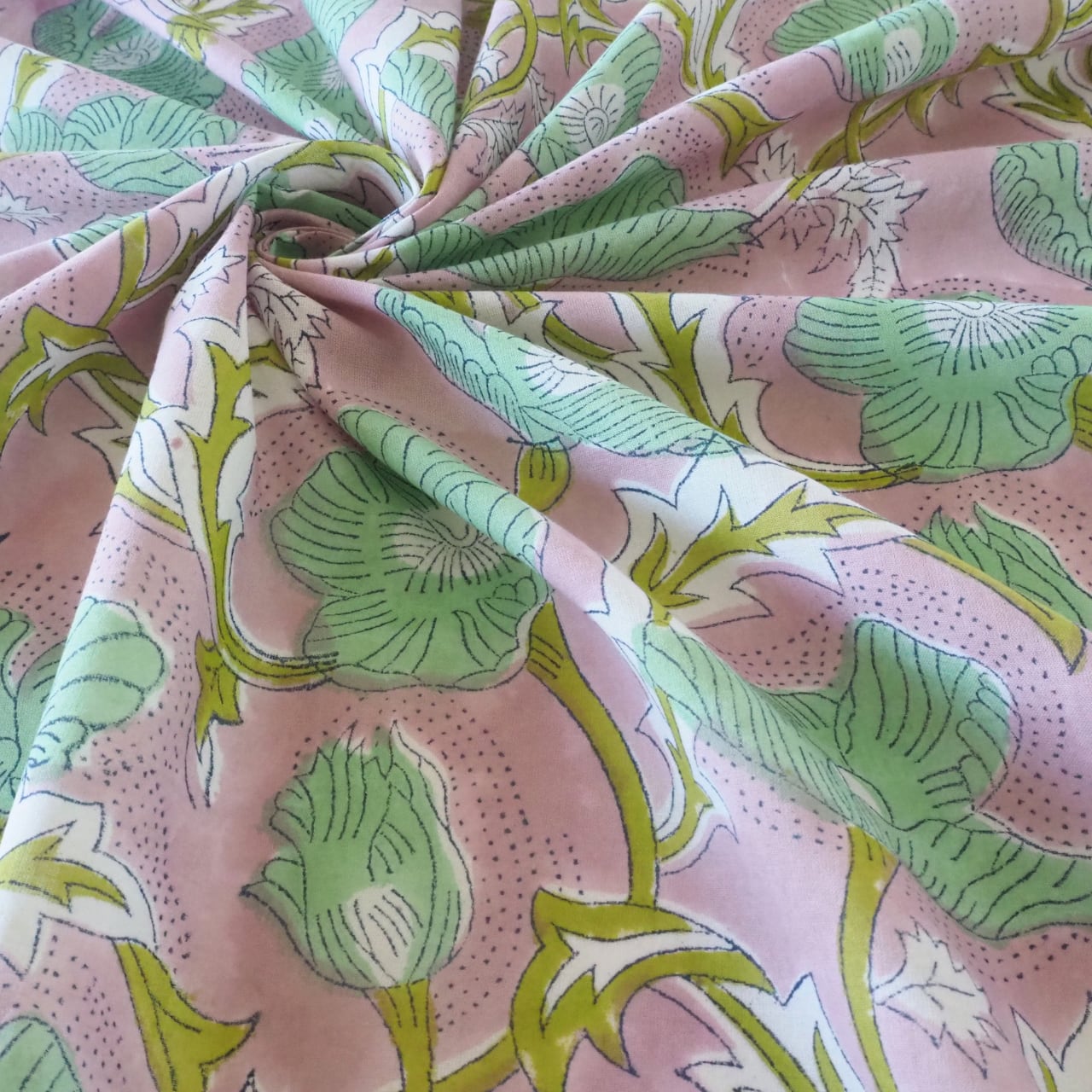 ブロックプリント生地【50cm単位】インド綿 花柄 くすみピンク×グリーン #51715-PK3