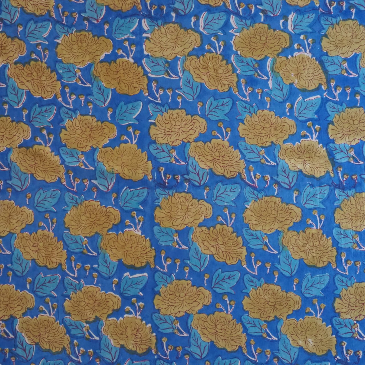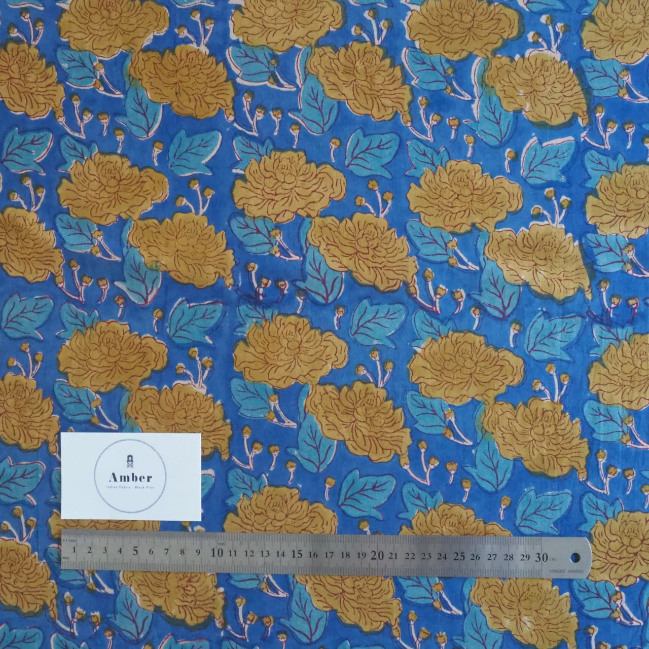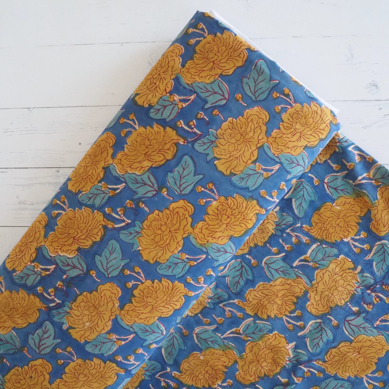 ブロックプリント生地【50cm単位】インド綿 花柄 ブルー×黄色 #52516-BL1