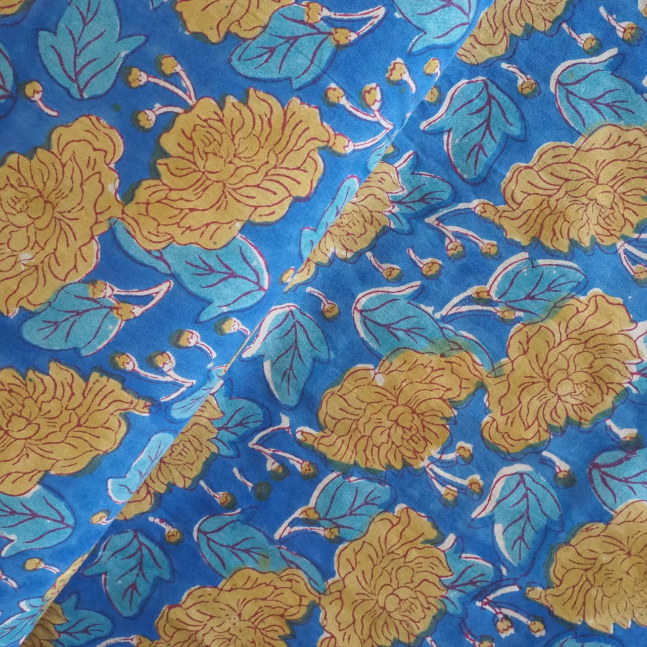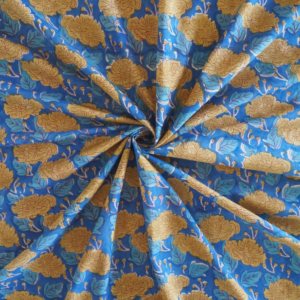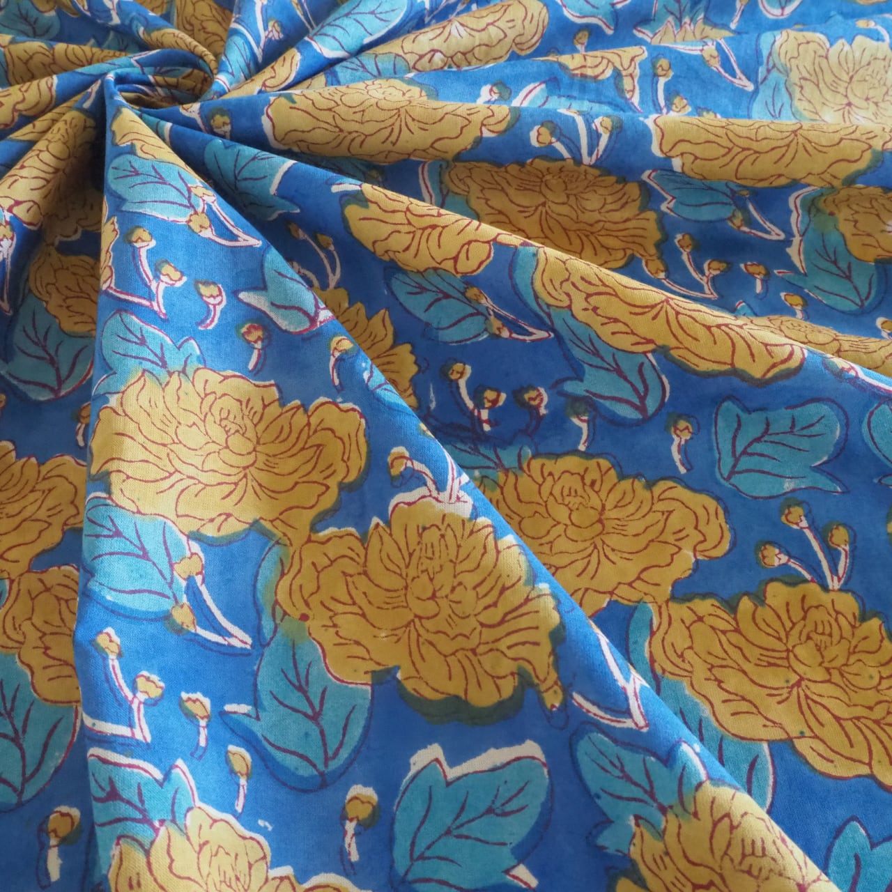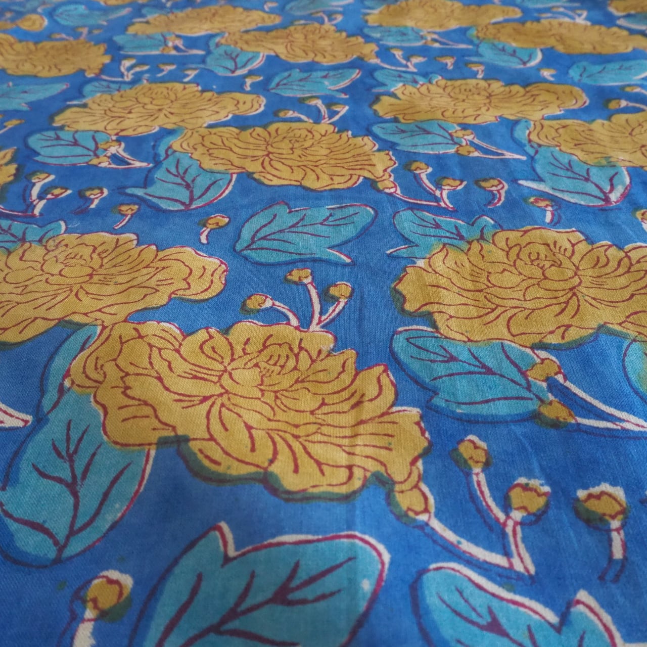 ブロックプリント生地【50cm単位】インド綿 花柄 ブルー×黄色 #52516-BL1