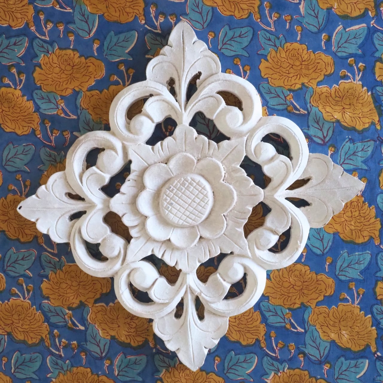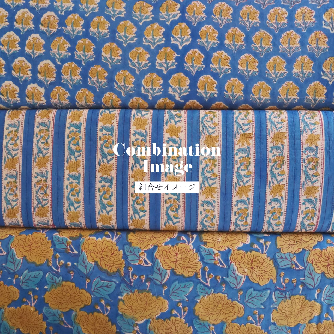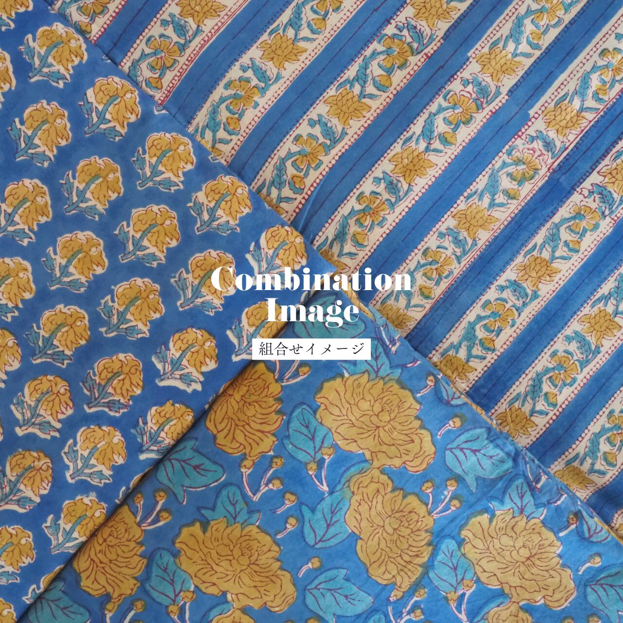 ハンドブロックプリントと呼ばれるインドのジャイプール地方に古くから伝わる伝統的な技法で、木彫りのスタンプで色を何度も重ね、全ての工程がインドの職人さんの手作業によって仕上がるAll Handmadeの生地です。