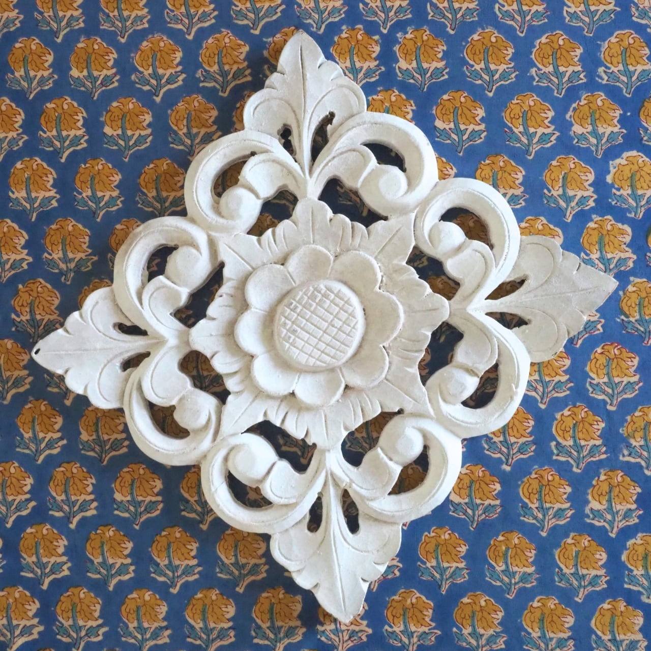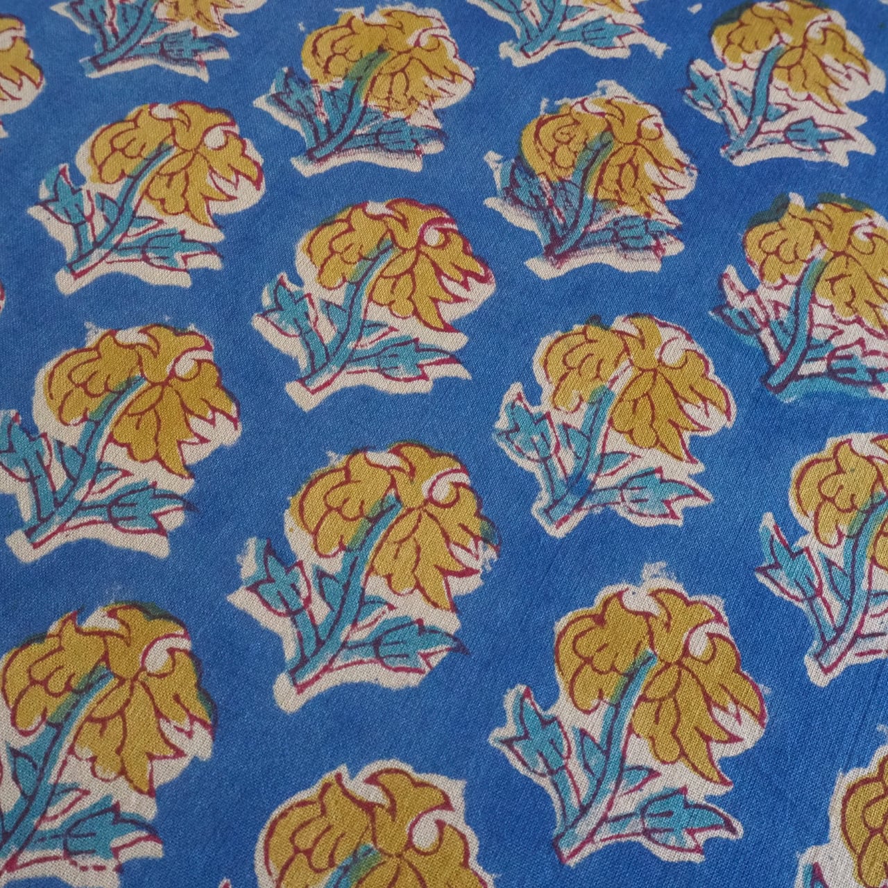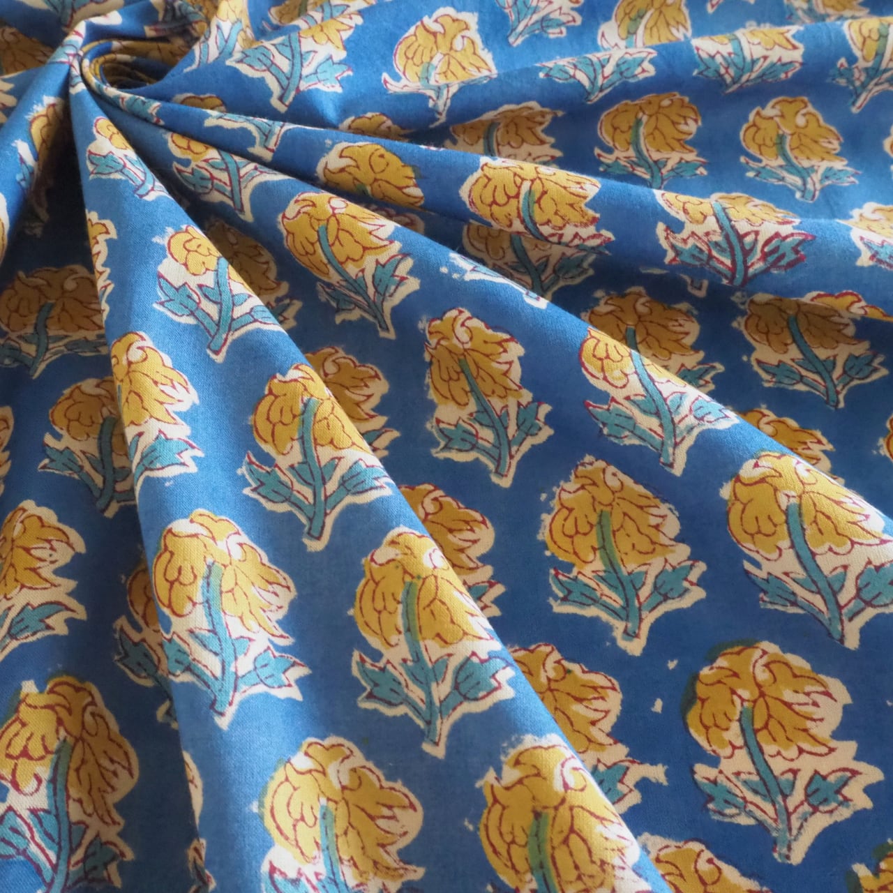 ハンドブロックプリントと呼ばれるインドのジャイプール地方に古くから伝わる伝統的な技法で、木彫りのスタンプで色を何度も重ね、全ての工程がインドの職人さんの手作業によって仕上がるAll Handmadeの生地です。
