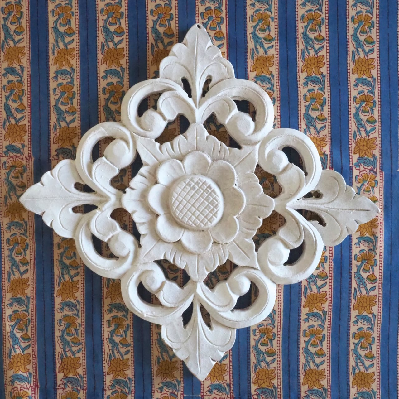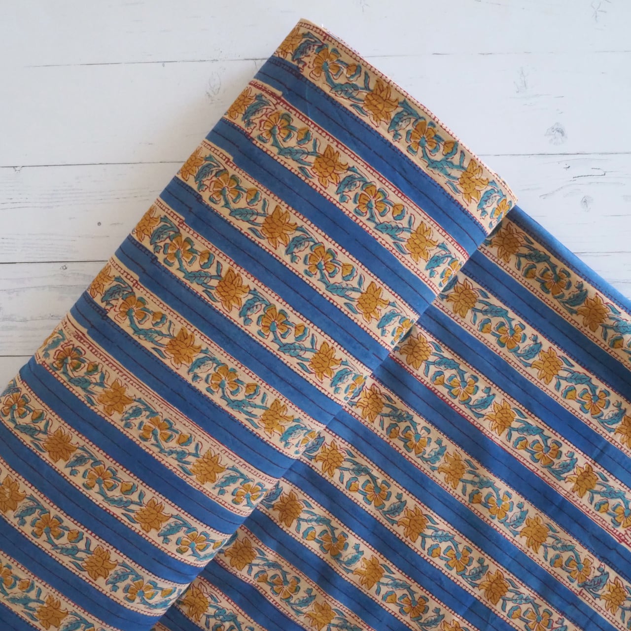 ハンドブロックプリントと呼ばれるインドのジャイプール地方に古くから伝わる伝統的な技法で、木彫りのスタンプで色を何度も重ね、全ての工程がインドの職人さんの手作業によって仕上がるAll Handmadeの生地です。