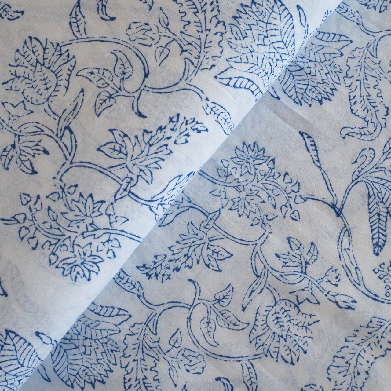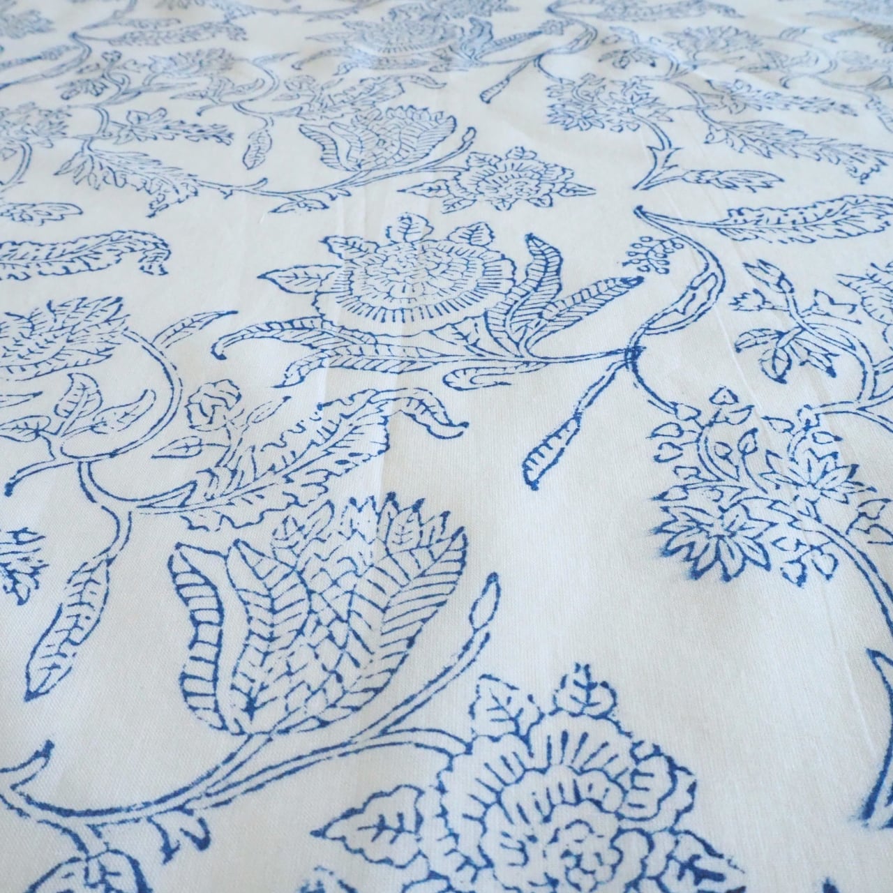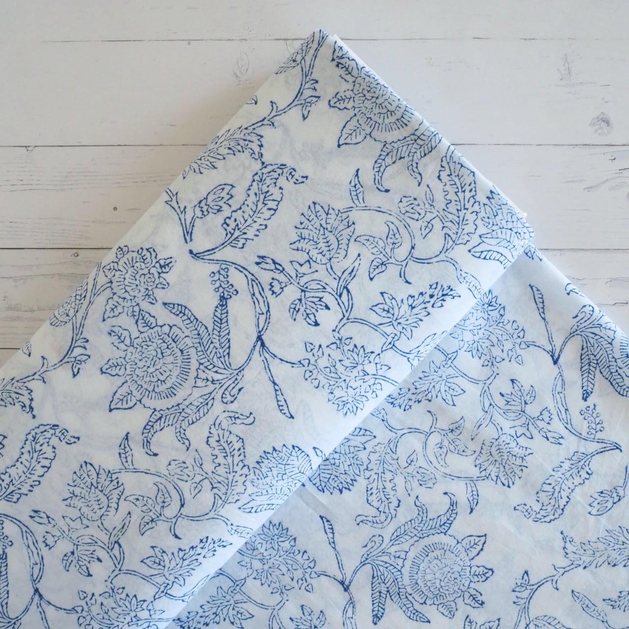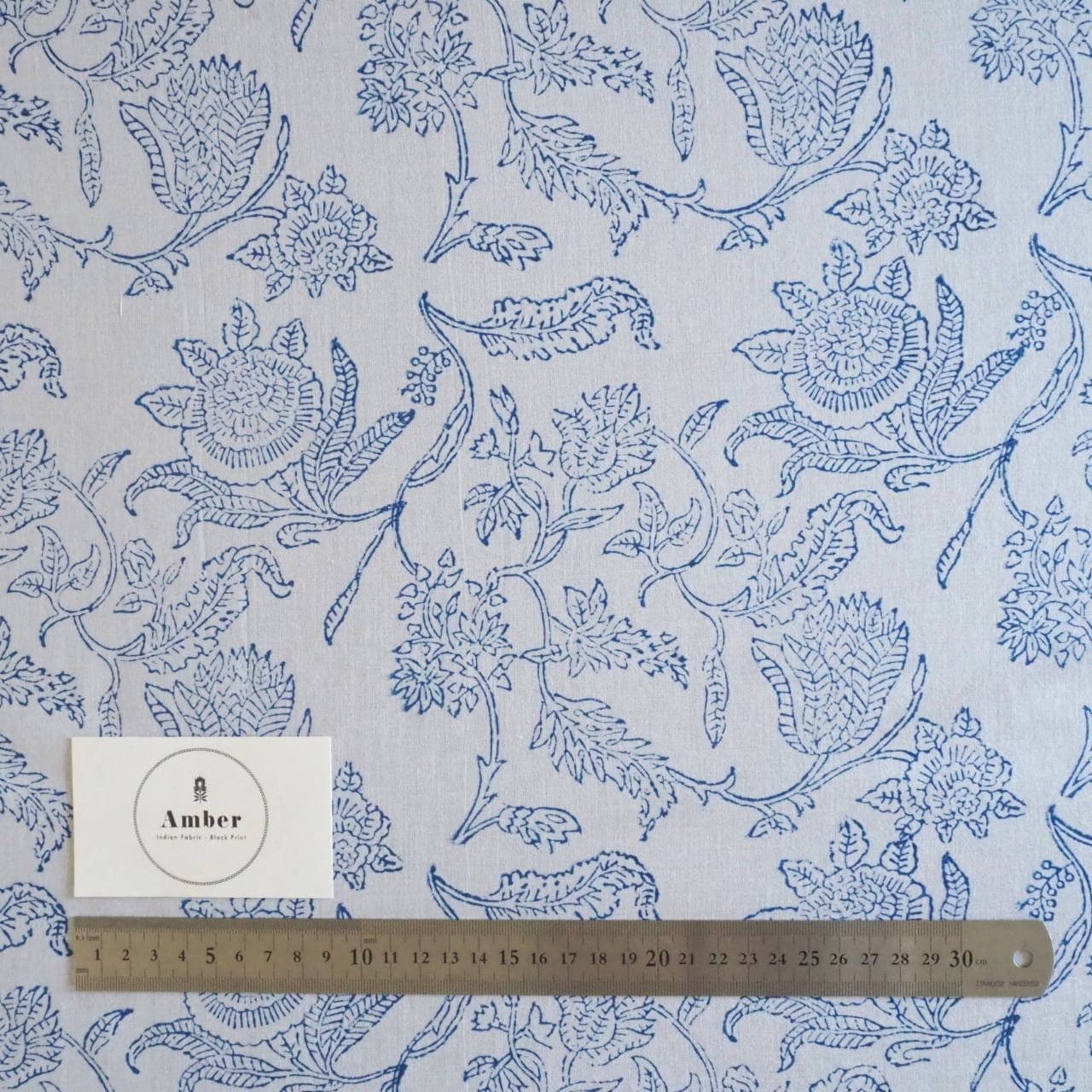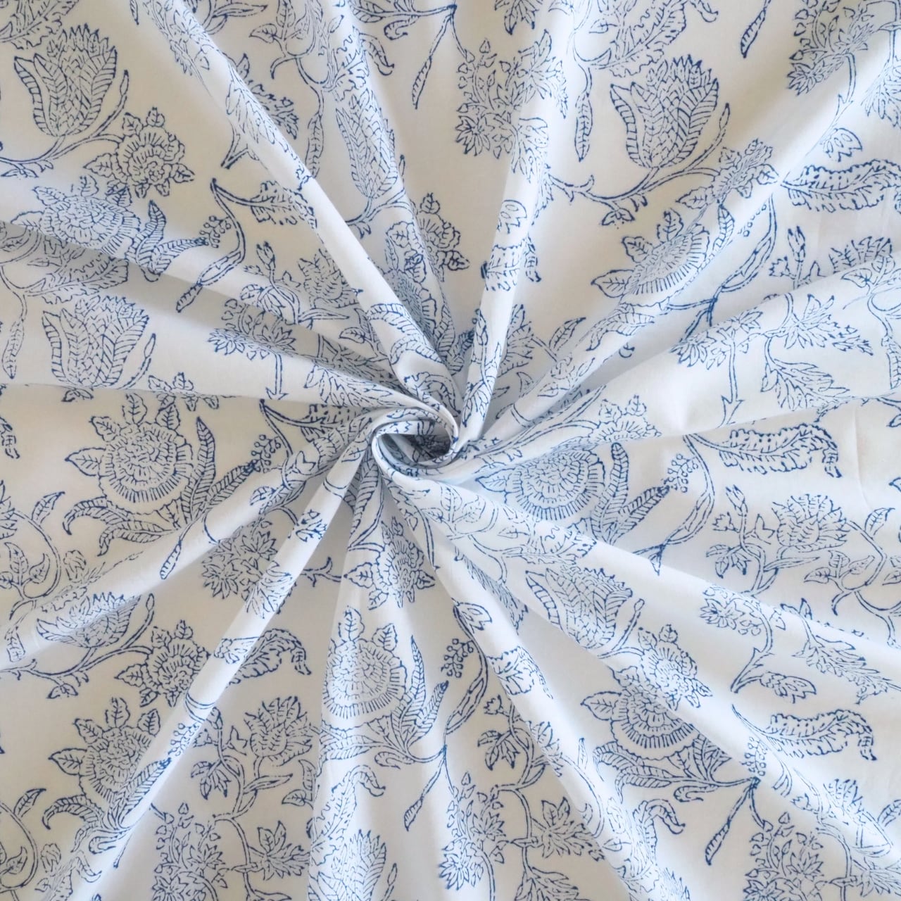 ブロックプリント生地【50cm単位】インド綿 花柄 白×ブルー #52810-WT1