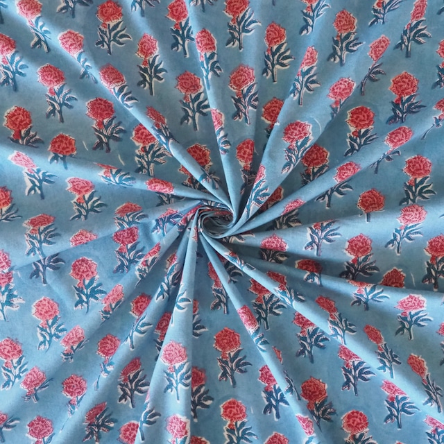 ハンドブロックプリントと呼ばれるインドのジャイプール地方に古くから伝わる伝統的な技法で、木彫りのスタンプで色を何度も重ね、全ての工程がインドの職人さんの手作業によって仕上がるAll Handmadeの生地です。