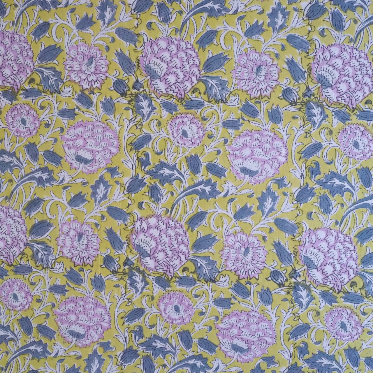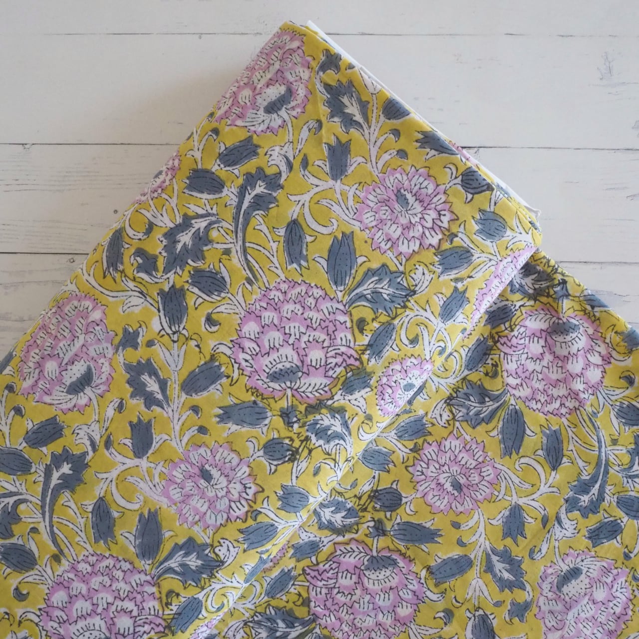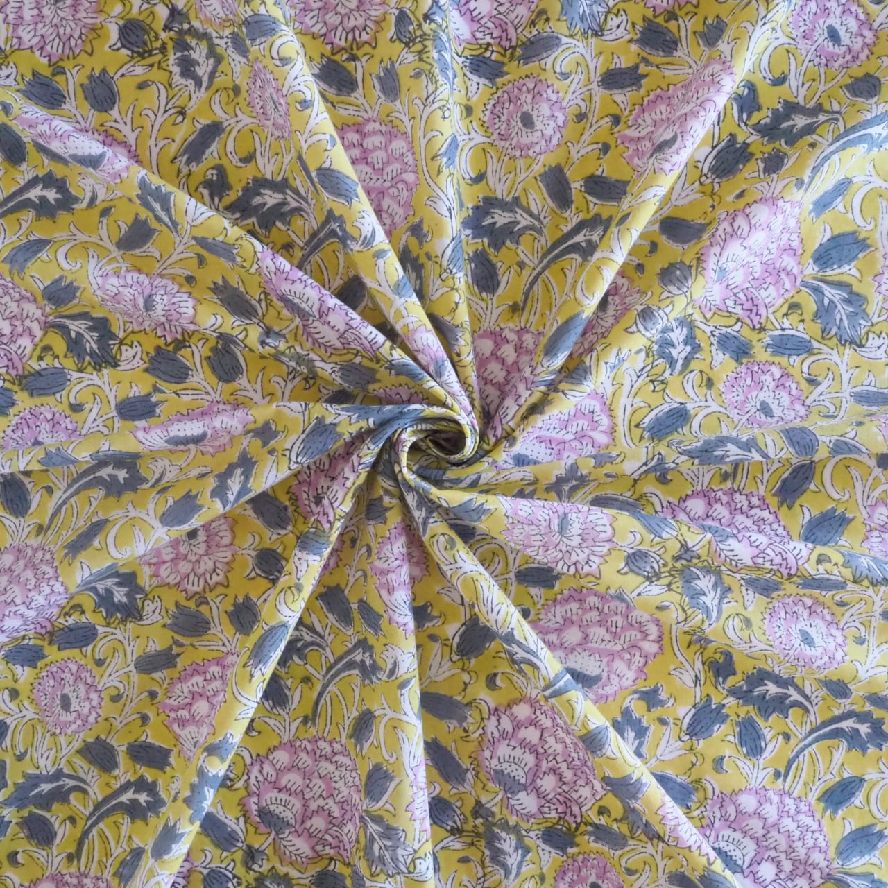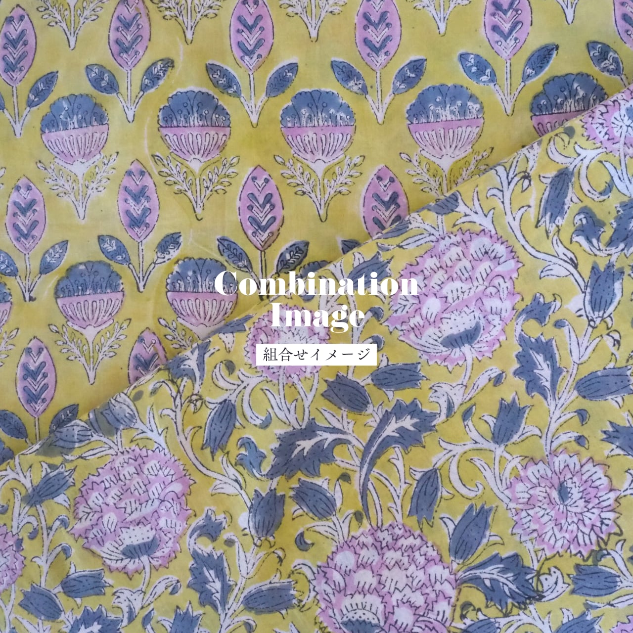 ブロックプリント生地【50cm単位】インド綿 花柄A 黄色×ピンク×グレー #52917-YL1