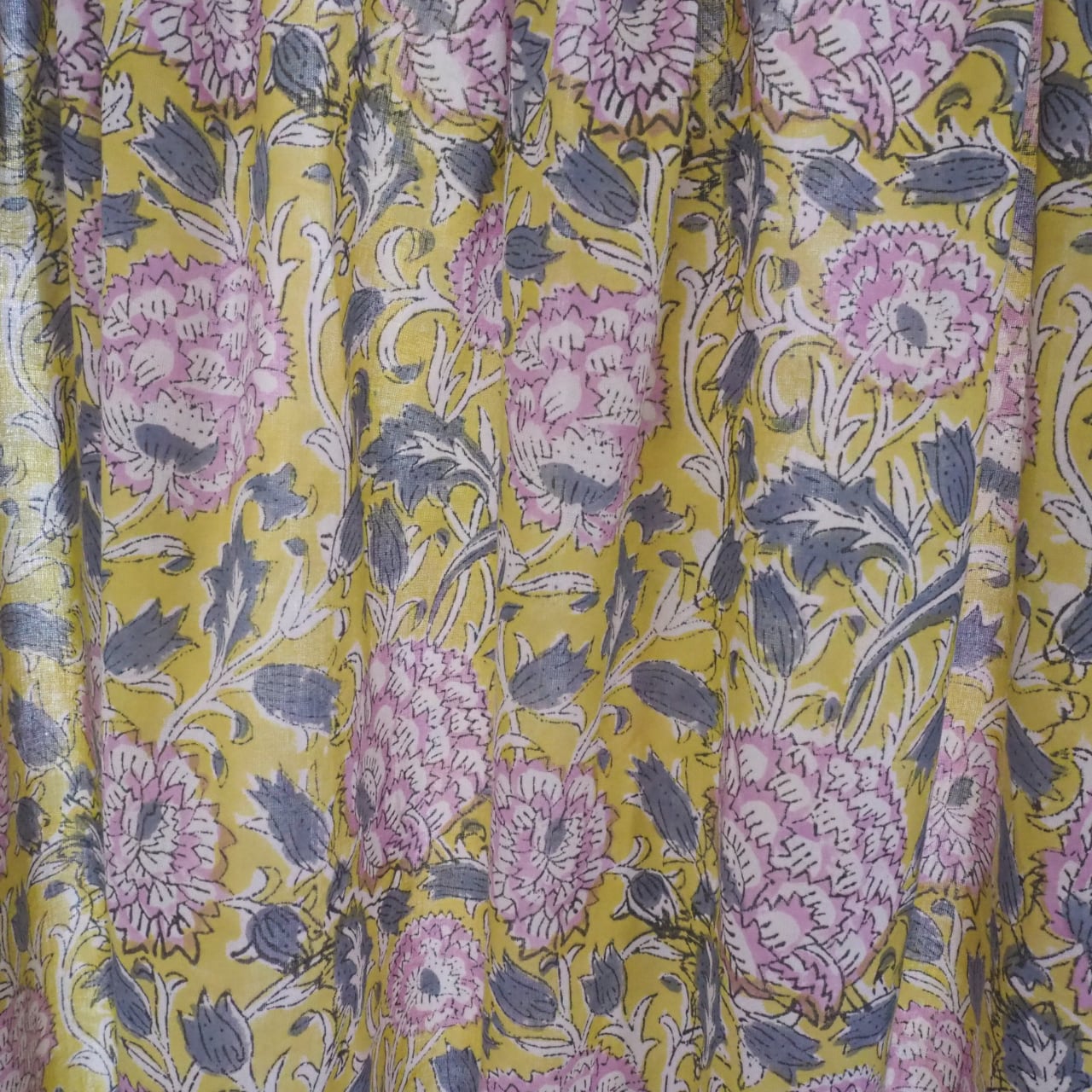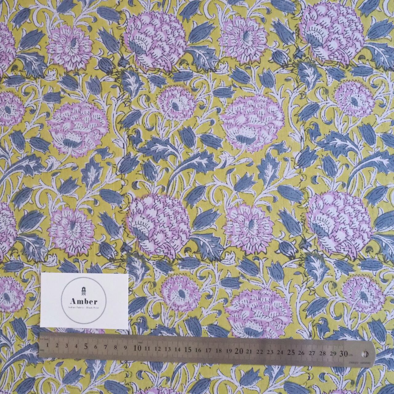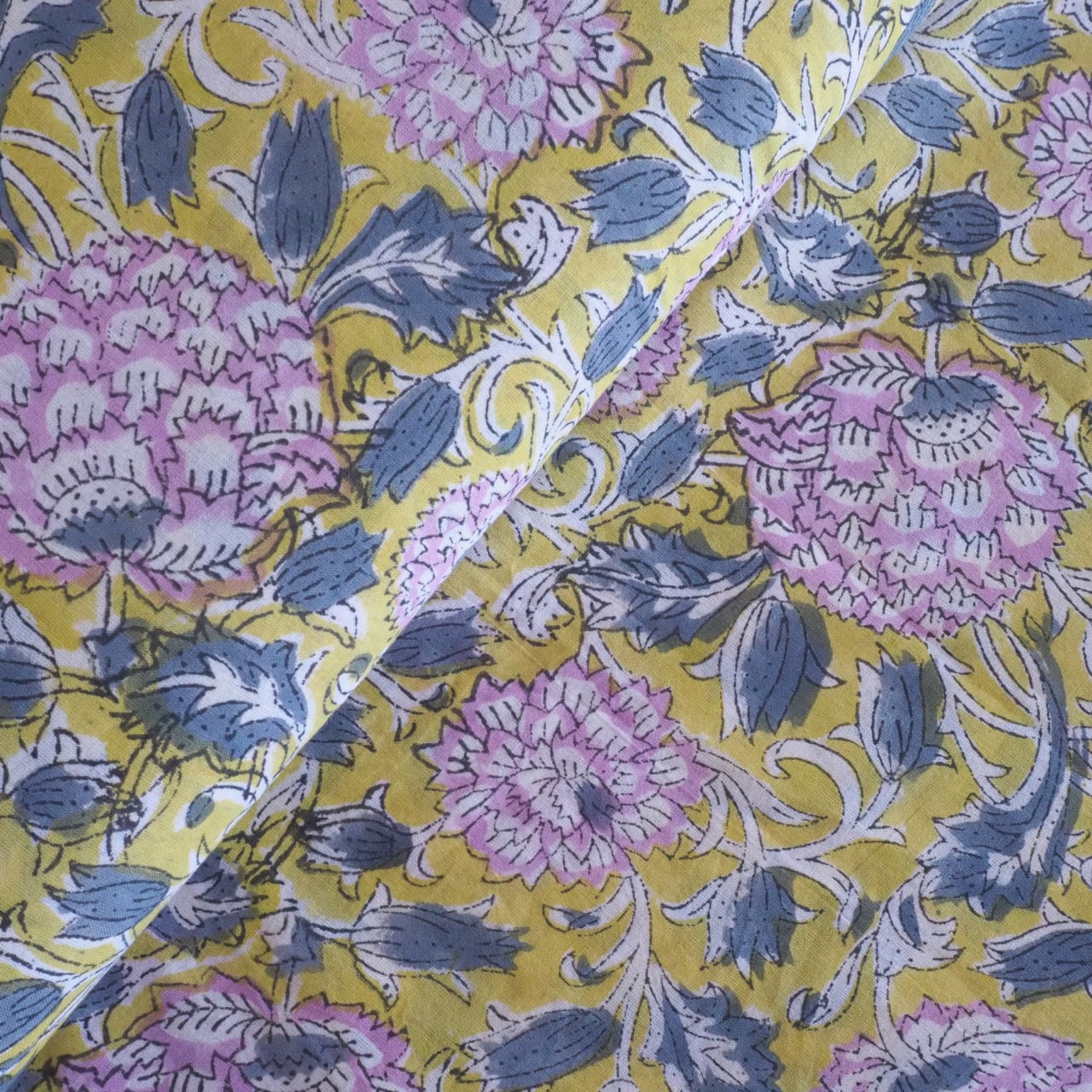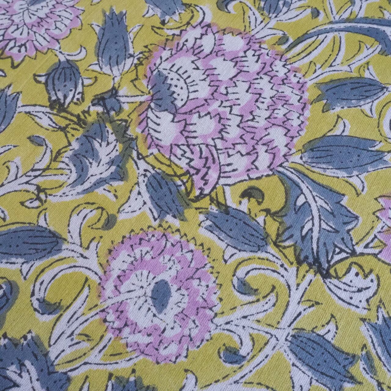 ブロックプリント生地【50cm単位】インド綿 花柄A 黄色×ピンク×グレー #52917-YL1