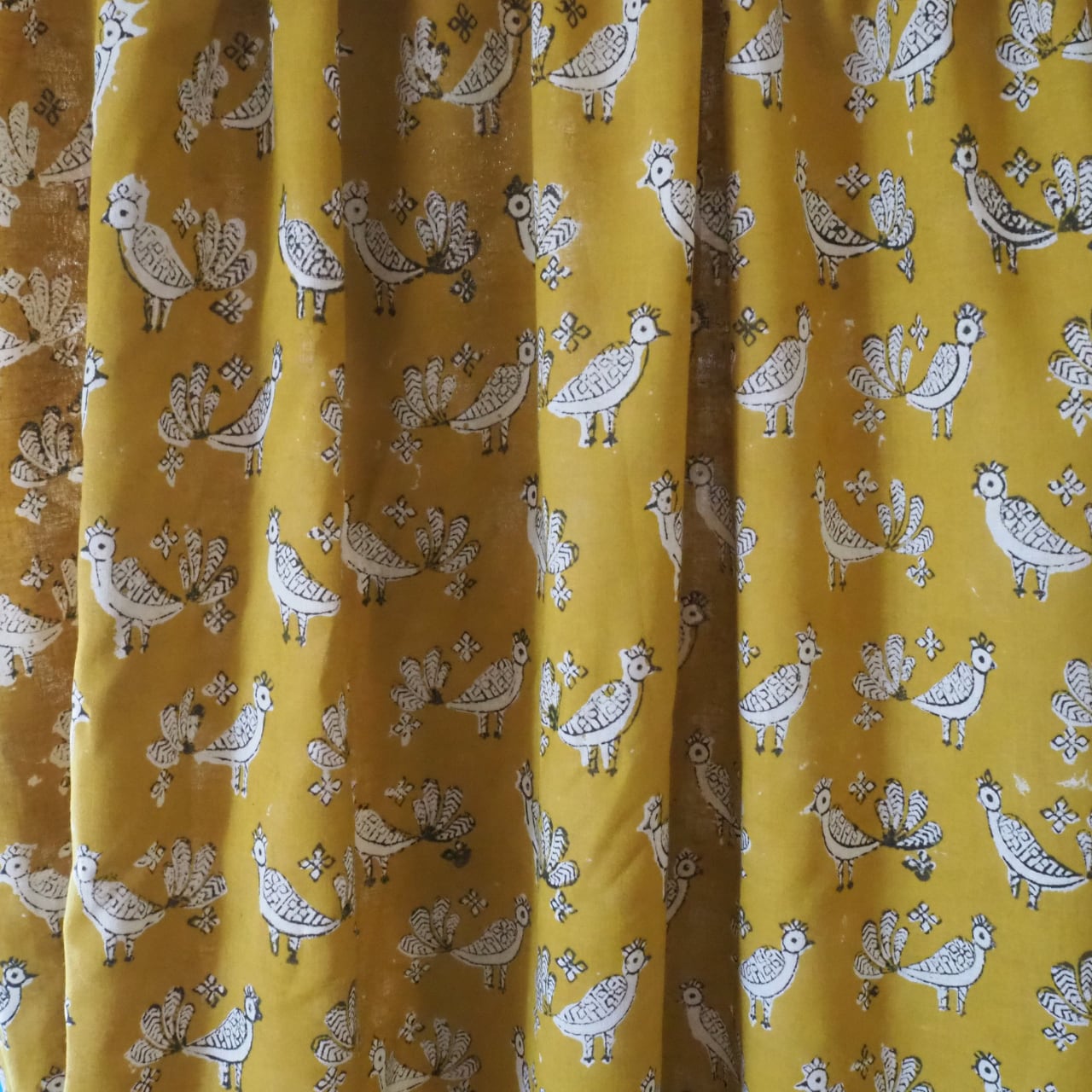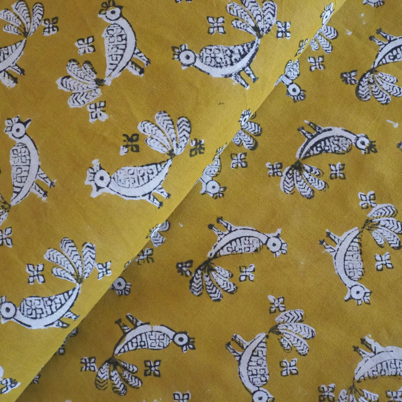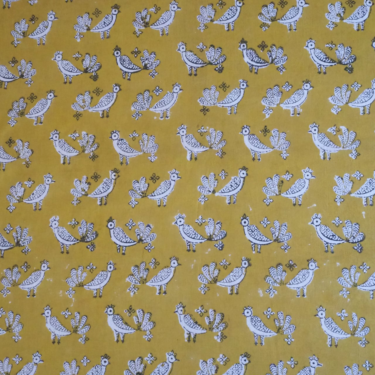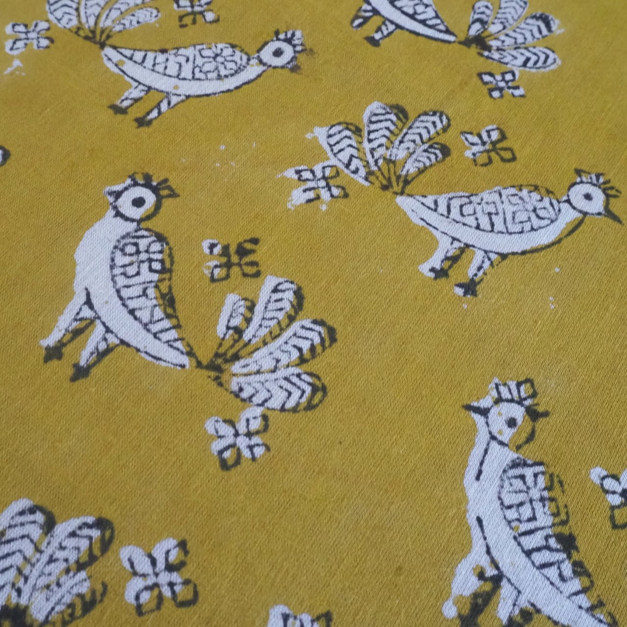 ブロックプリント生地【50cm単位】インド綿 Bird柄 イエロー #53310-YL1