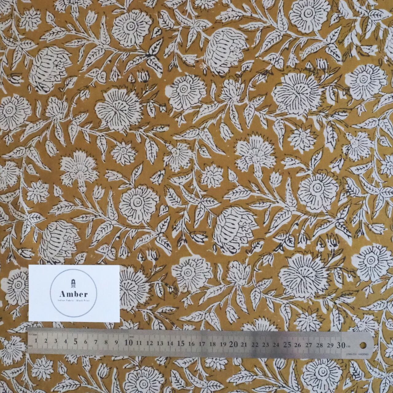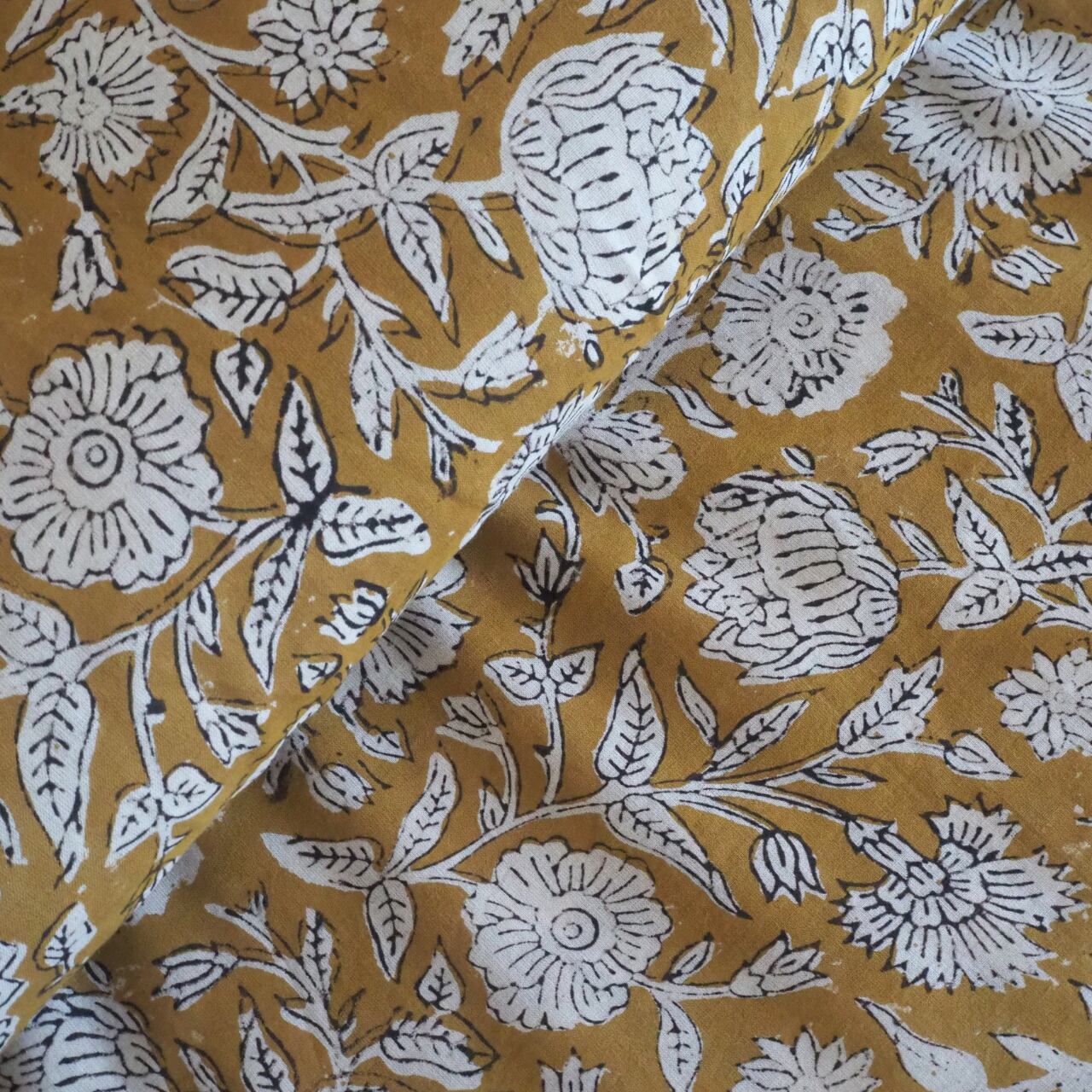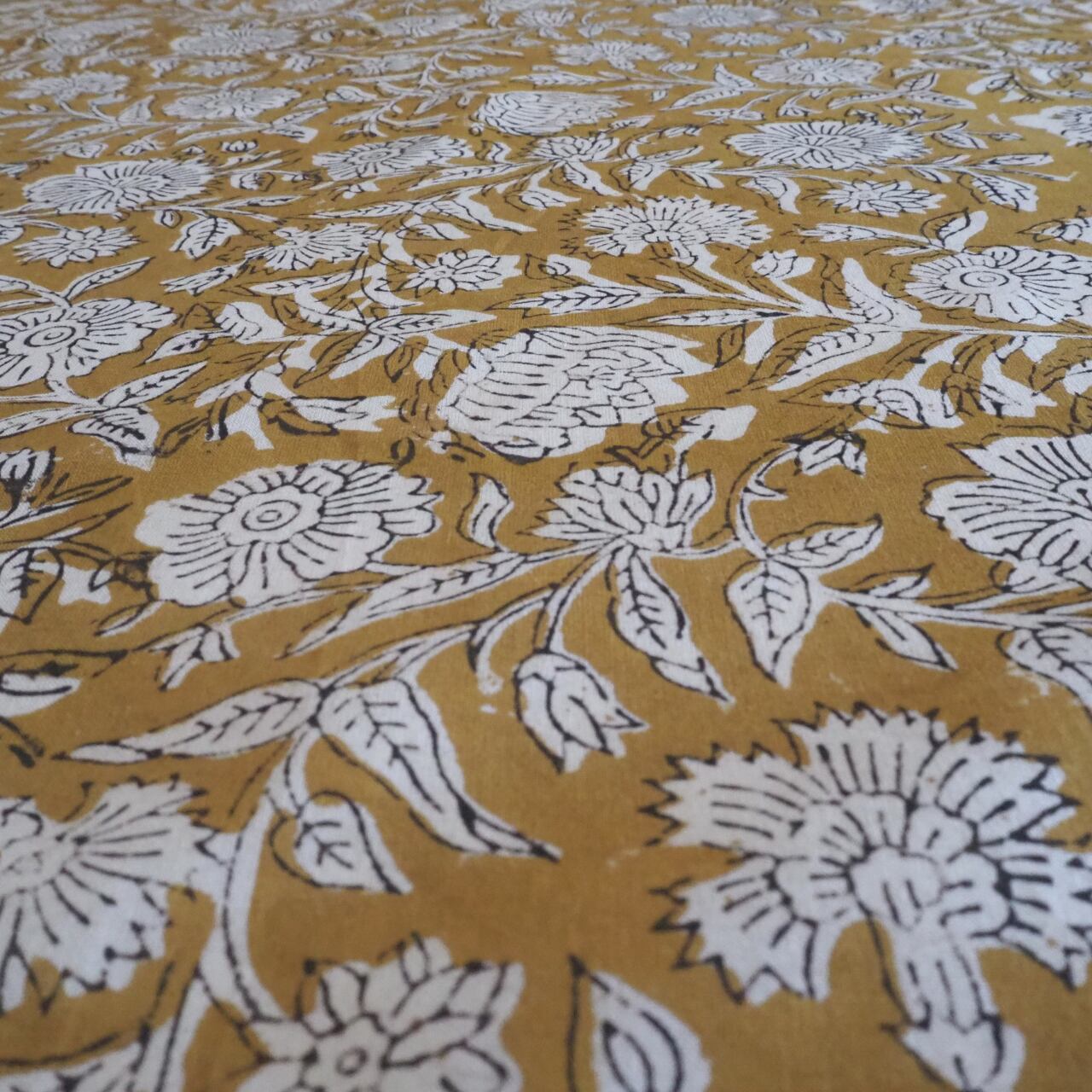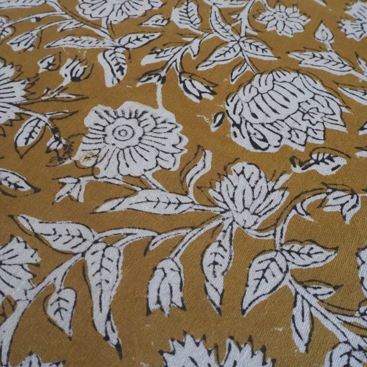 ブロックプリント生地【50cm単位】インド綿 花柄 イエロー×生成り #53510-YL1