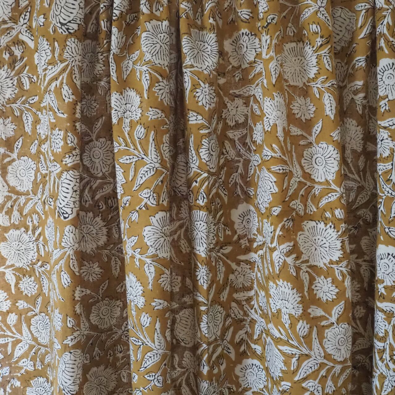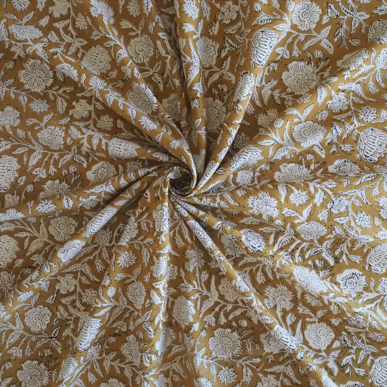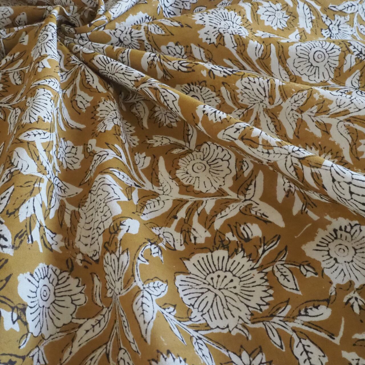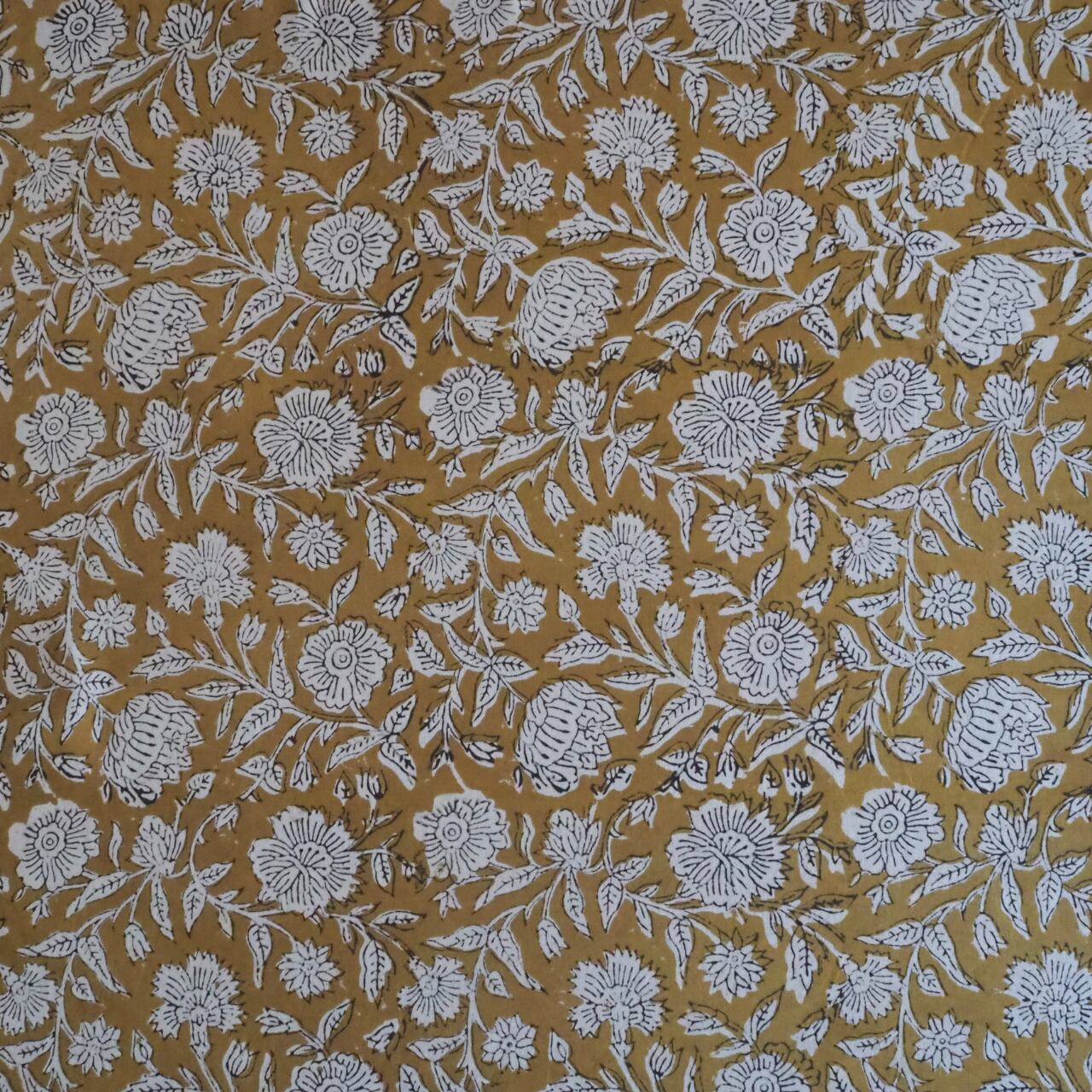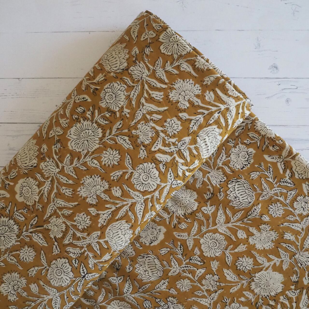 ブロックプリント生地【50cm単位】インド綿 花柄 イエロー×生成り #53510-YL1
