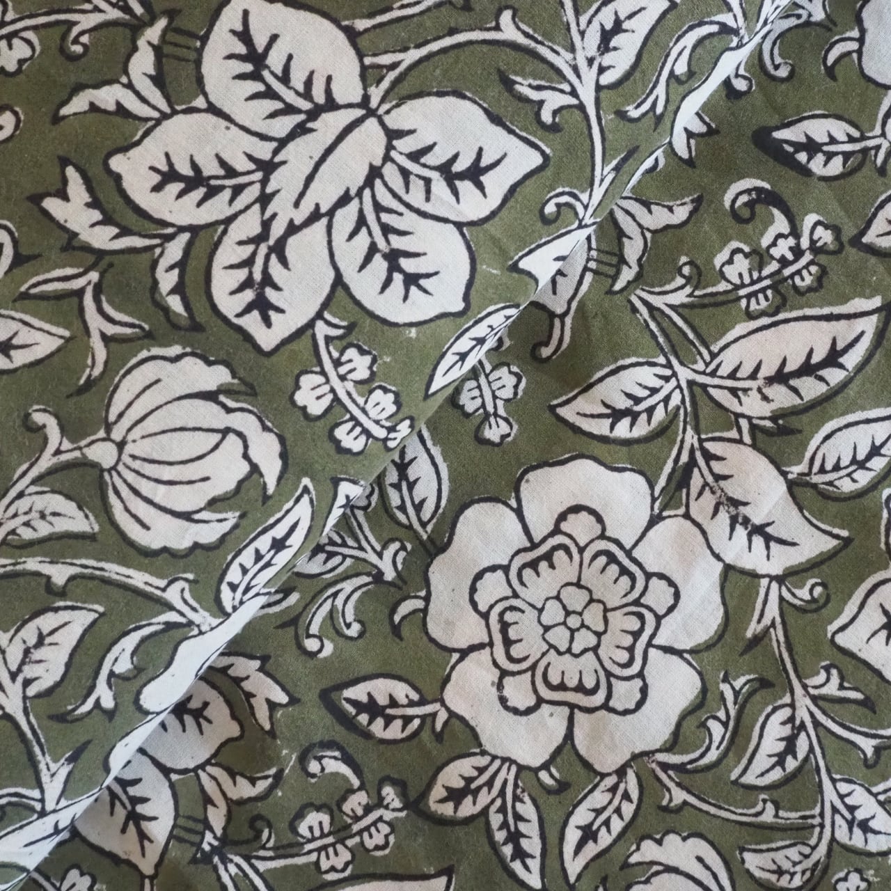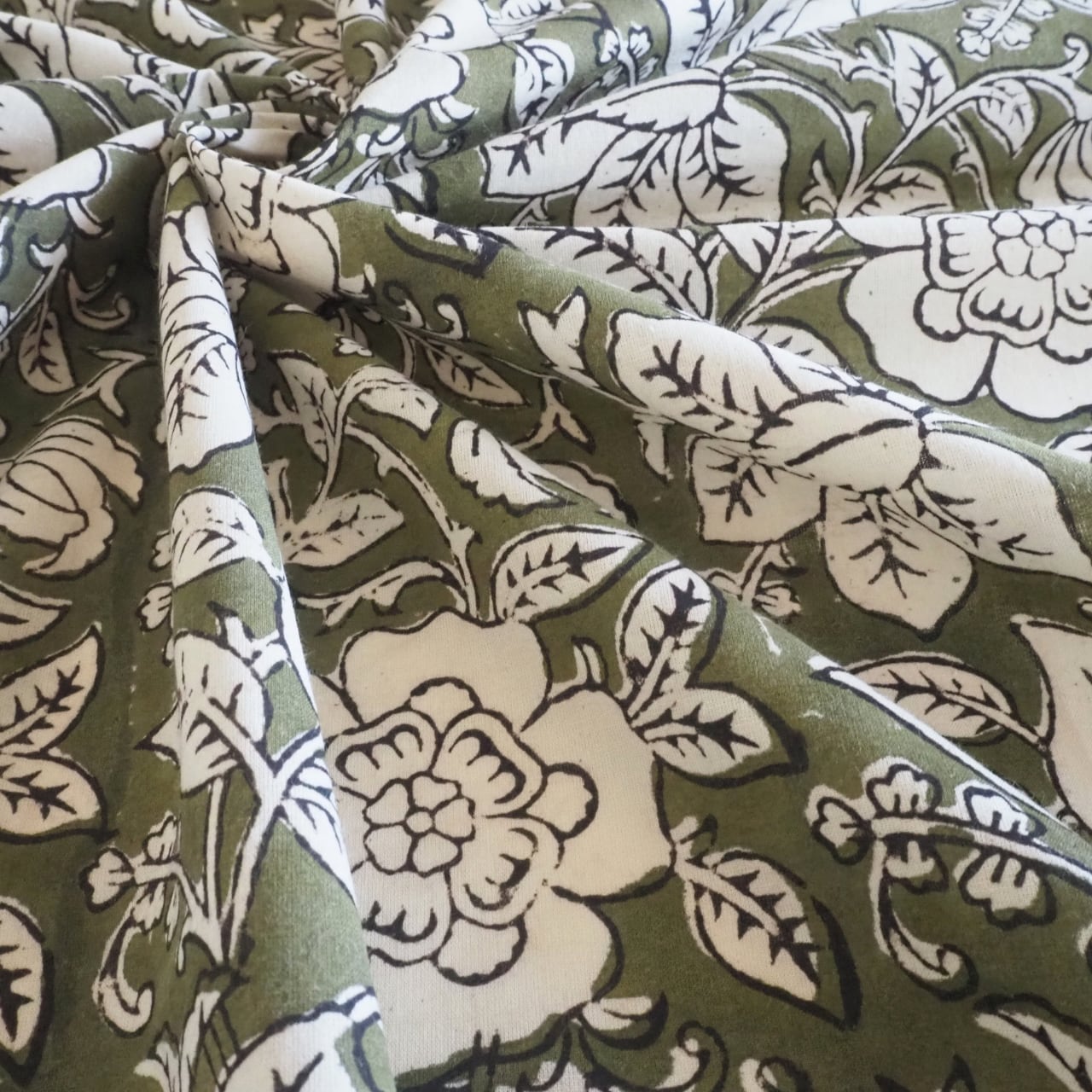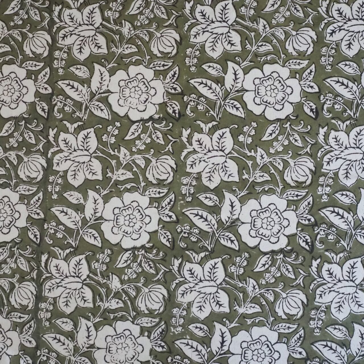 ブロックプリント生地【50cm単位】インド綿 花柄 カーキ×生成り #53610-GR1