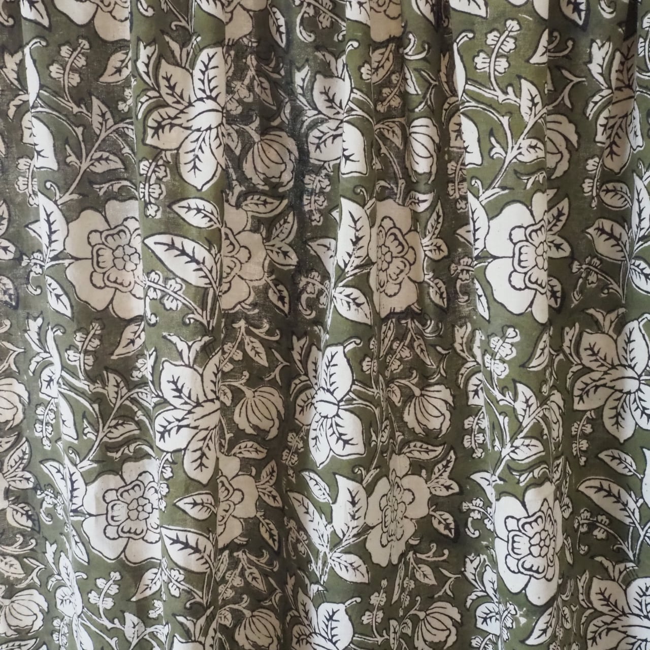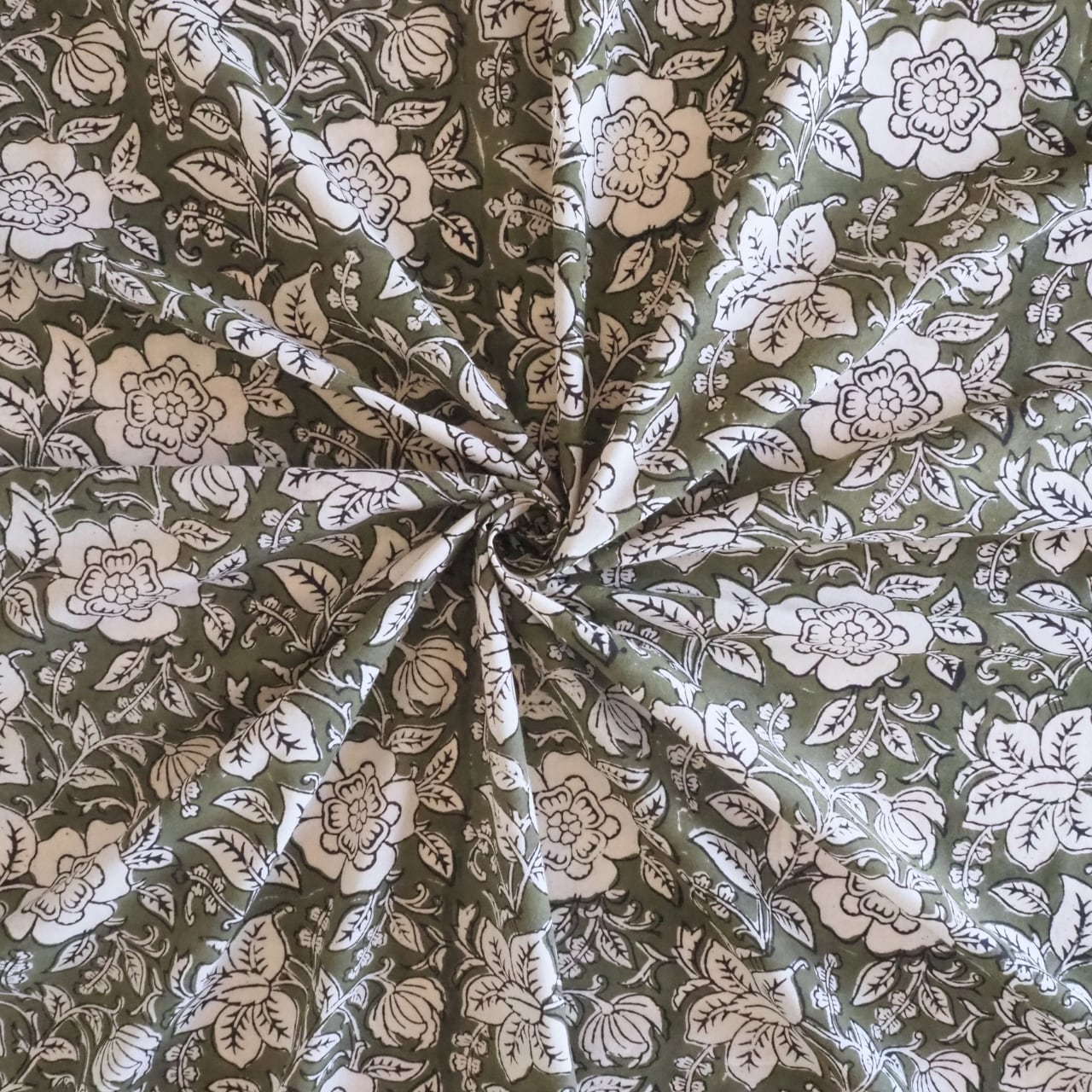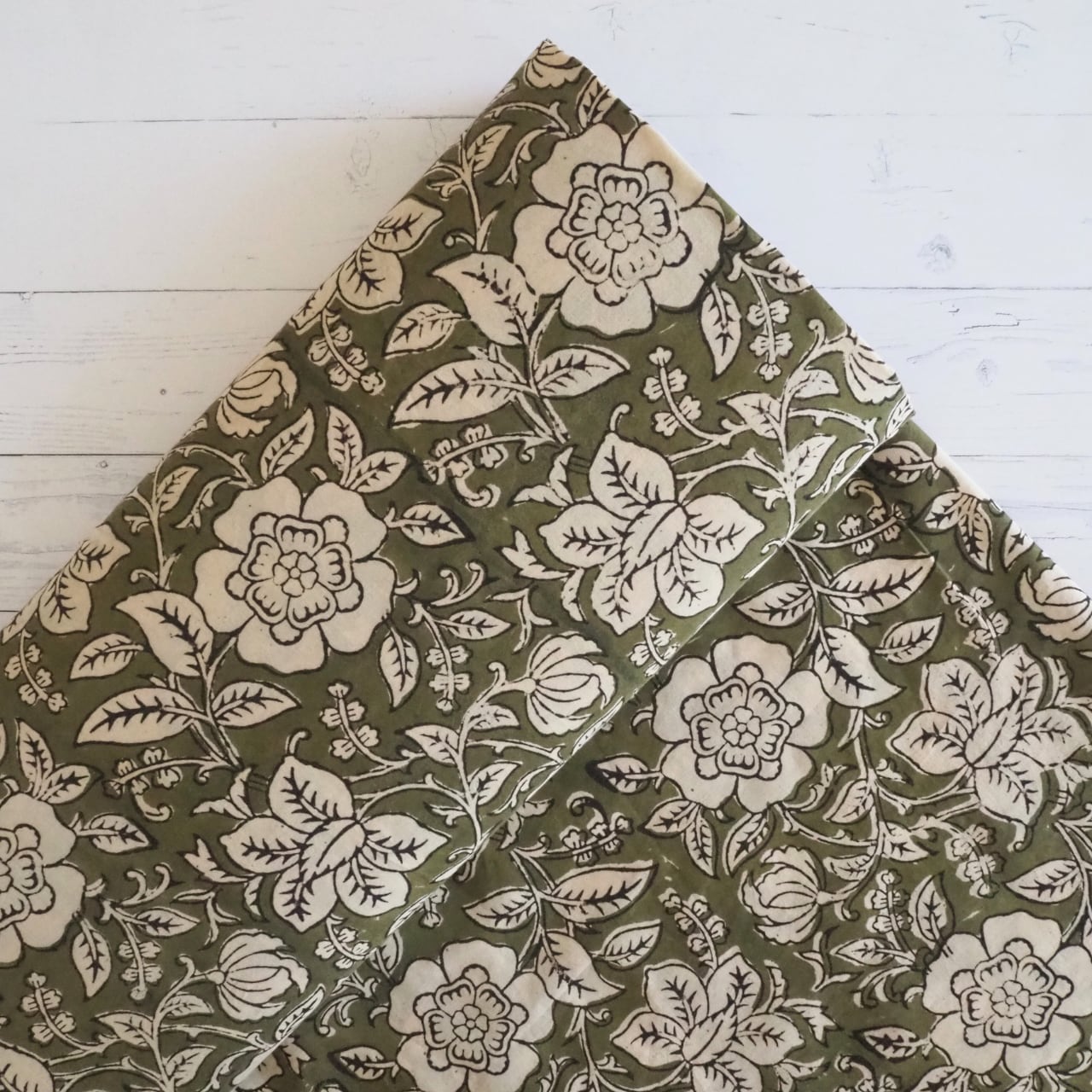 ブロックプリント生地【50cm単位】インド綿 花柄 カーキ×生成り #53610-GR1