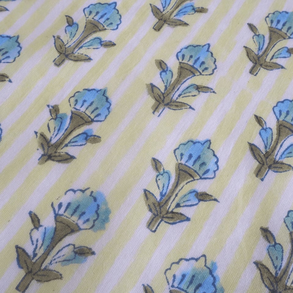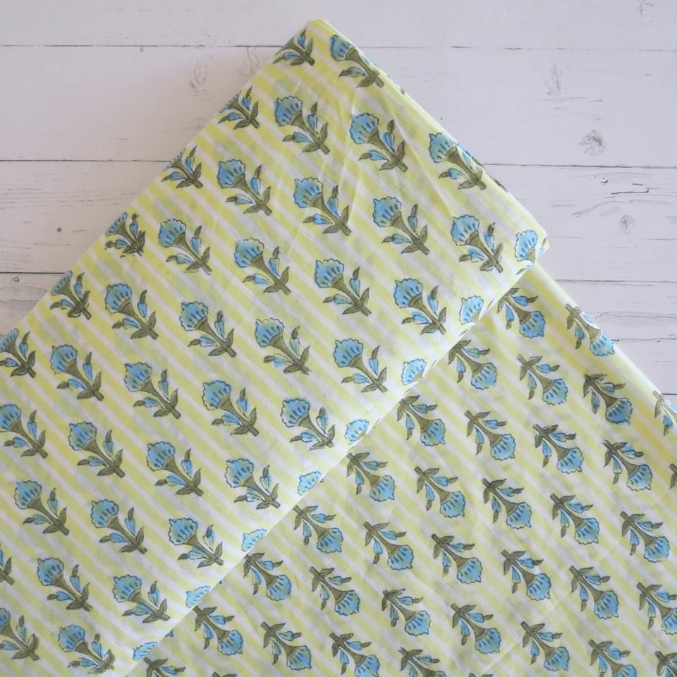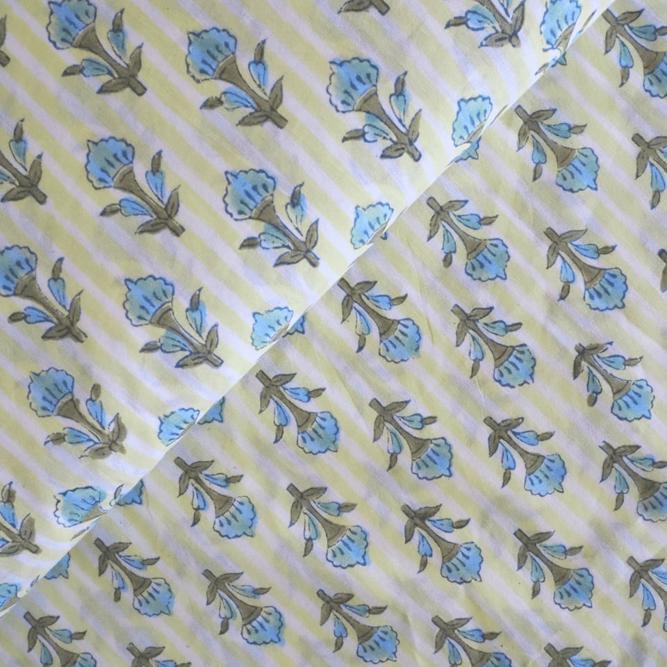 ブロックプリント生地【50cm単位】インド綿 ストライプ・小花柄 イエロー×水色 #54220-YL1