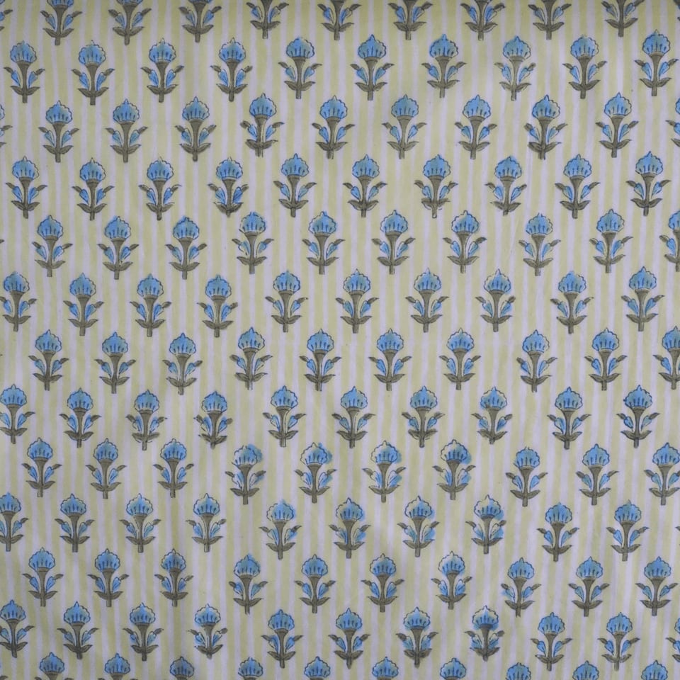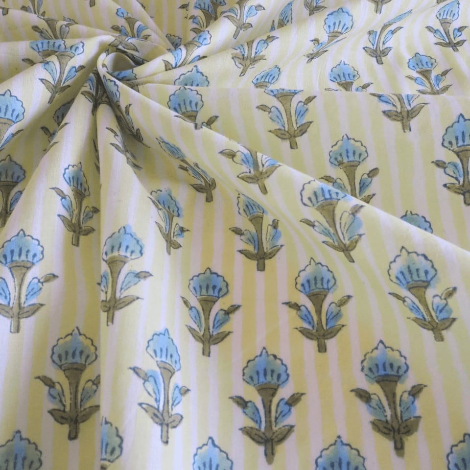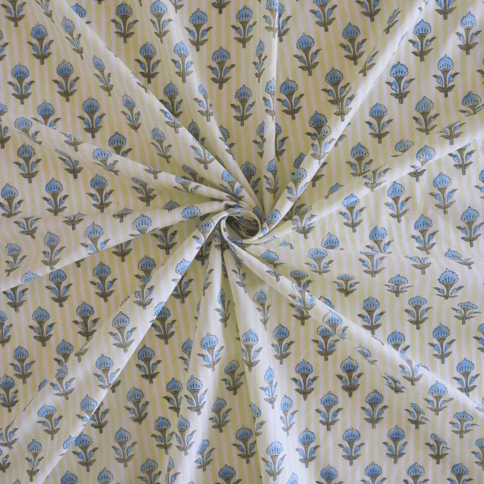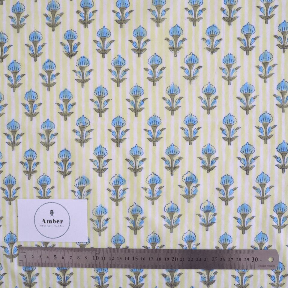 ブロックプリント生地【50cm単位】インド綿 ストライプ・小花柄 イエロー×水色 #54220-YL1