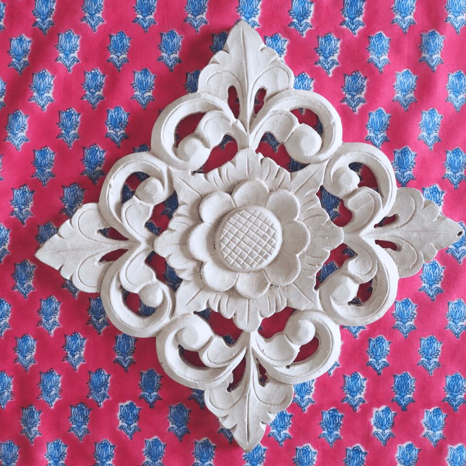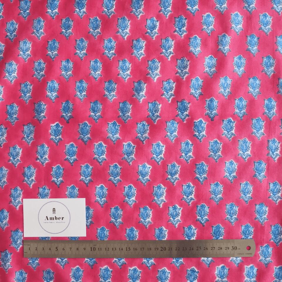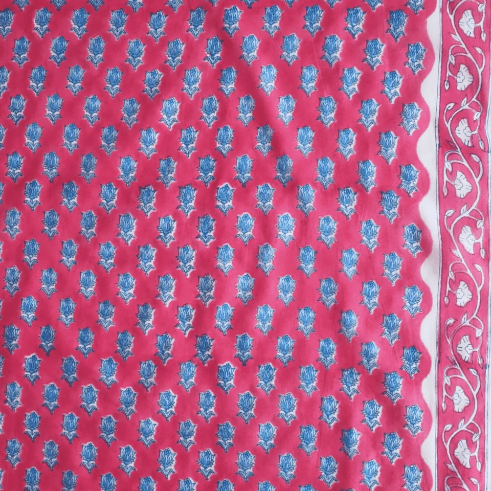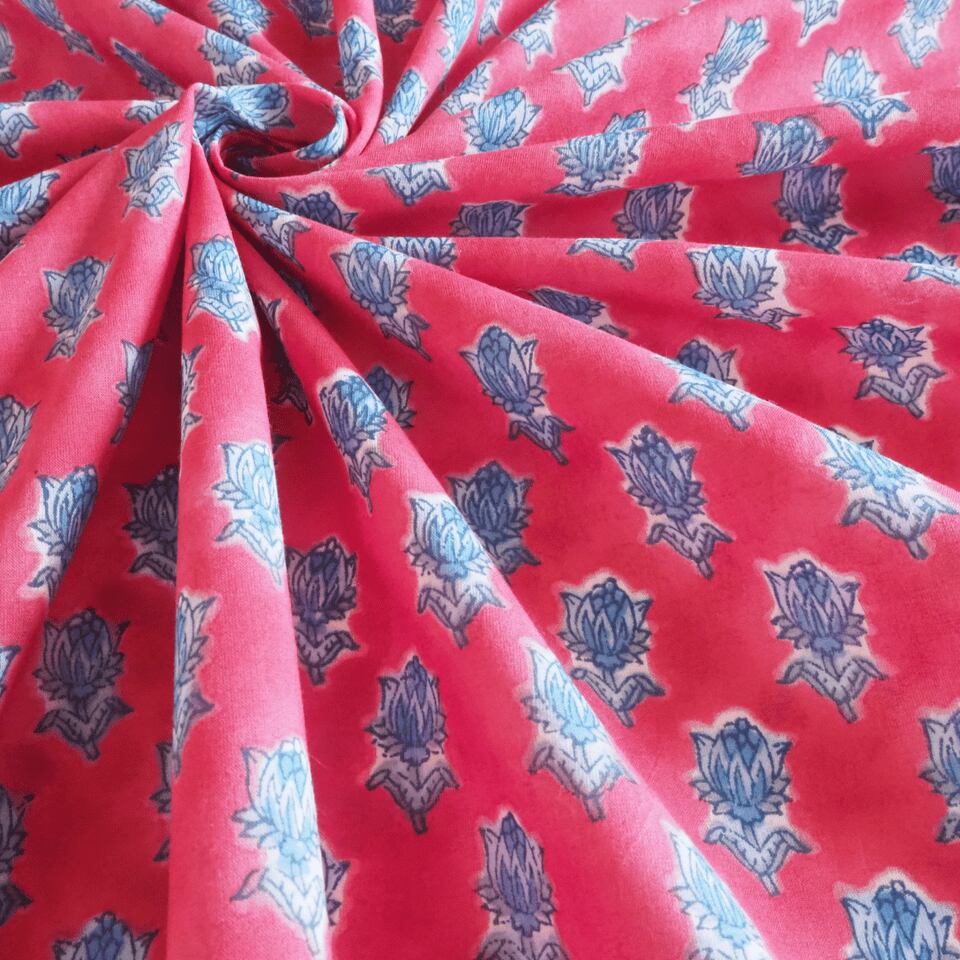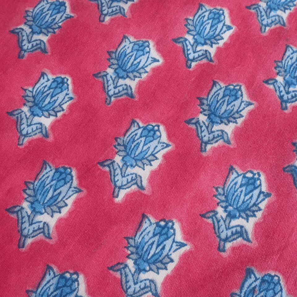 ハンドブロックプリントと呼ばれるインドのジャイプール地方に古くから伝わる伝統的な技法で、木彫りのスタンプで色を何度も重ね、全ての工程がインドの職人さんの手作業によって仕上がるAll Handmadeの生地です。