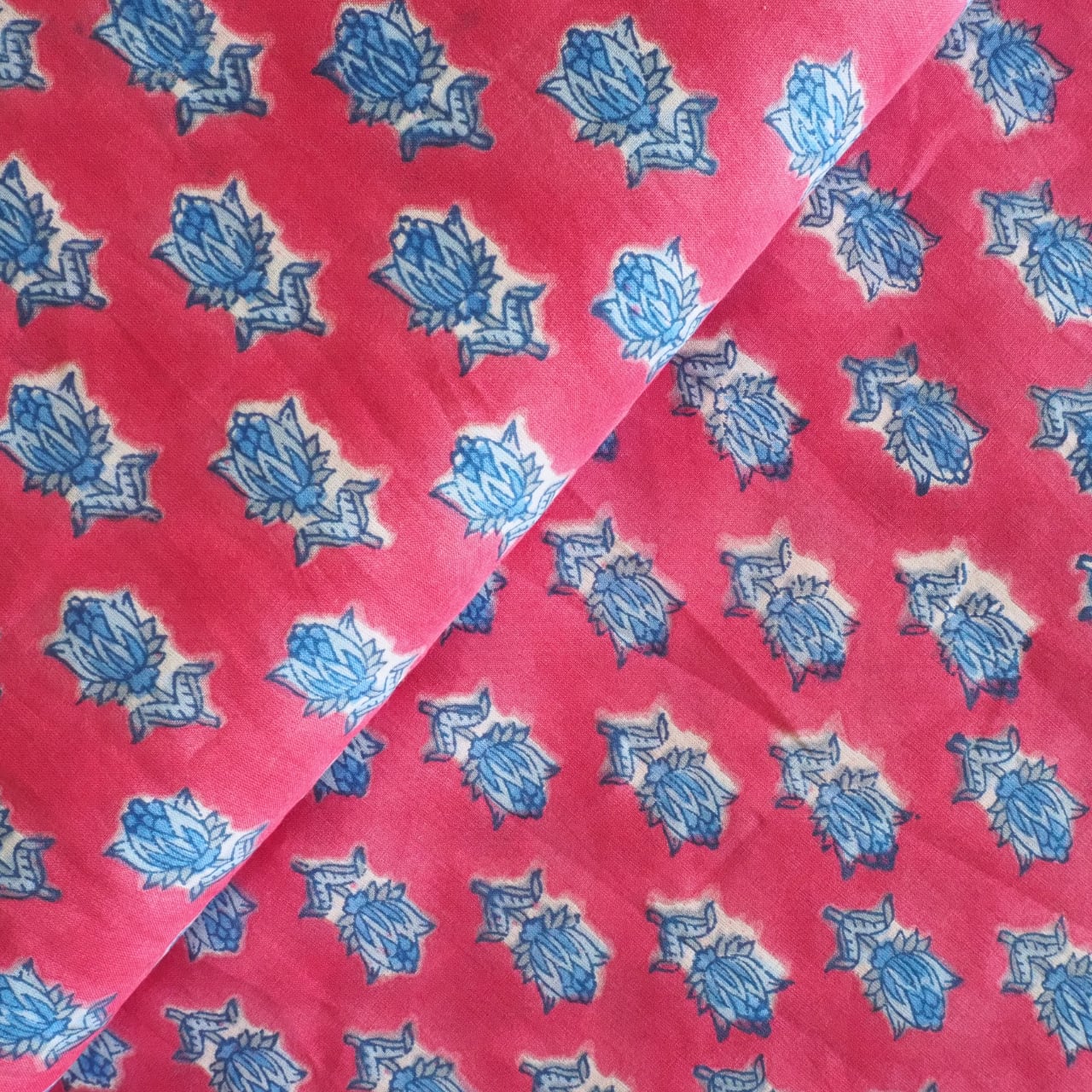 ブロックプリント生地【50cm単位】インド綿 片耳デザイン付き 小花柄 白×赤×水色 #55323-RD2