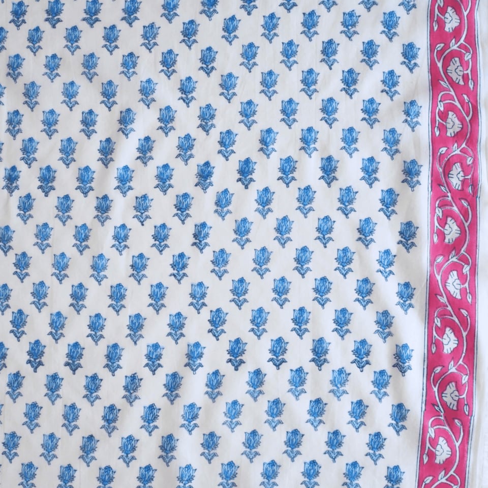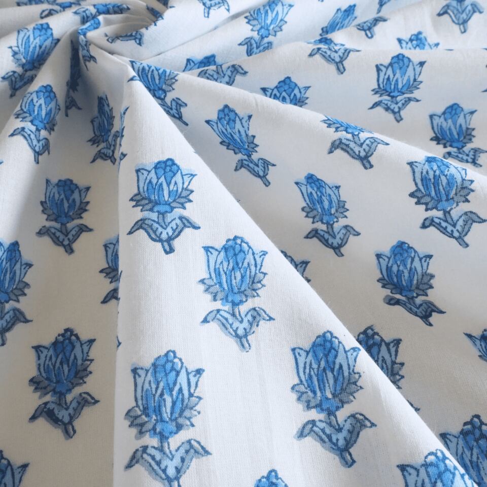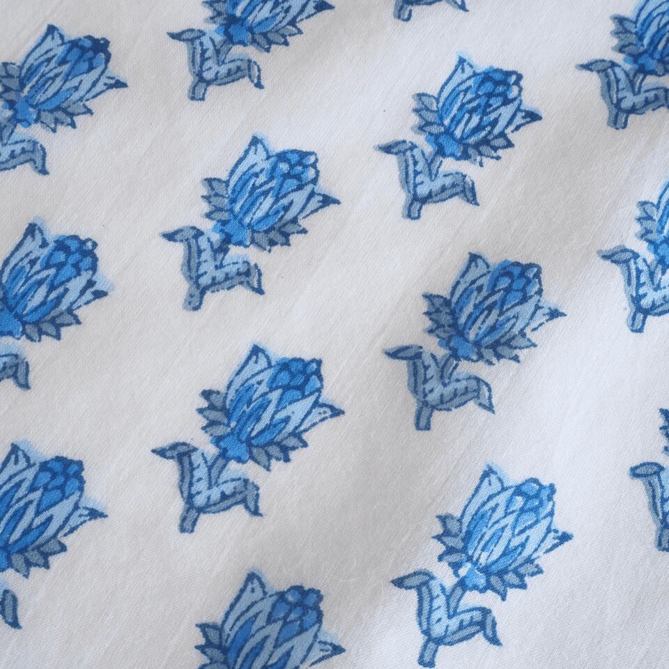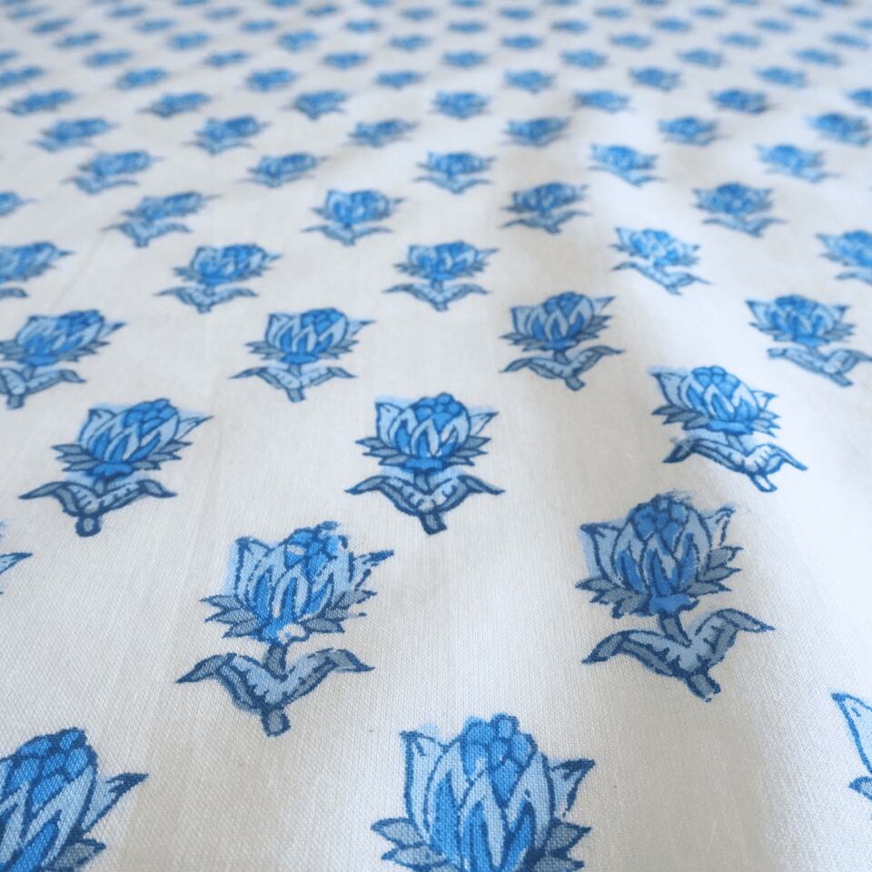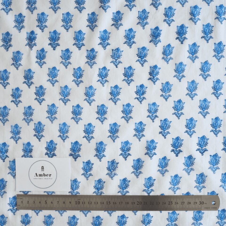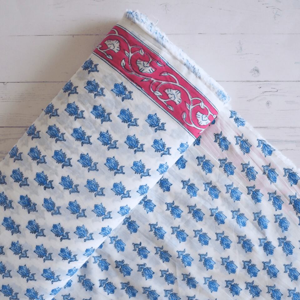 ブロックプリント生地【50cm単位】インド綿 片耳デザイン付き 小花柄 白×水色 #55123-WT2