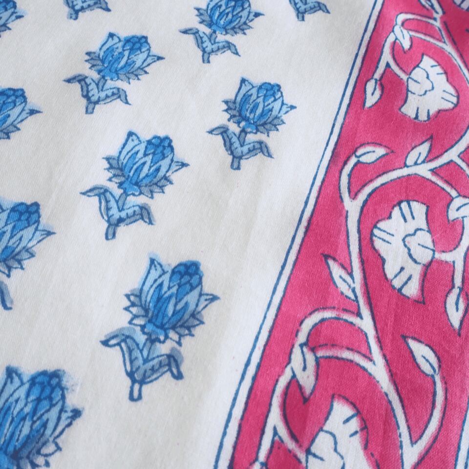 ハンドブロックプリントと呼ばれるインドのジャイプール地方に古くから伝わる伝統的な技法で、木彫りのスタンプで色を何度も重ね、全ての工程がインドの職人さんの手作業によって仕上がるAll Handmadeの生地です。