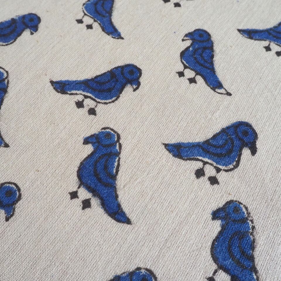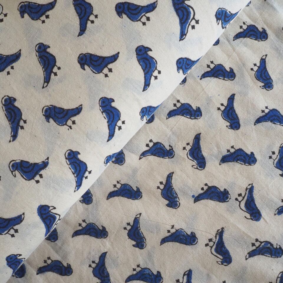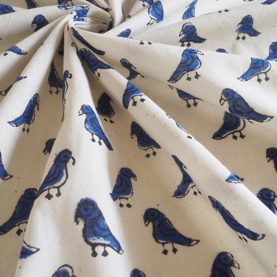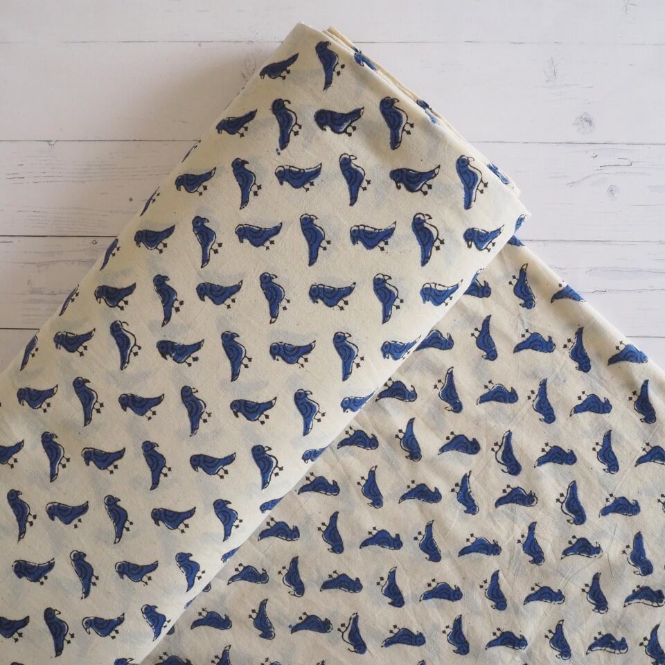 ブロックプリント生地【50cm単位】インド綿 小鳥柄 生成り×ブルー #55510-WT1