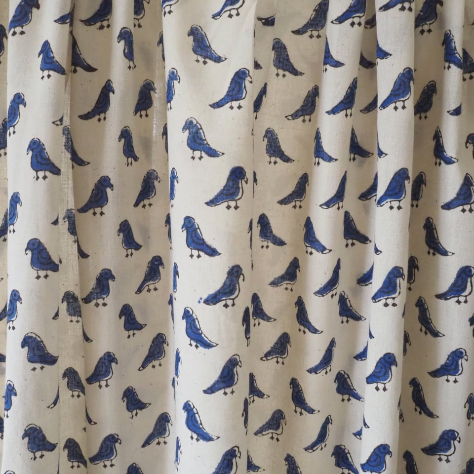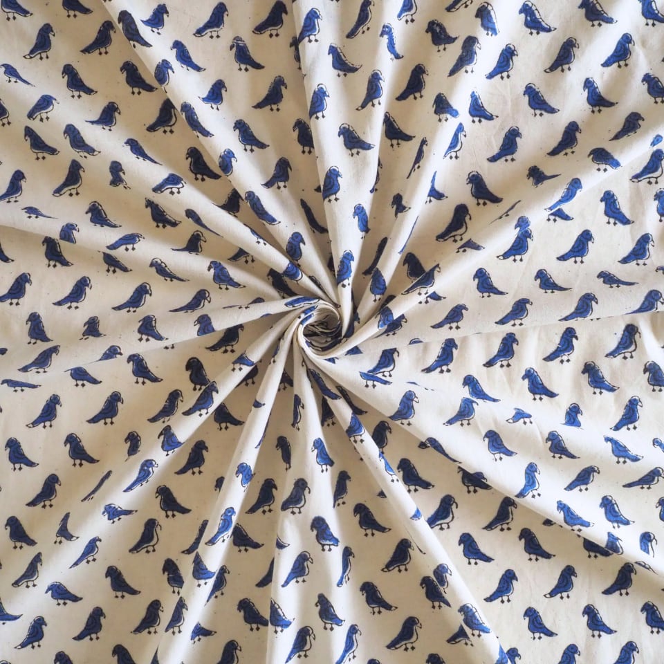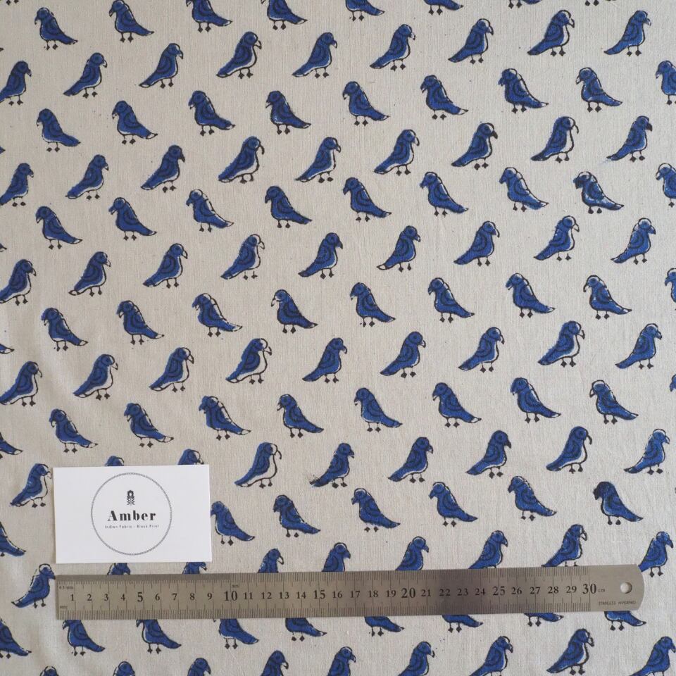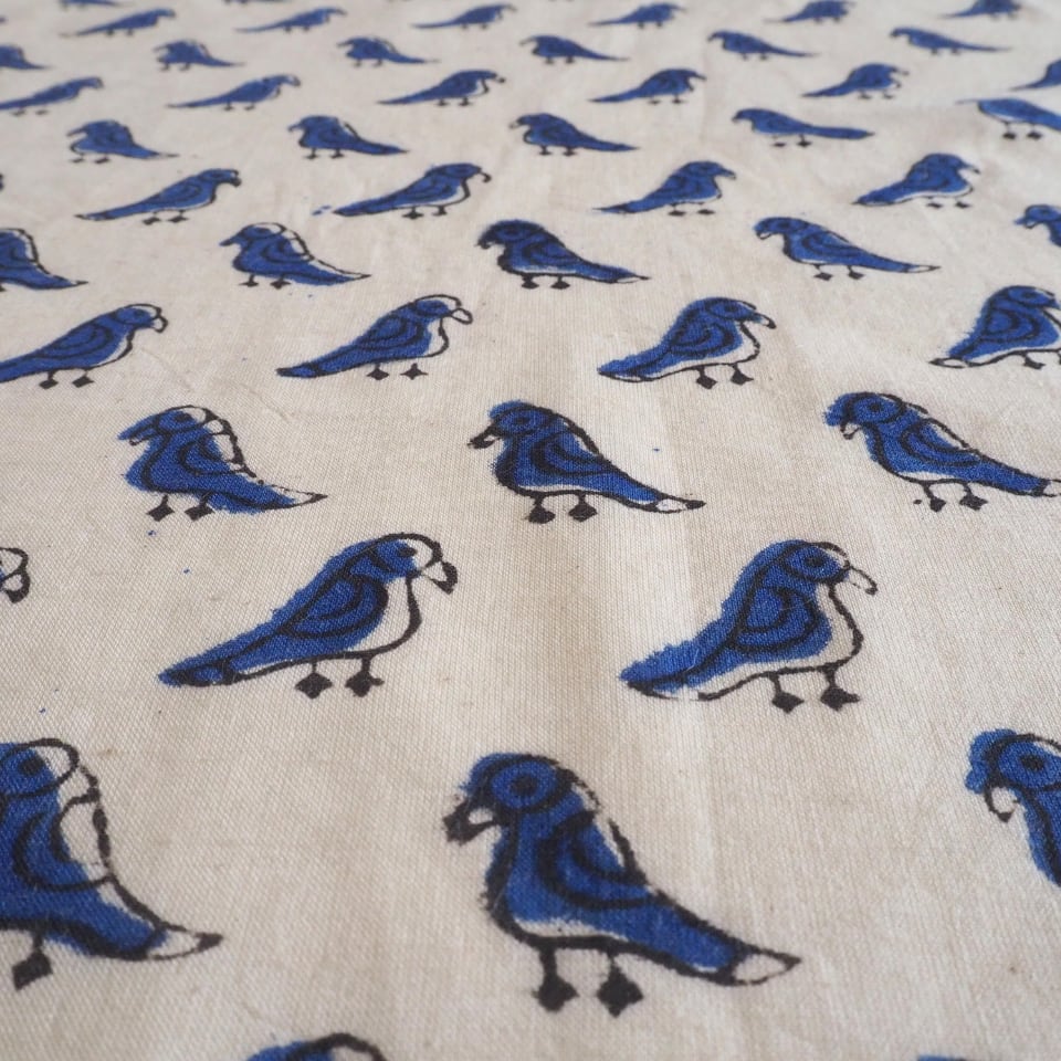 ブロックプリント生地【50cm単位】インド綿 小鳥柄 生成り×ブルー #55510-WT1