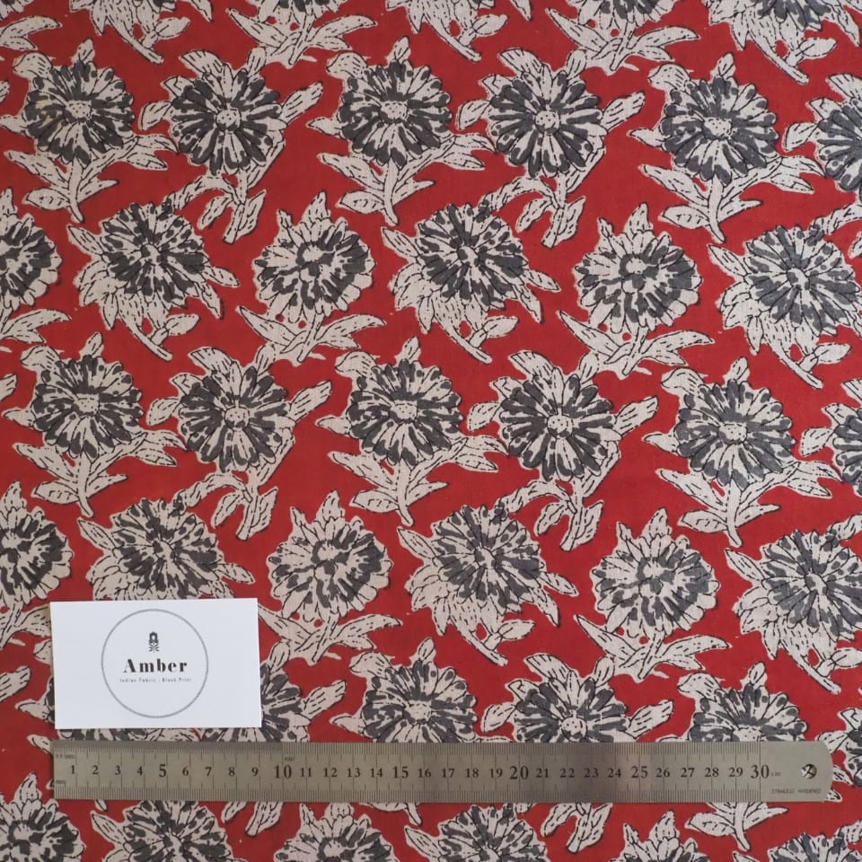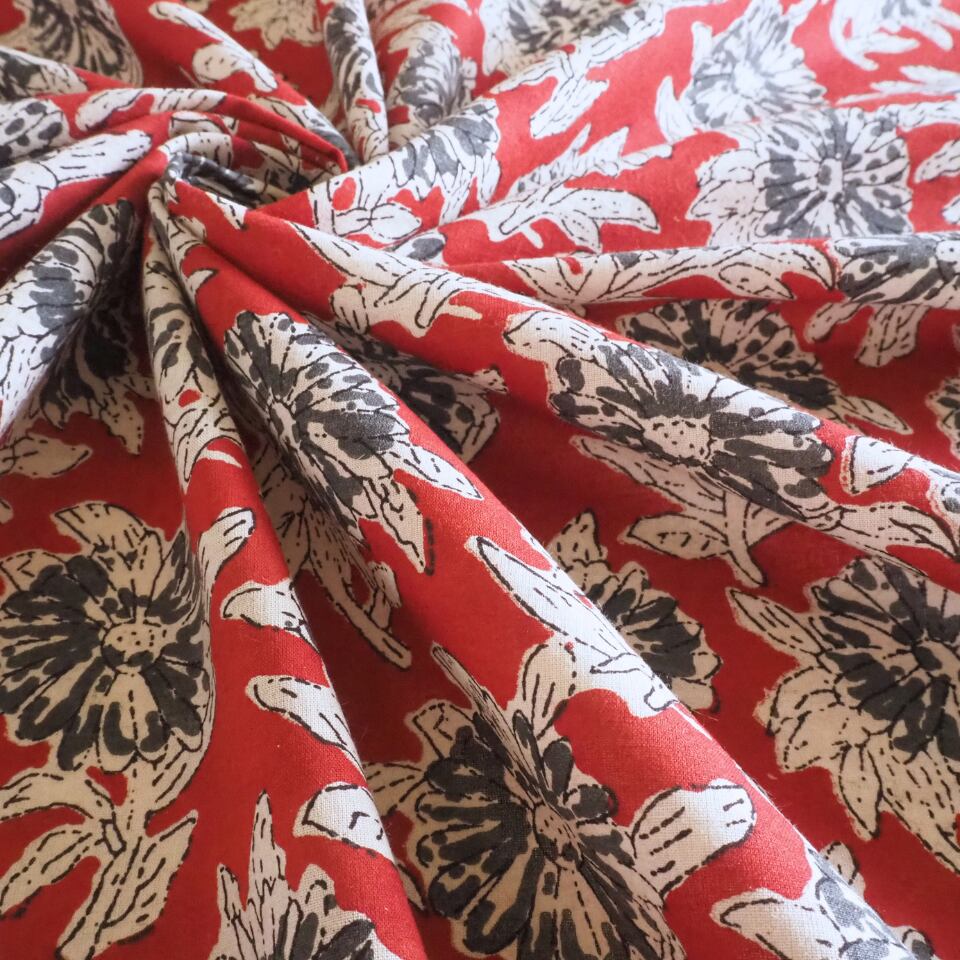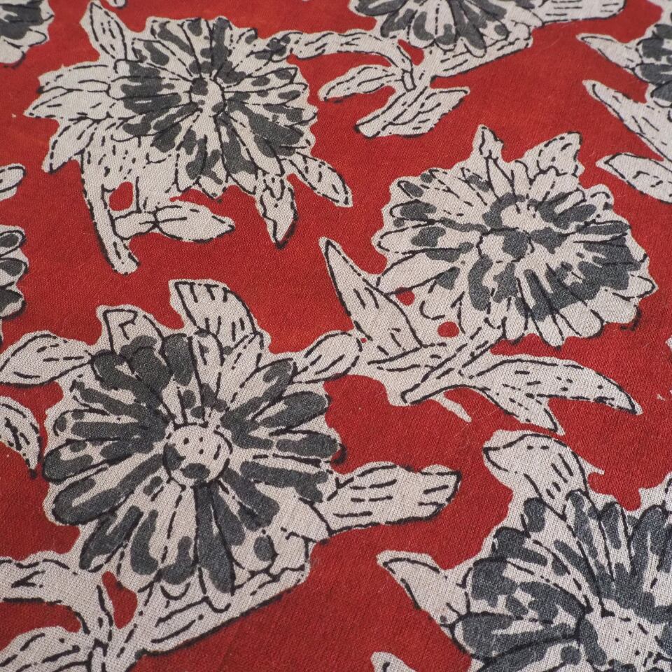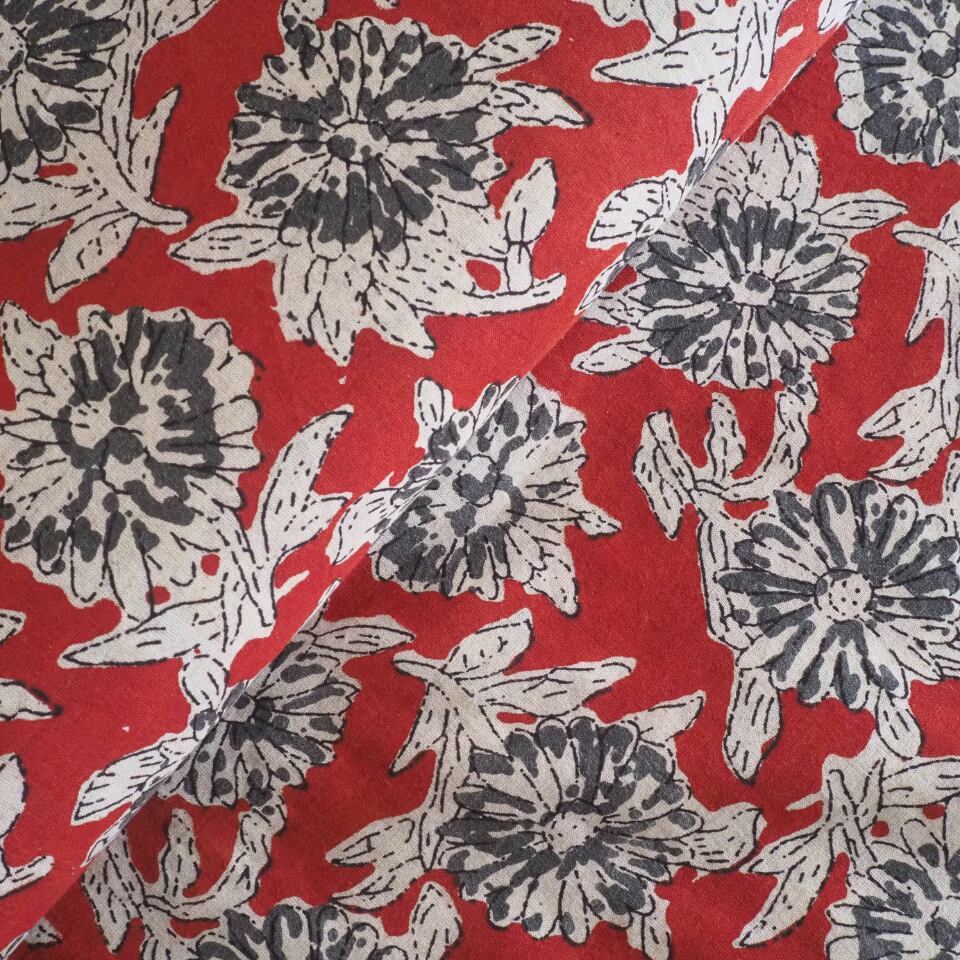 ブロックプリント生地【50cm単位】インド綿 花柄 赤×グレー #56010-RD1
