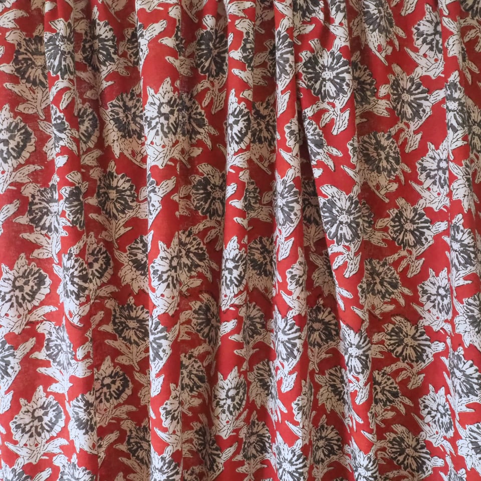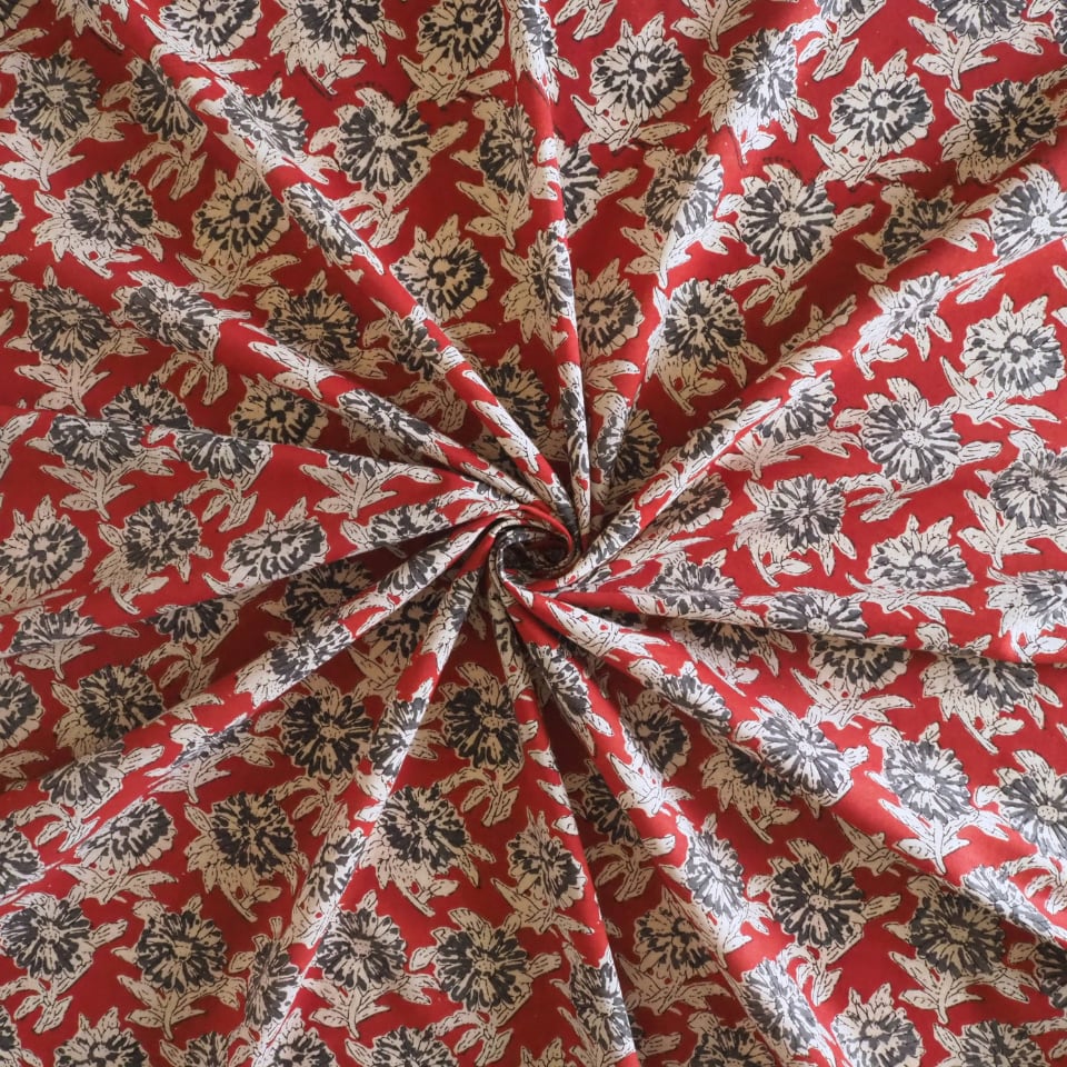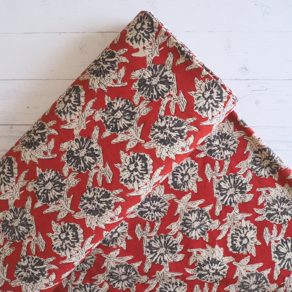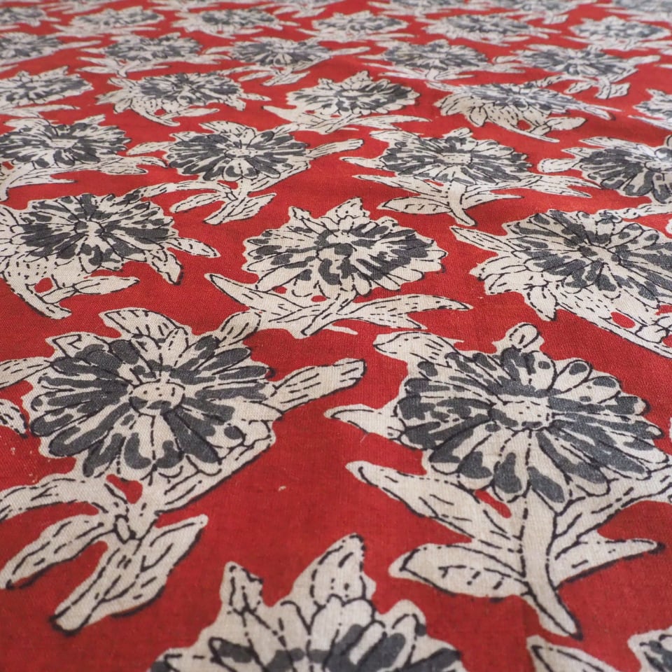 ブロックプリント生地【50cm単位】インド綿 花柄 赤×グレー #56010-RD1