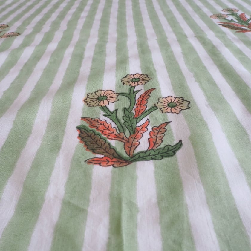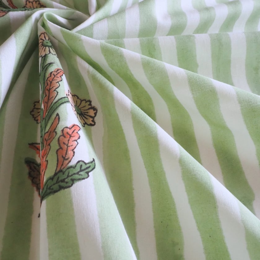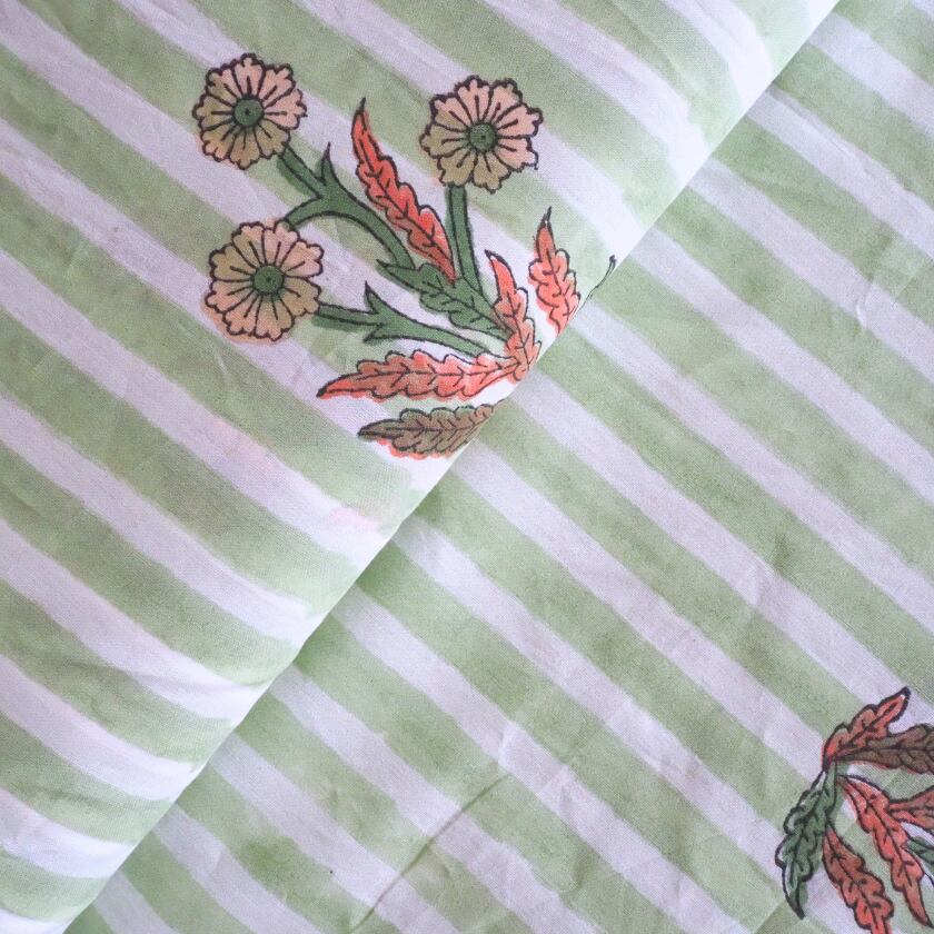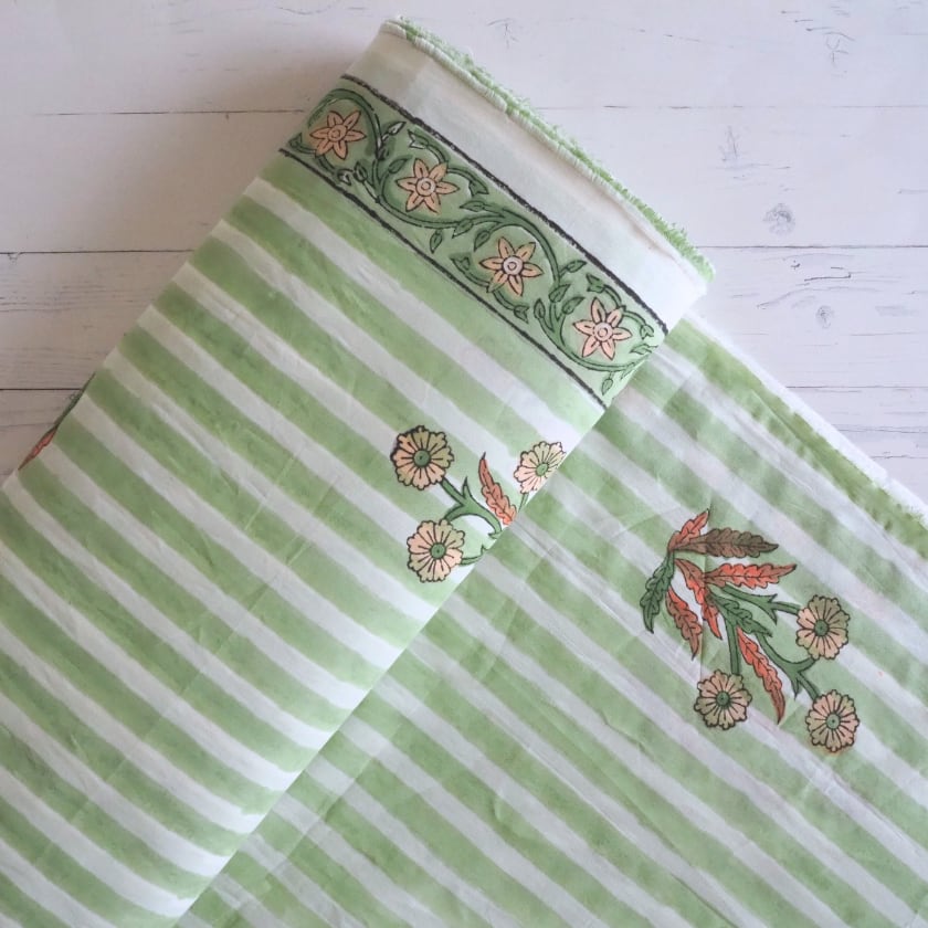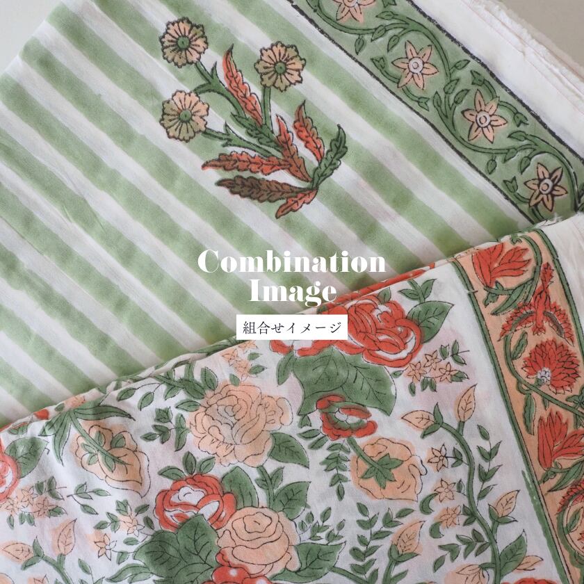 ブロックプリント生地【50cm単位】インド綿 片耳デザイン付き ストライプ/花柄 白×グリーン×オレンジ #56726-WT2