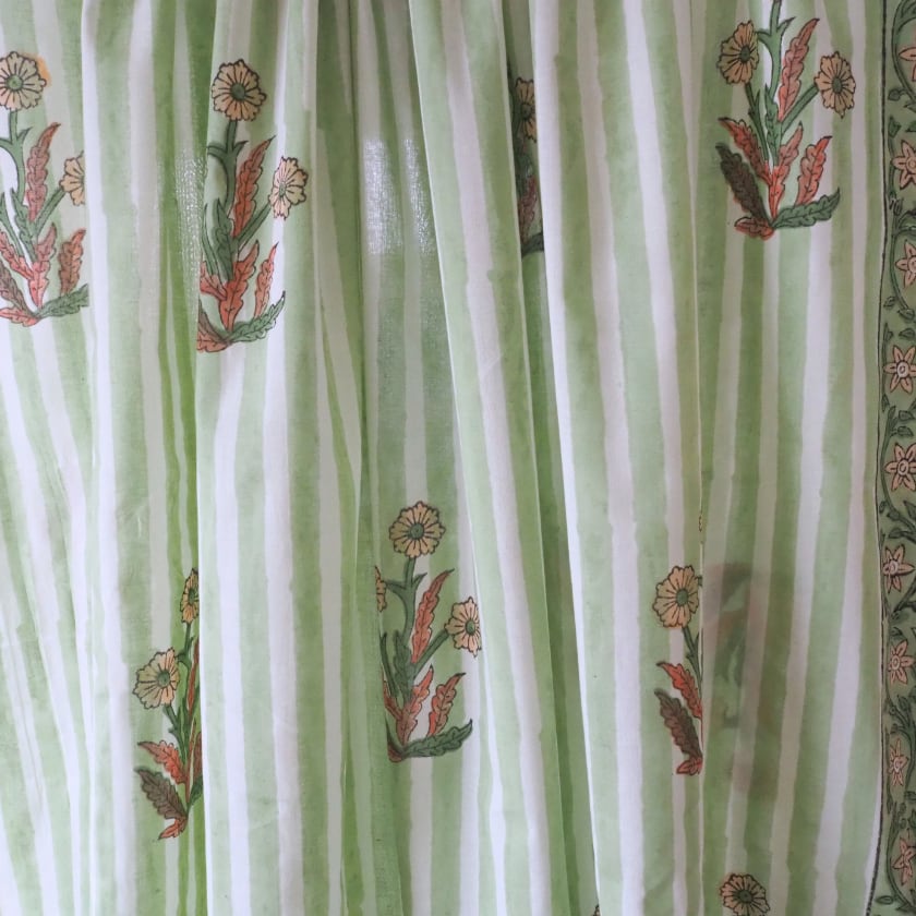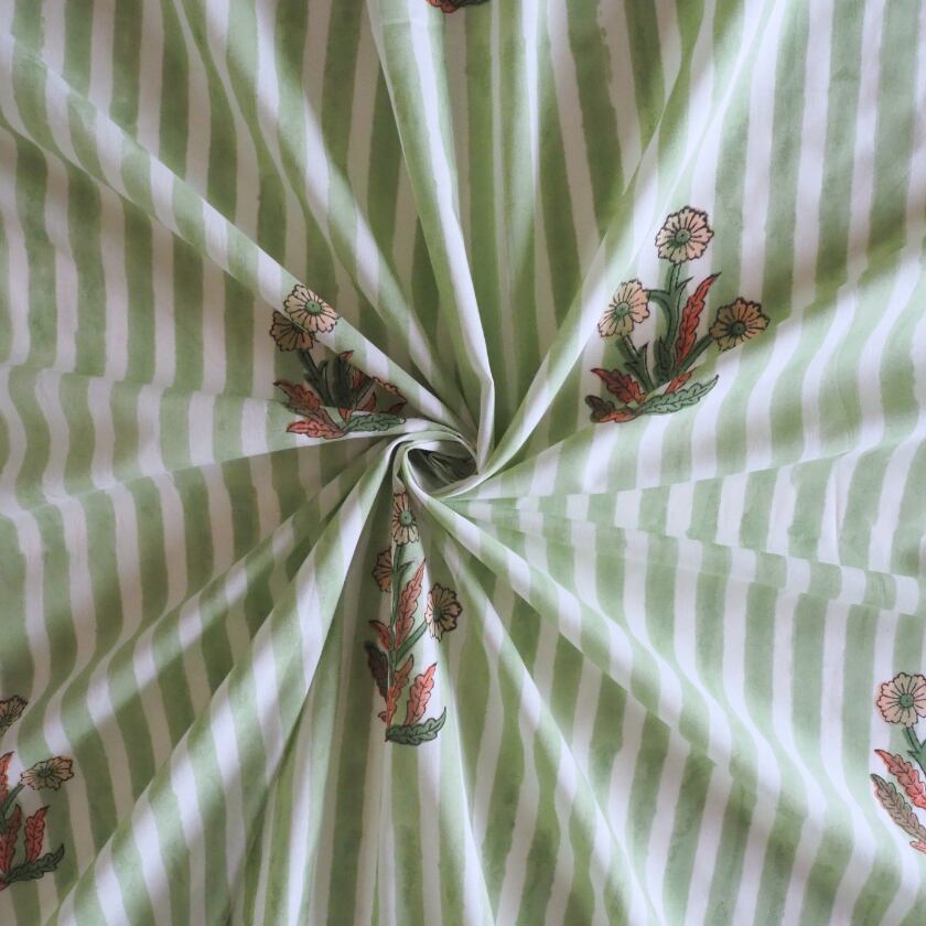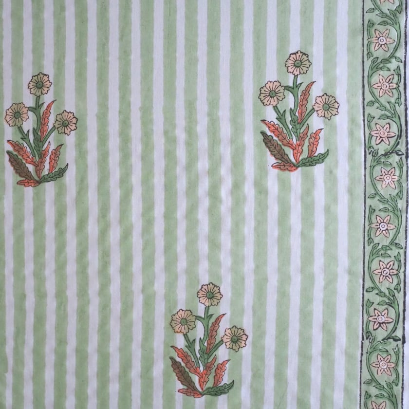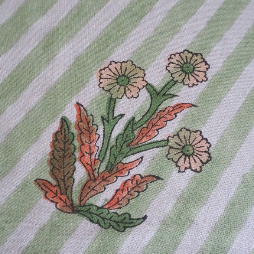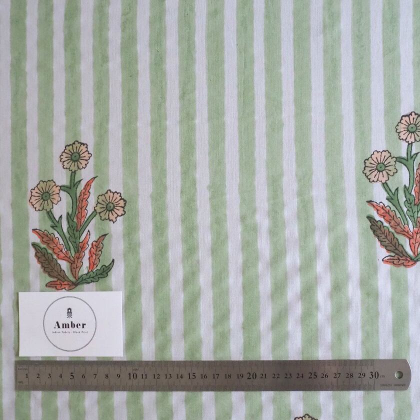ブロックプリント生地【50cm単位】インド綿 片耳デザイン付き ストライプ/花柄 白×グリーン×オレンジ #56726-WT2