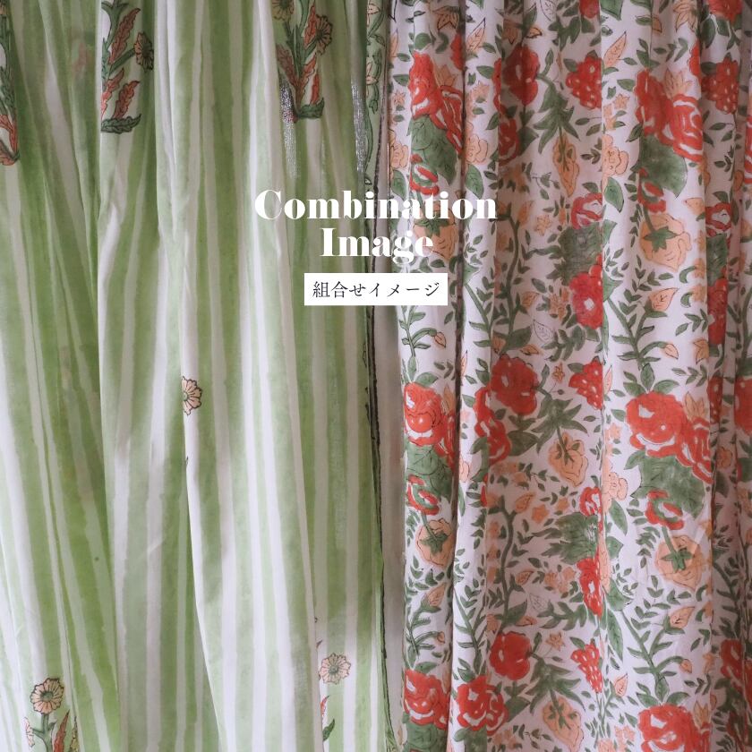 ハンドブロックプリントと呼ばれるインドのジャイプール地方に古くから伝わる伝統的な技法で、木彫りのスタンプで色を何度も重ね、全ての工程がインドの職人さんの手作業によって仕上がるAll Handmadeの生地です。