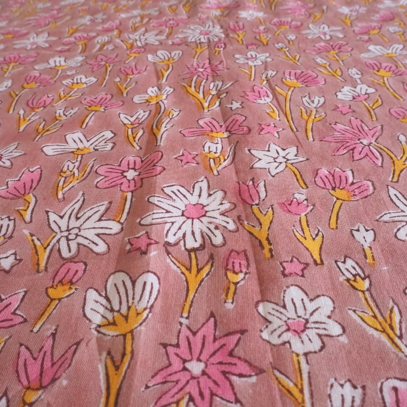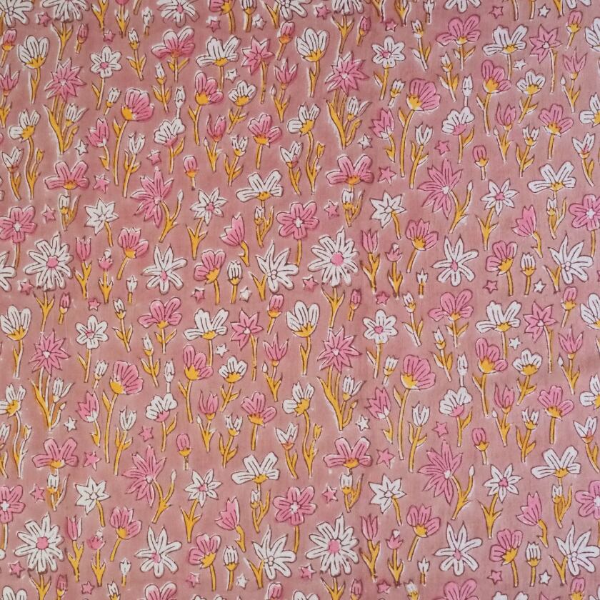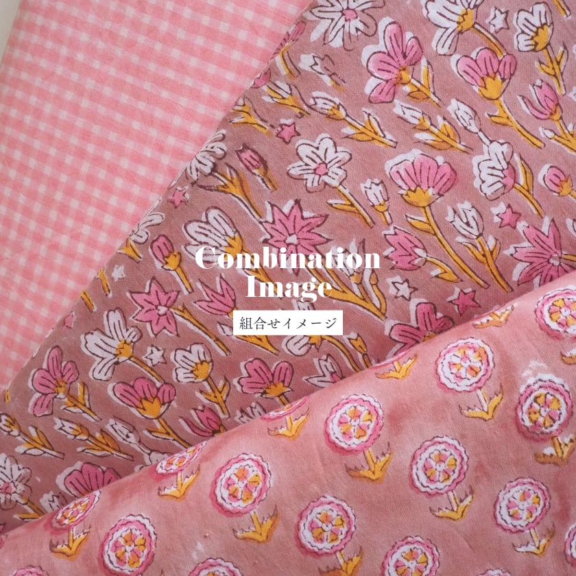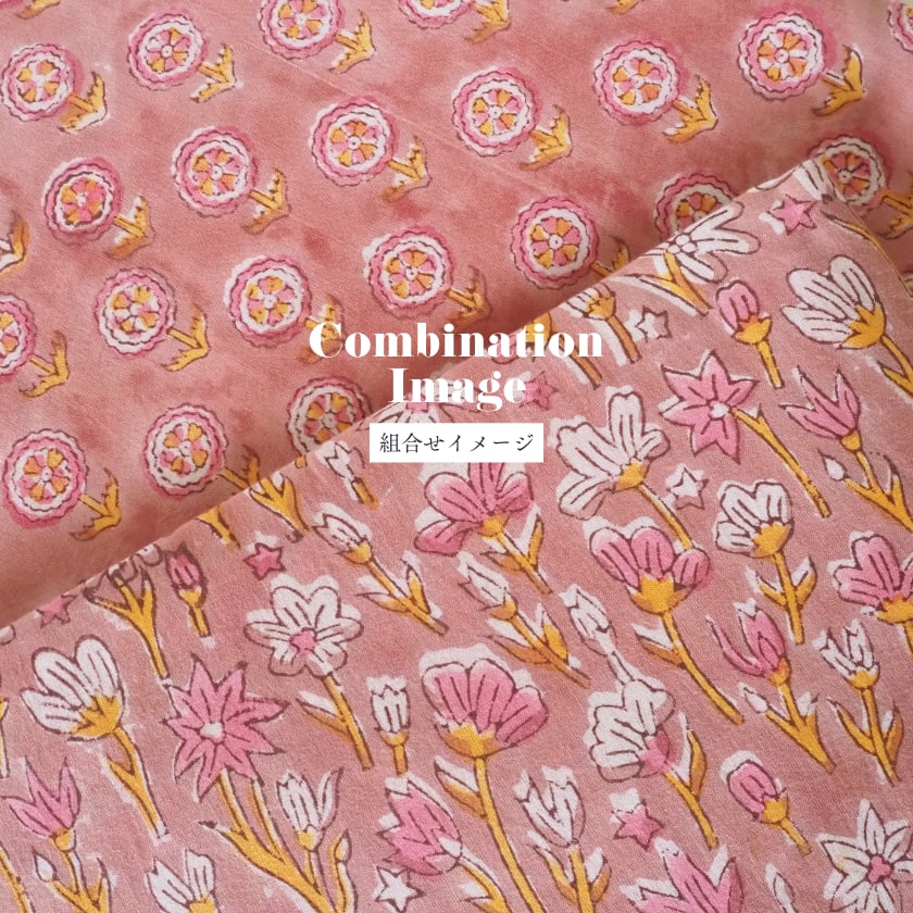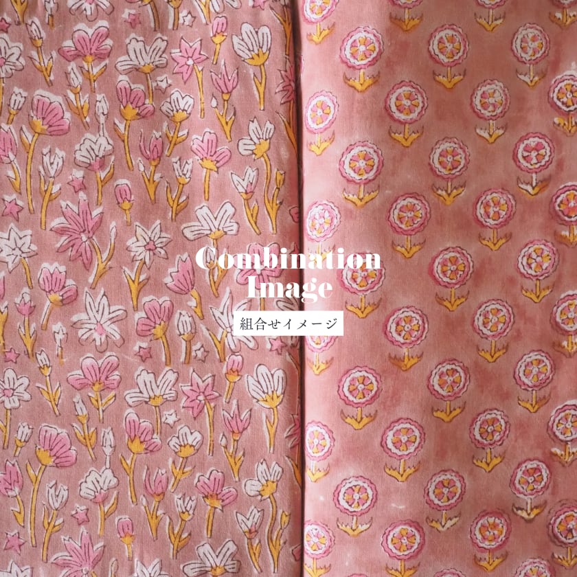ブロックプリント生地【50cm単位】インド綿 花柄 くすみピンク×イエロー×白 #56124-PK1